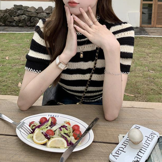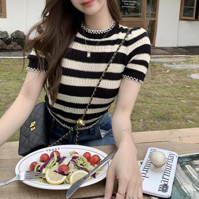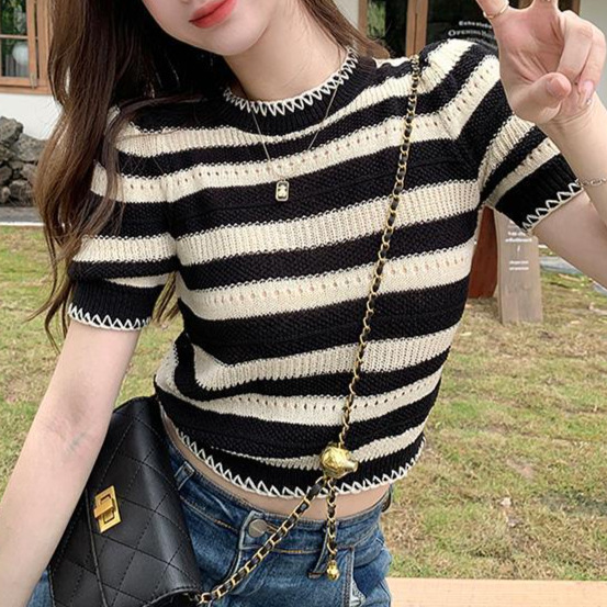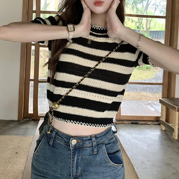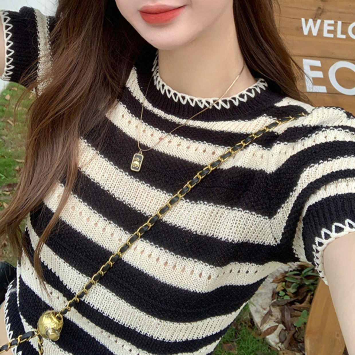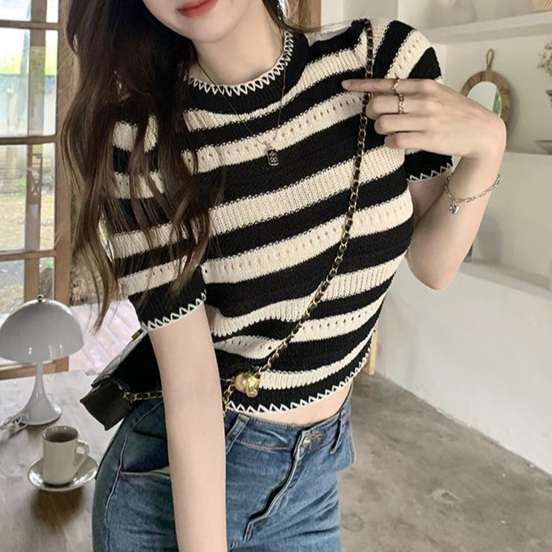 달콤한 스파이스 소녀 흑백 줄무늬 어깨 반팔 티셔츠 여성용 여름 할로우 니트웨어 니트웨어 하이 허리 섹시한 쇼트 탑스토어 가기