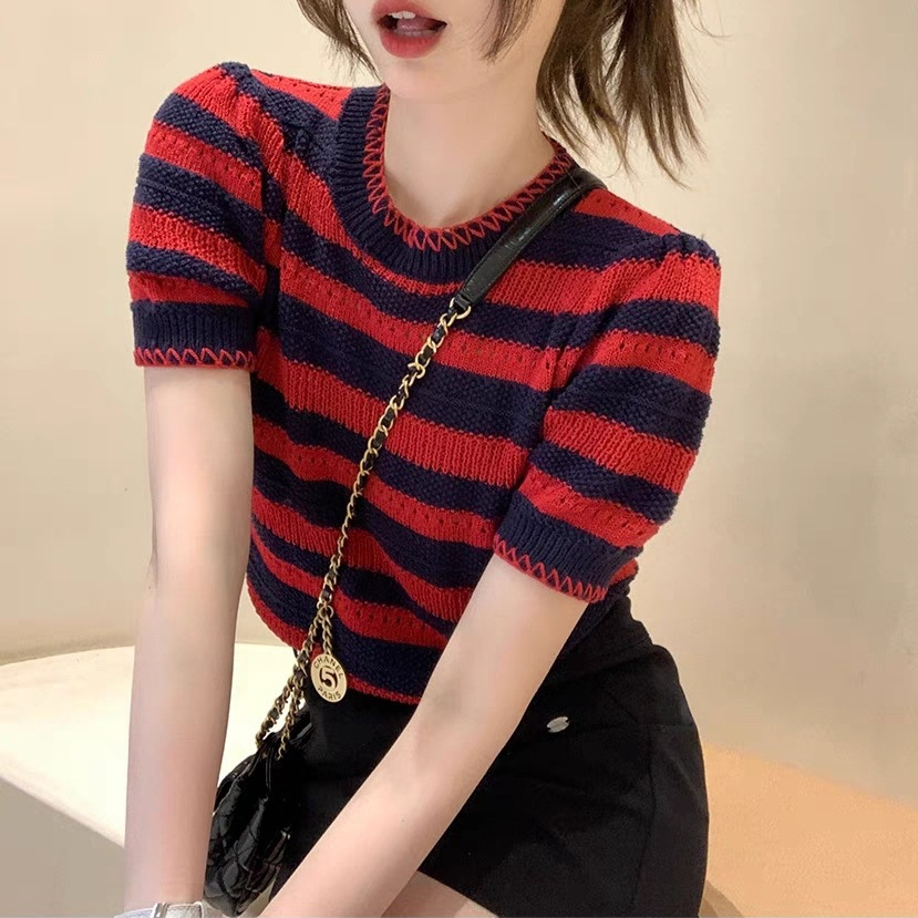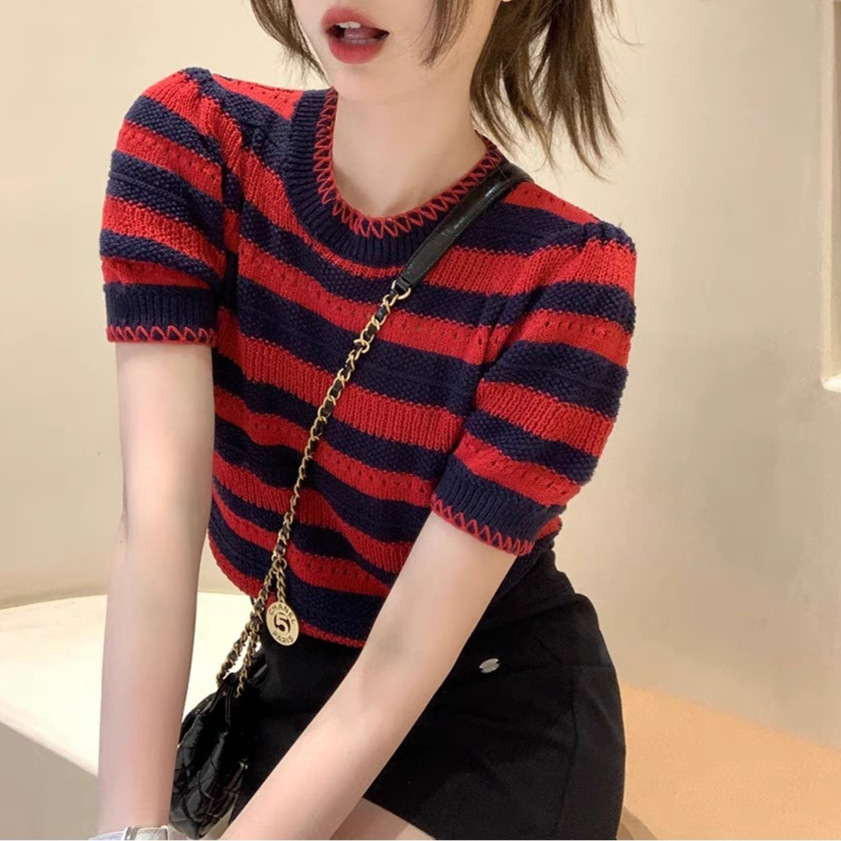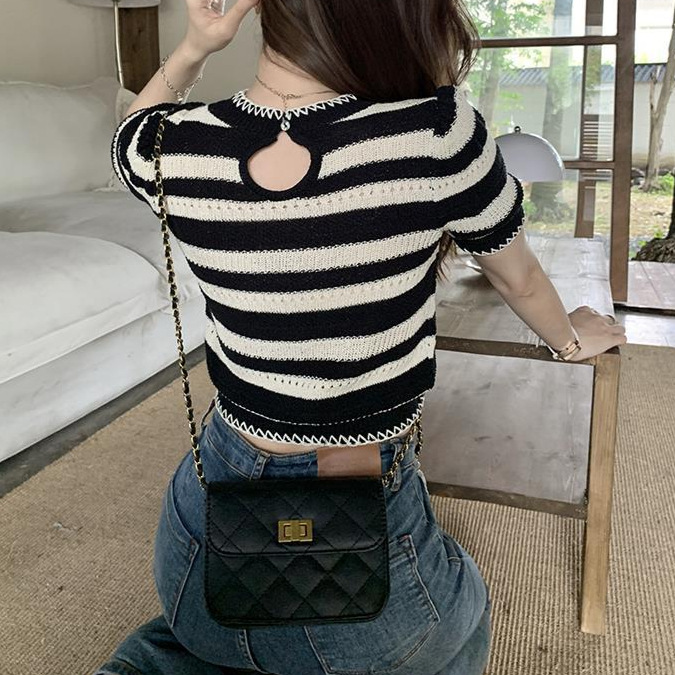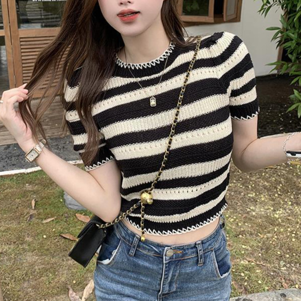 달콤한 스파이스 소녀 흑백 줄무늬 어깨 반팔 티셔츠 여성용 여름 할로우 니트웨어 니트웨어 하이 허리 섹시한 쇼트 탑