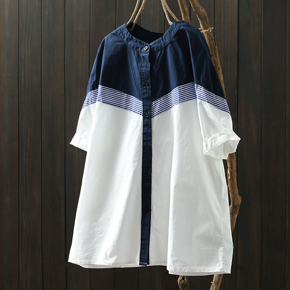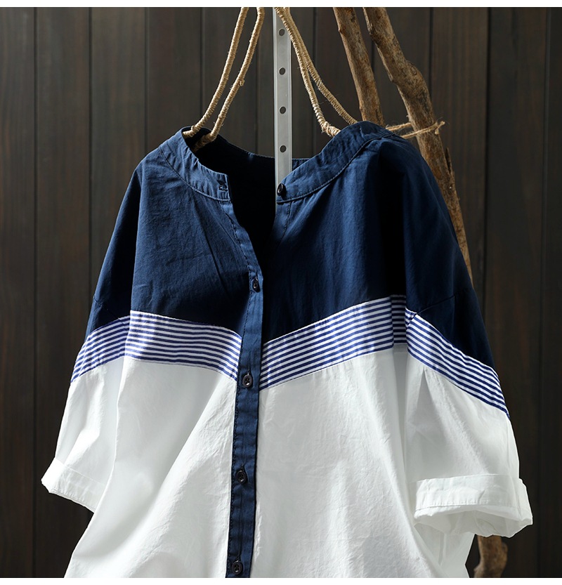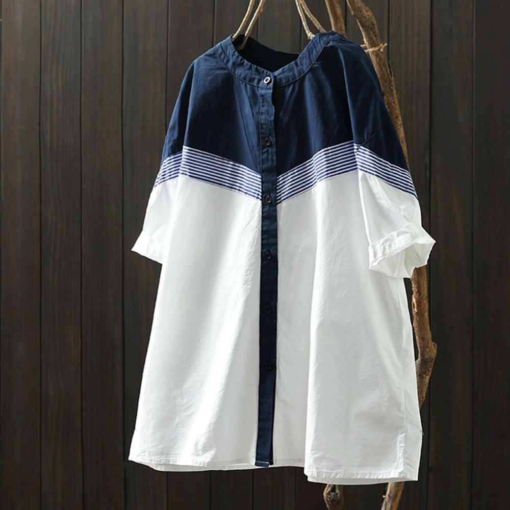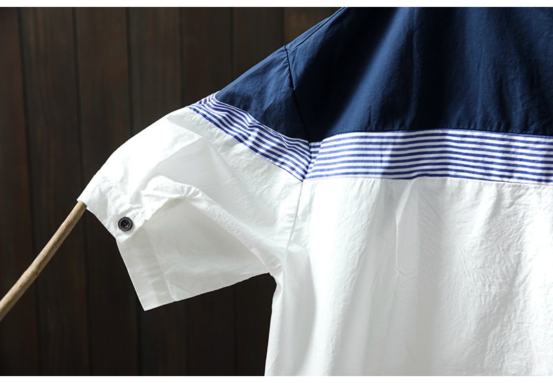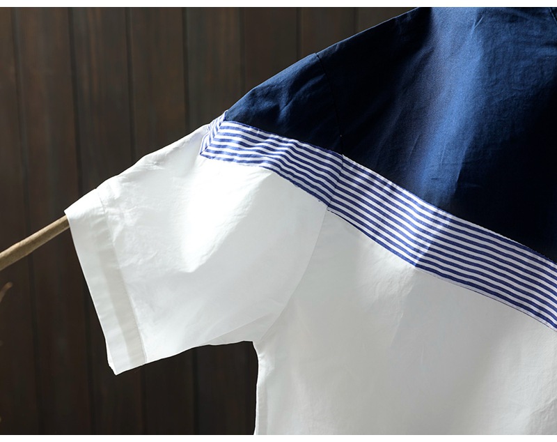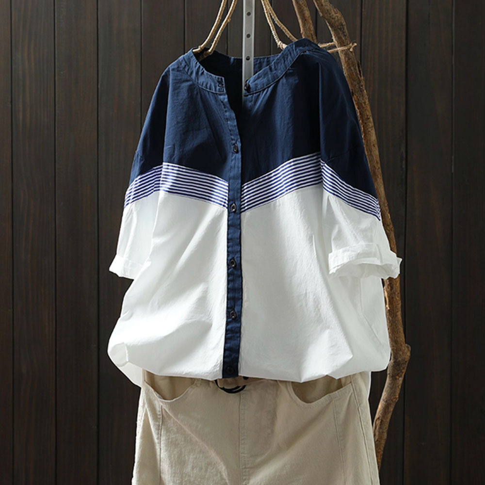 대조적 인 컬러 스티칭 칼라 스트라이프 셔츠 여성 디자인 센스 반팔 봄과 여름 느슨한 캐주얼 우아한 반팔 탑스토어 가기