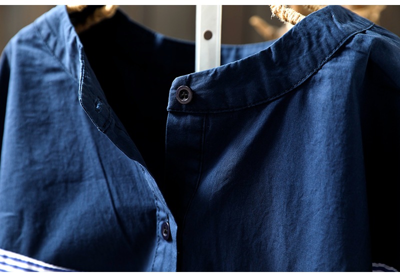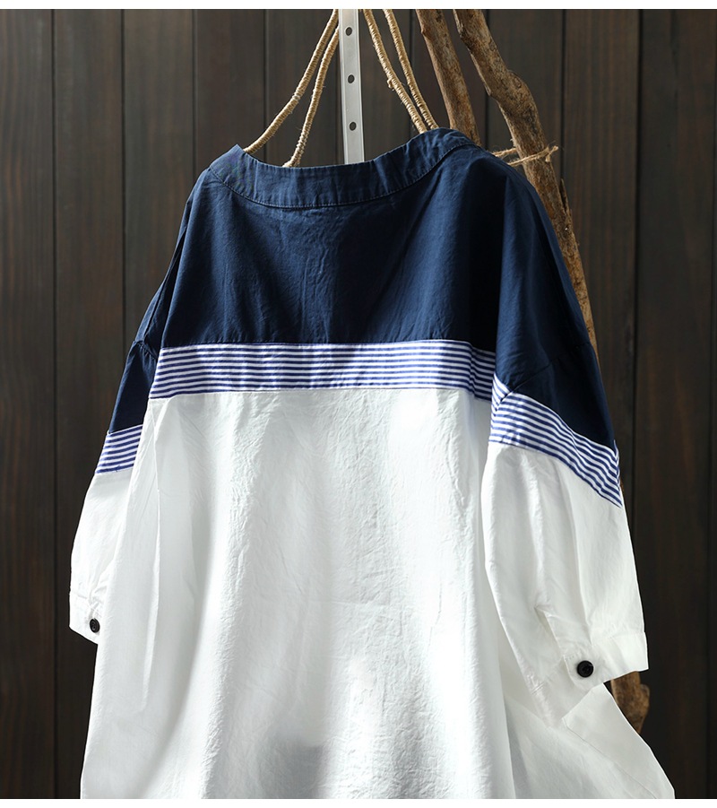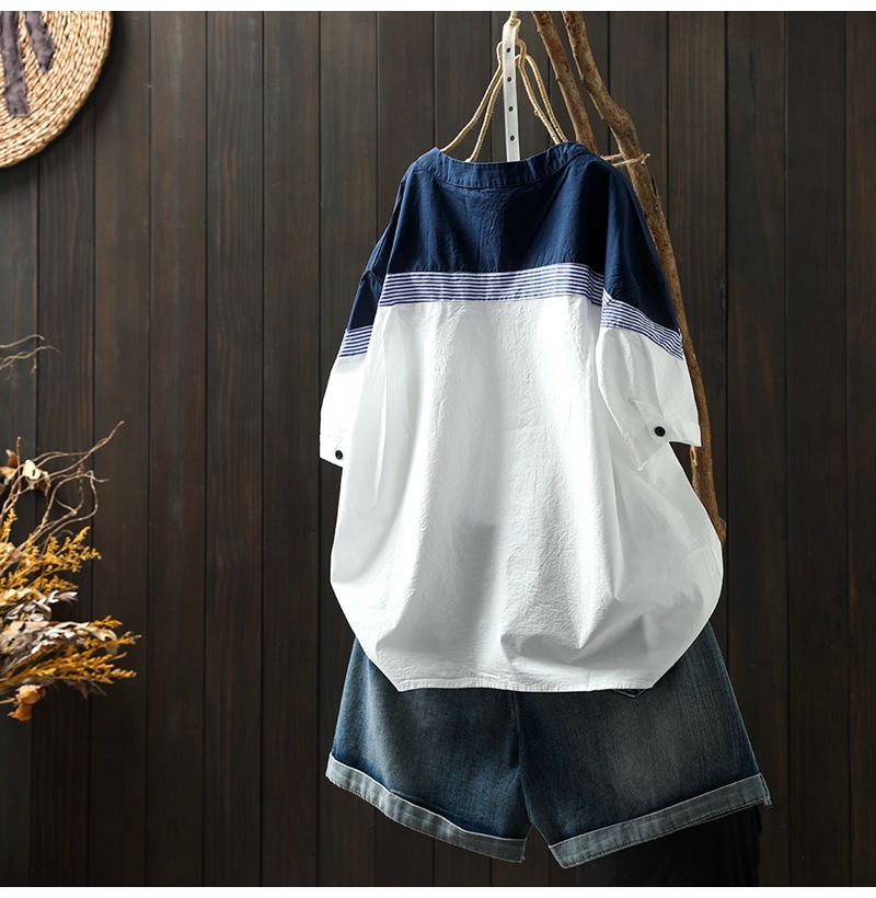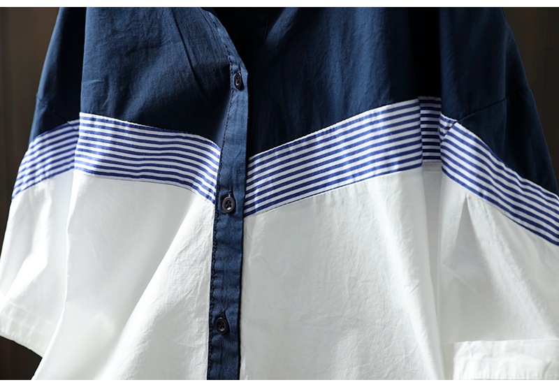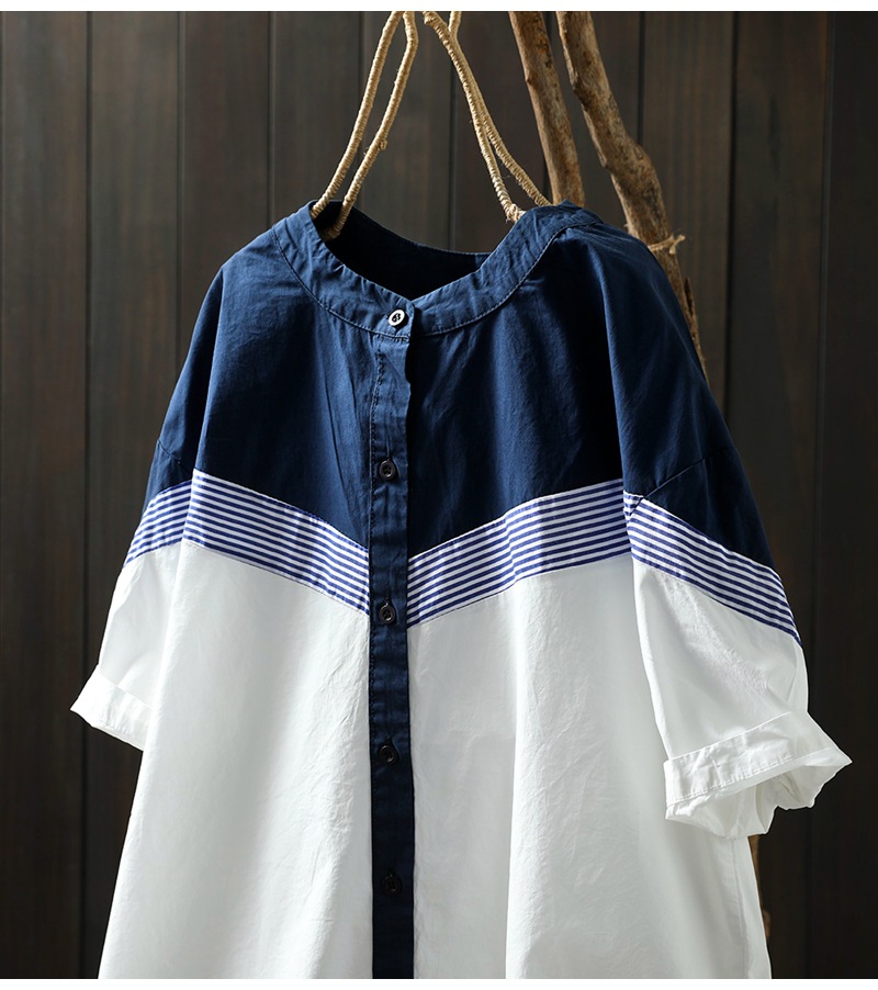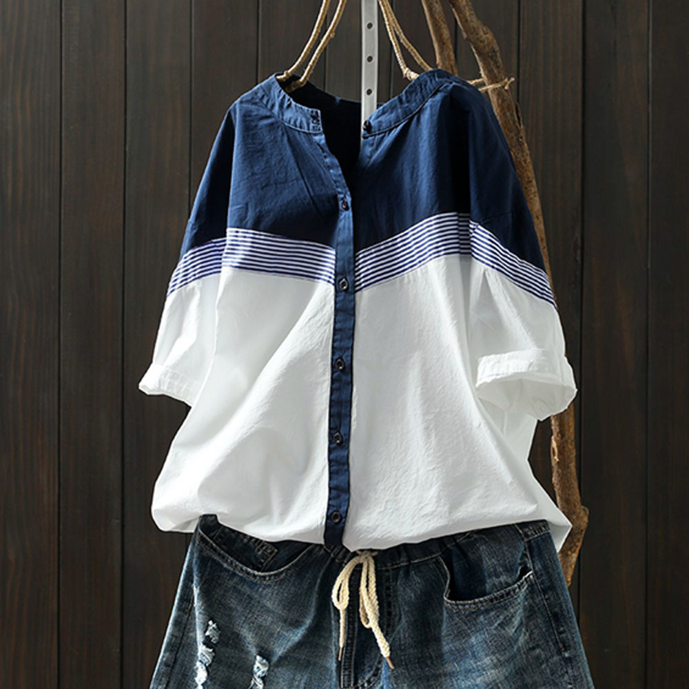 대조적 인 컬러 스티칭 칼라 스트라이프 셔츠 여성 디자인 센스 반팔 봄과 여름 느슨한 캐주얼 우아한 반팔 탑스토어 가기