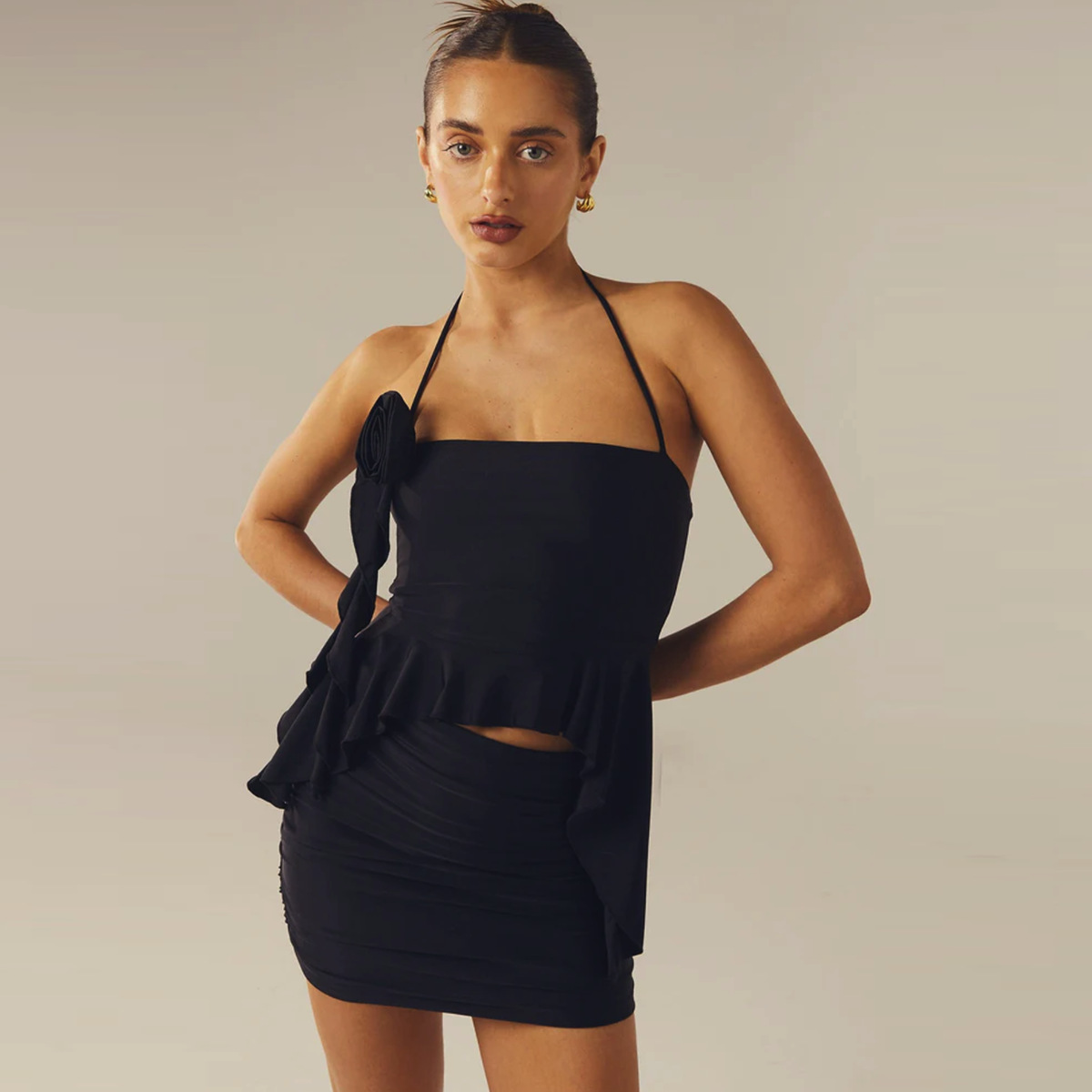欧美热销夏季爆款时尚套装,露脐系带小背心+修身褶皱包臀裙,单边花朵飘带设计,更显时尚大气;