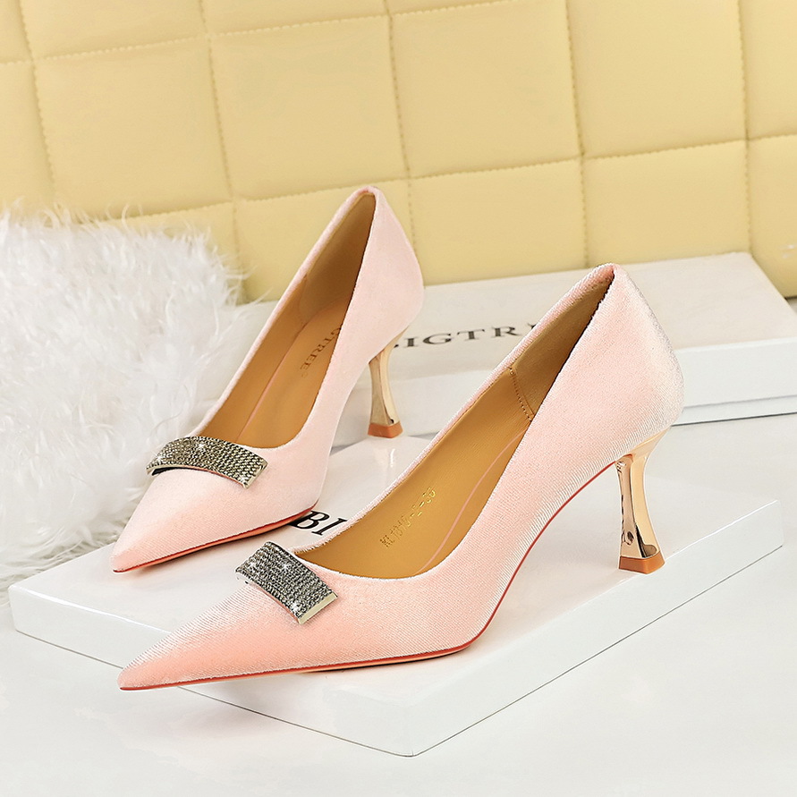 1818-K67 유럽과 미국 스타일의 연회 여성 신발 하이힐 스웨이드 얕은 입 뾰족한 금속 모조 다이아몬드 장식 하이힐 신발