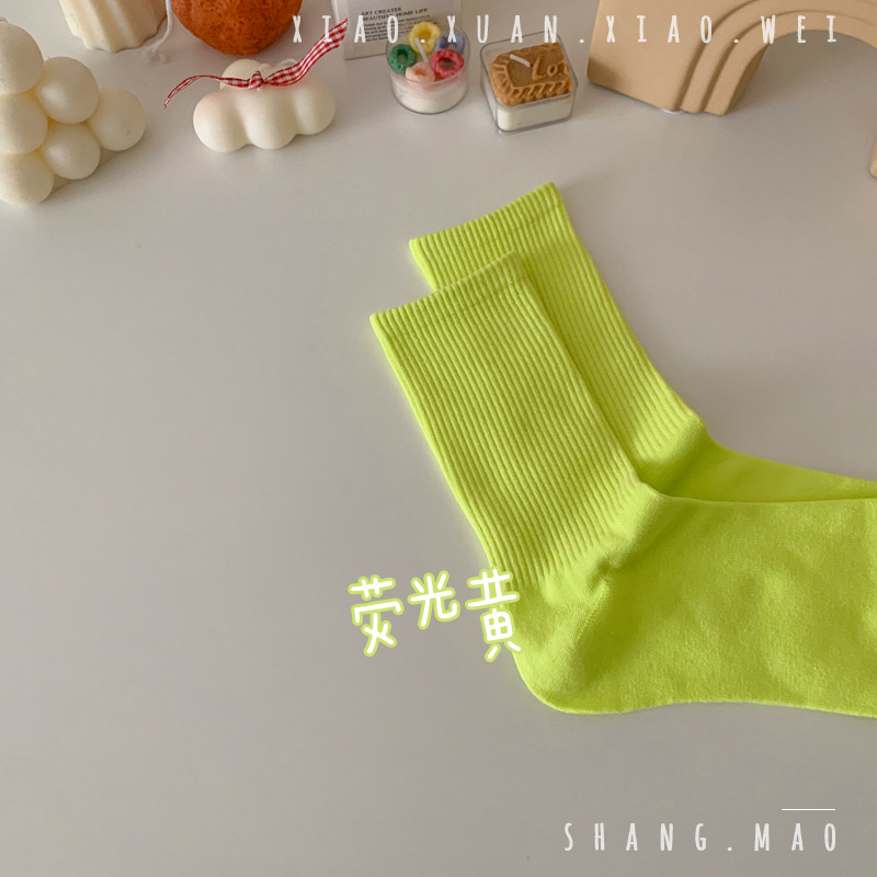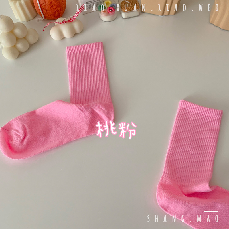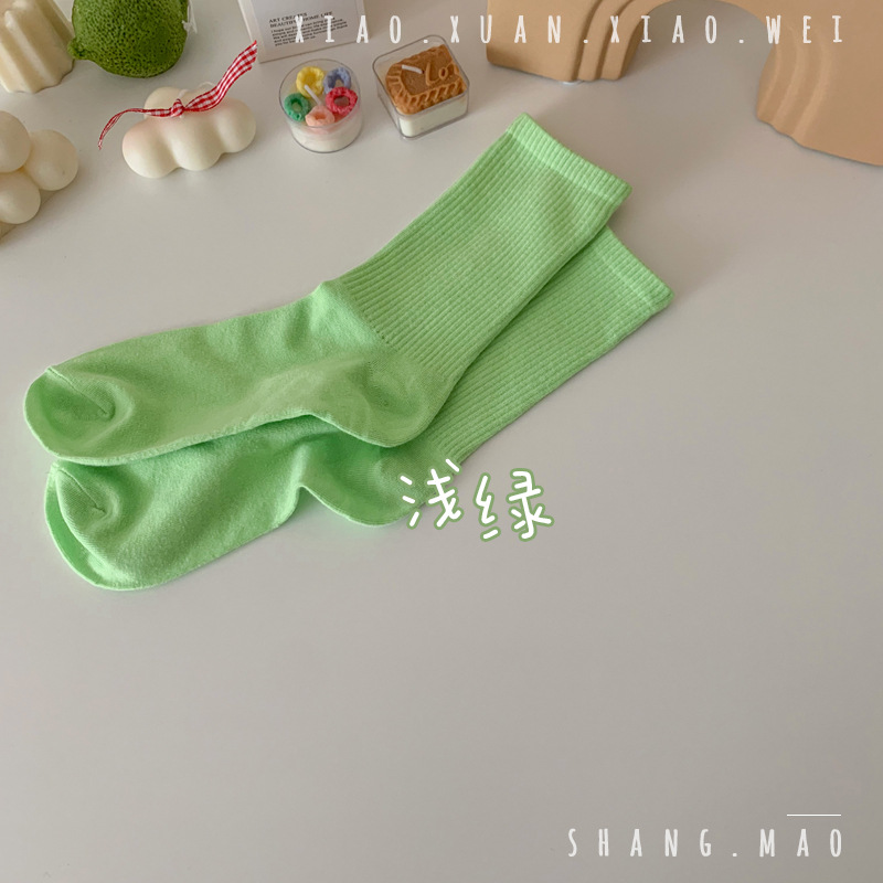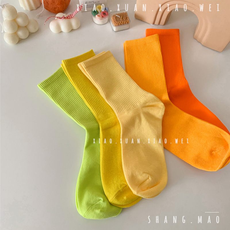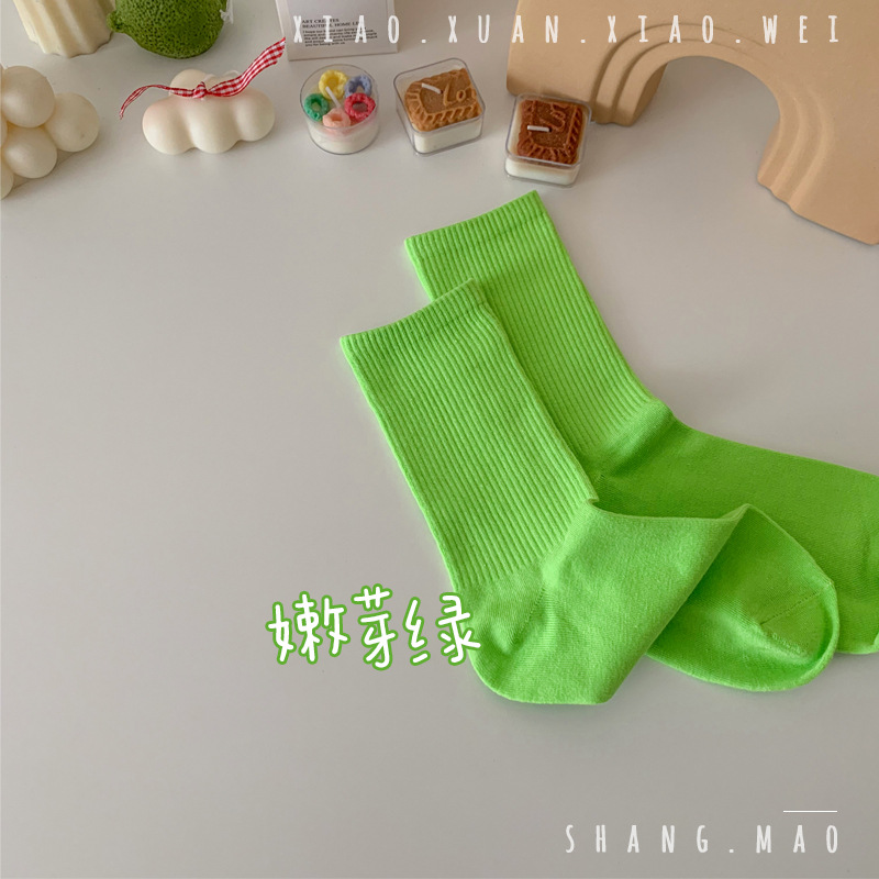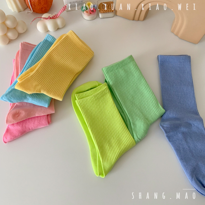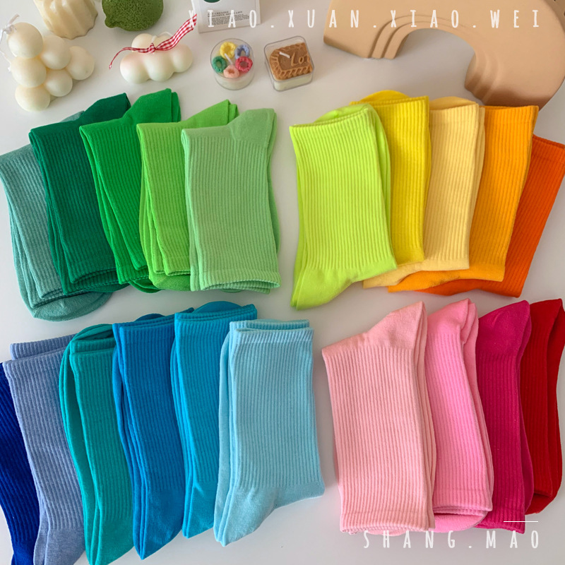 캔디 컬러 양말 여성용 Ins 트렌디 한 높은 고무 솔리드 컬러 미드 양말 다채로운 플랫 코튼 통기성 외부 착용 스택 양말