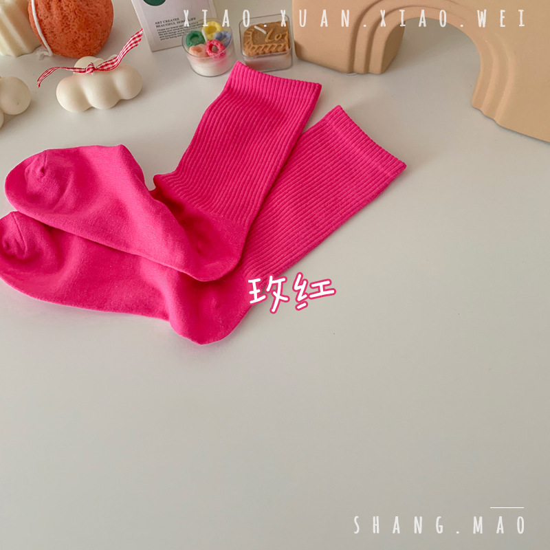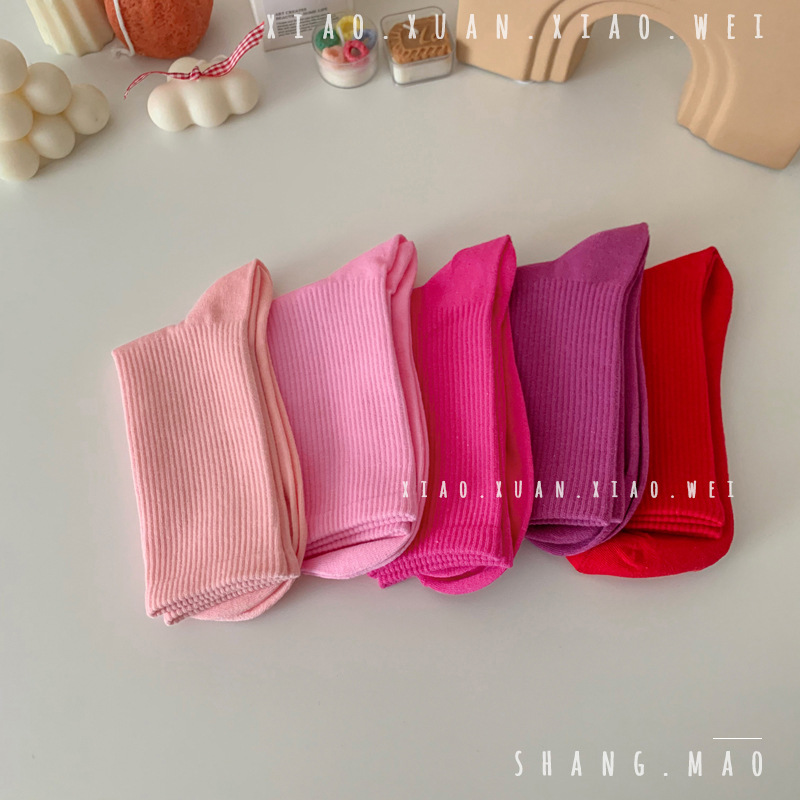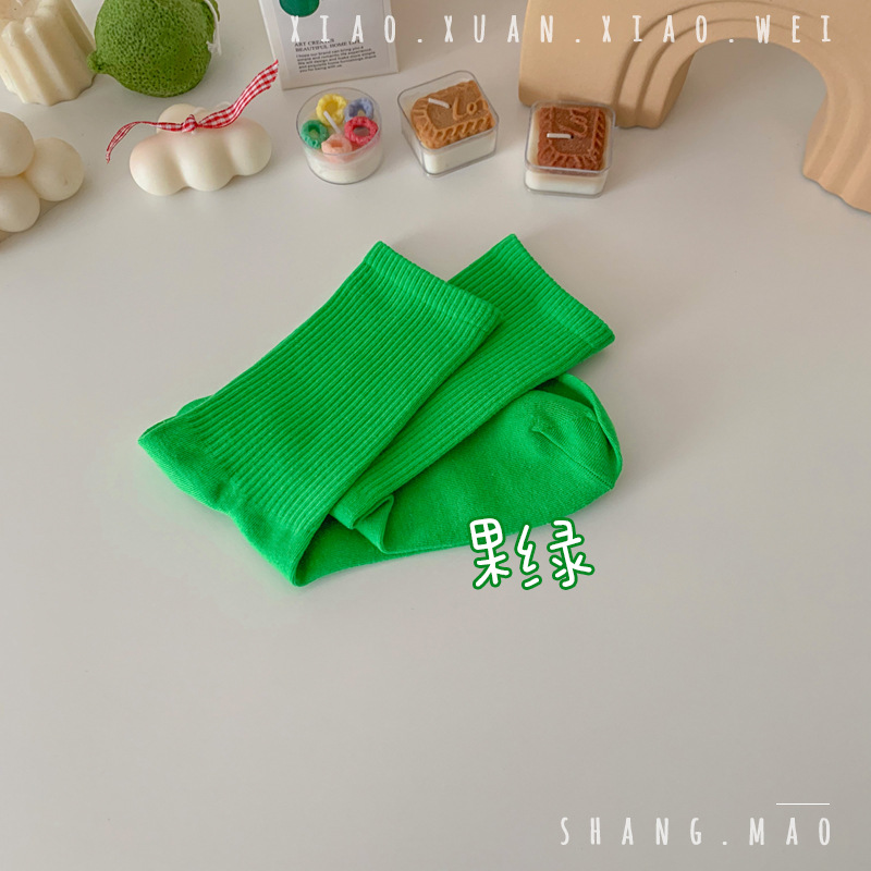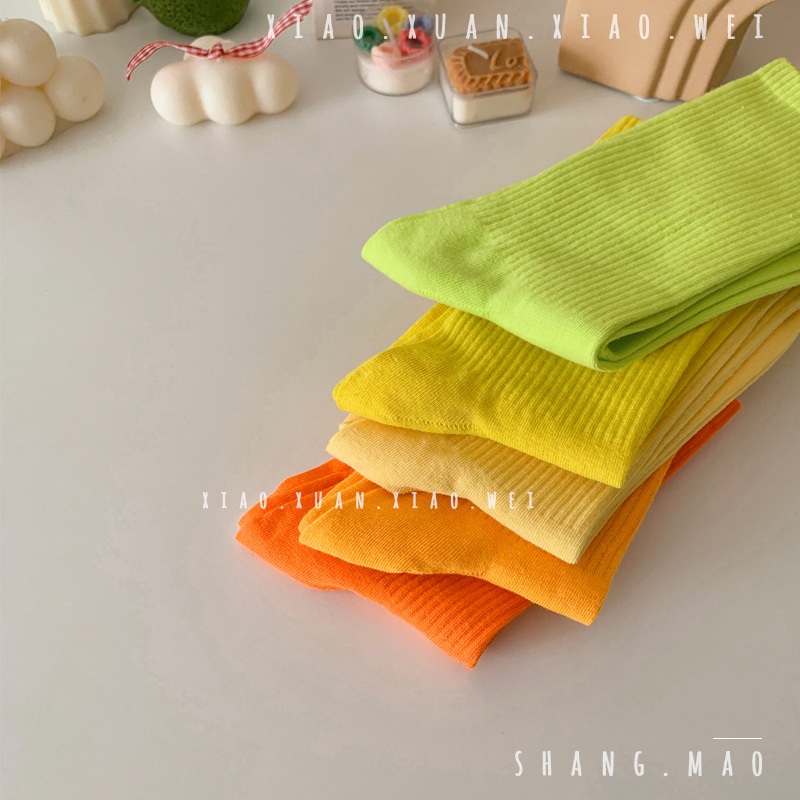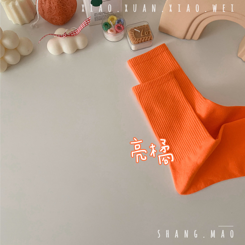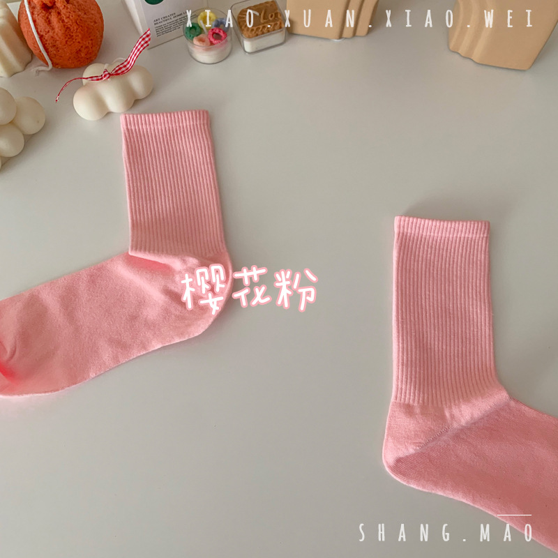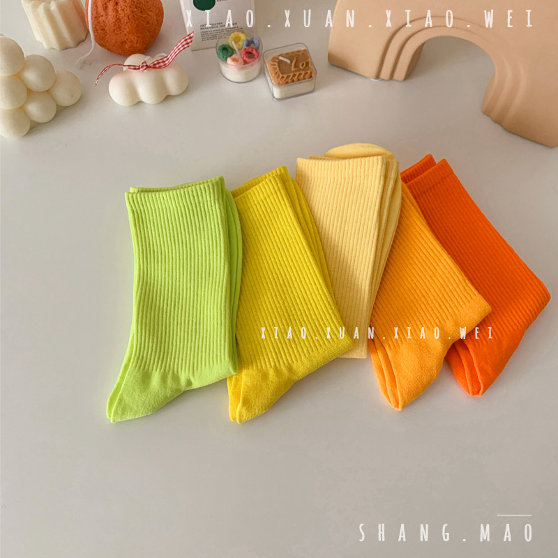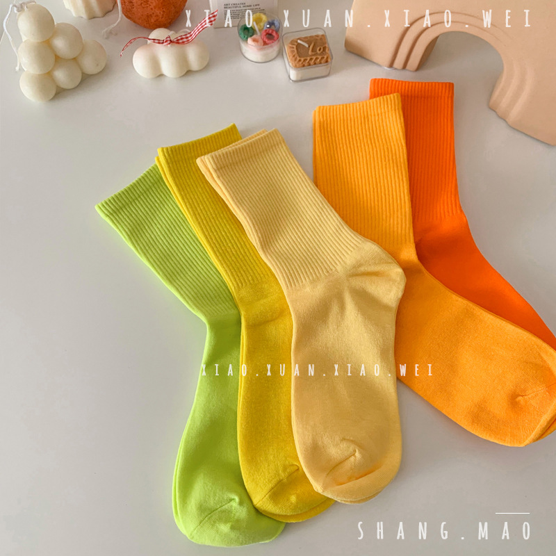 캔디 컬러 양말 여성용 Ins 트렌디 한 높은 고무 솔리드 컬러 미드 양말 다채로운 플랫 코튼 통기성 외부 착용 스택 양말