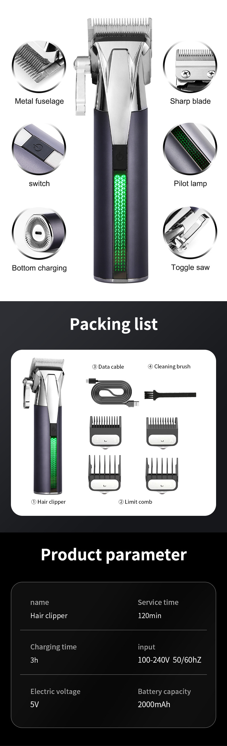 국경 간 전기 충전 헤어 클리퍼 그라디언트 파워 디스플레이 빛 전문 전기 클리퍼 헤어 클리퍼