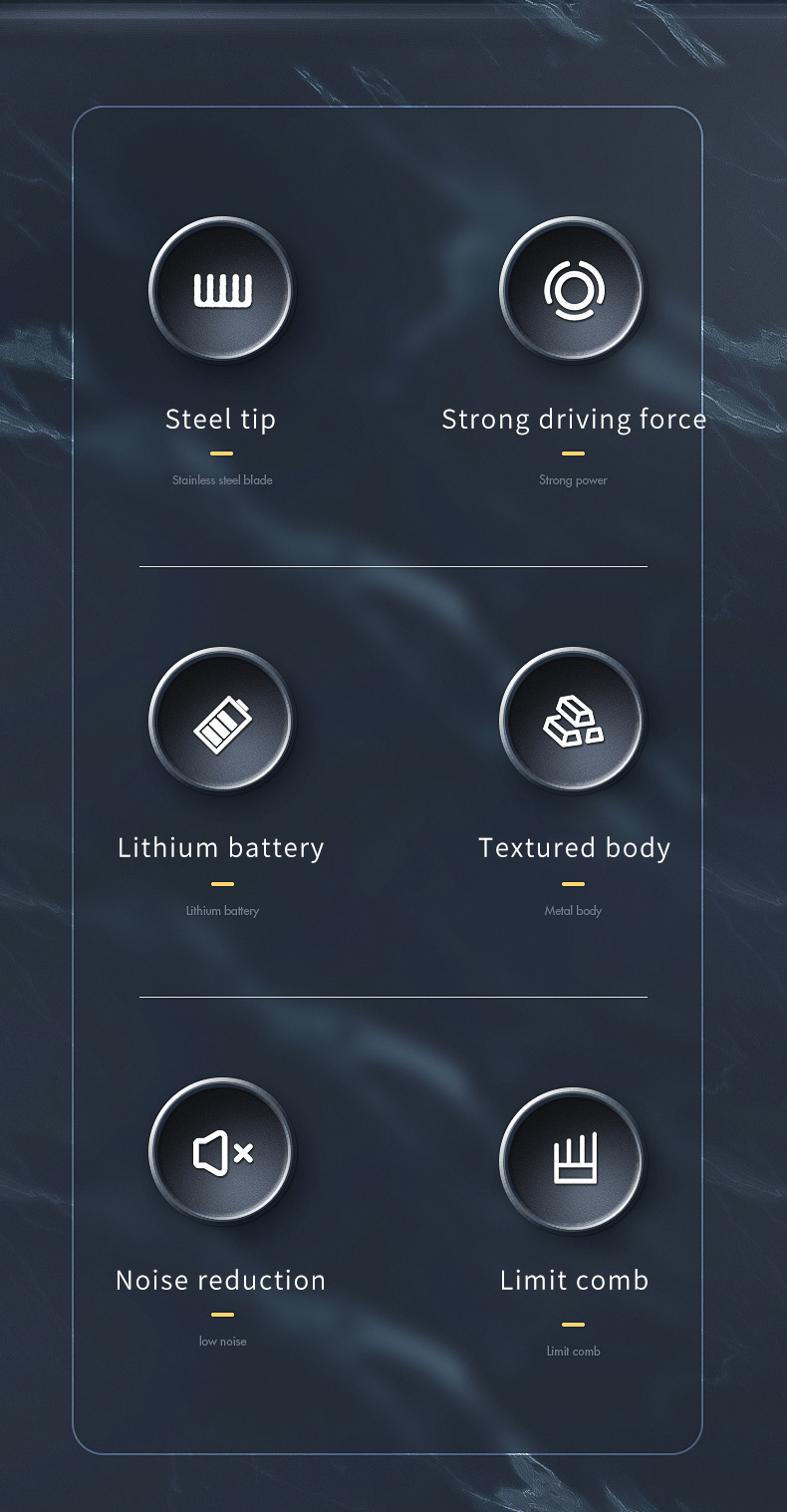 配件:理发器*1、限位梳*4(3/6/10/13mm)、清洁刷*1、充电线*1