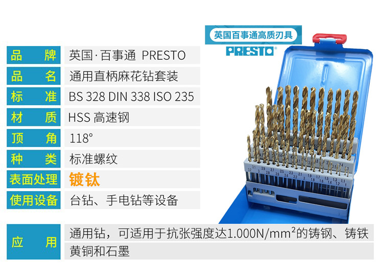 PRESTO UK Bestone 세트 트위스트 드릴 09565 수입 강화 고속 메쉬 티타늄 도금 드릴 M50