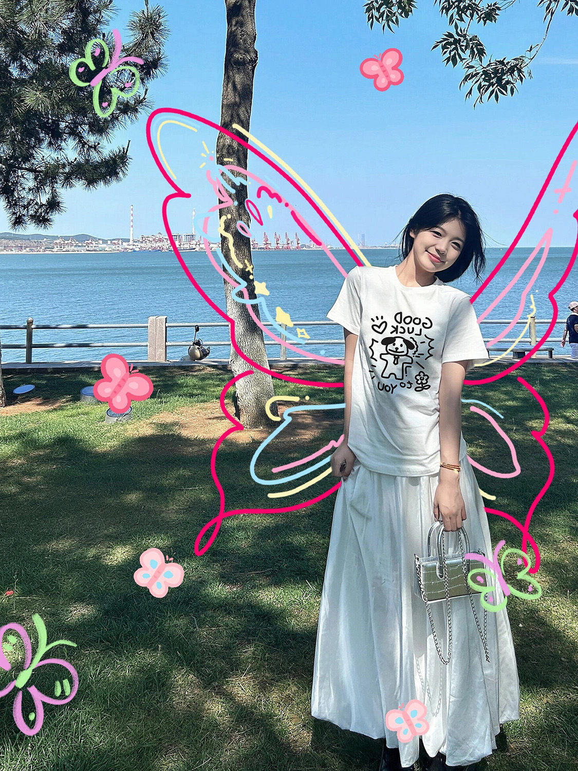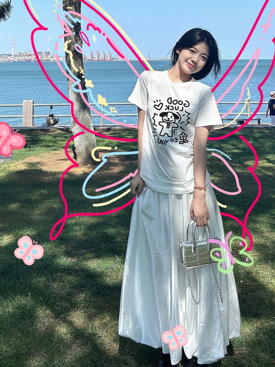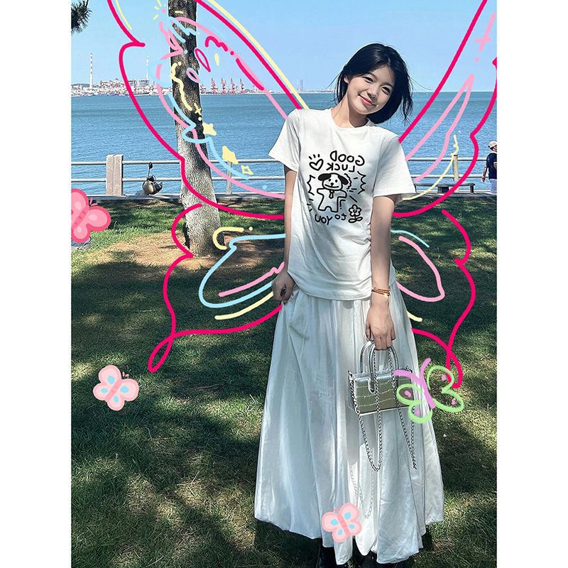 화이트 강아지 어깨 반팔 티셔츠 여성 여름과 여름 새로운 헤비 트렌디 브랜드 반소매 티셔츠 루즈 라운드 넥 탑스토어 가기