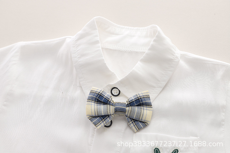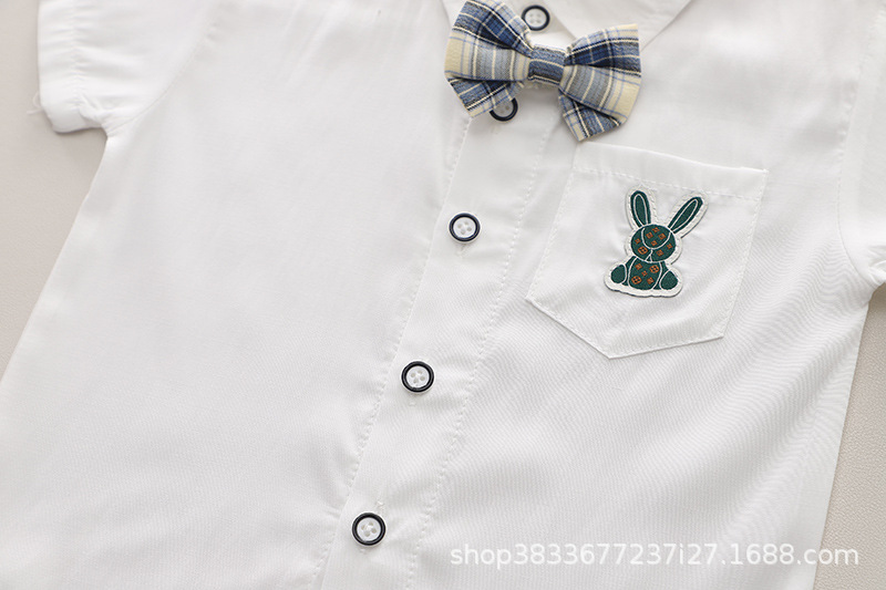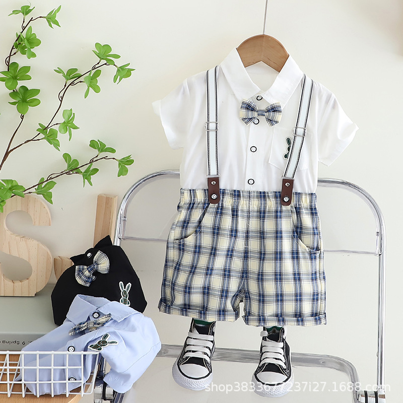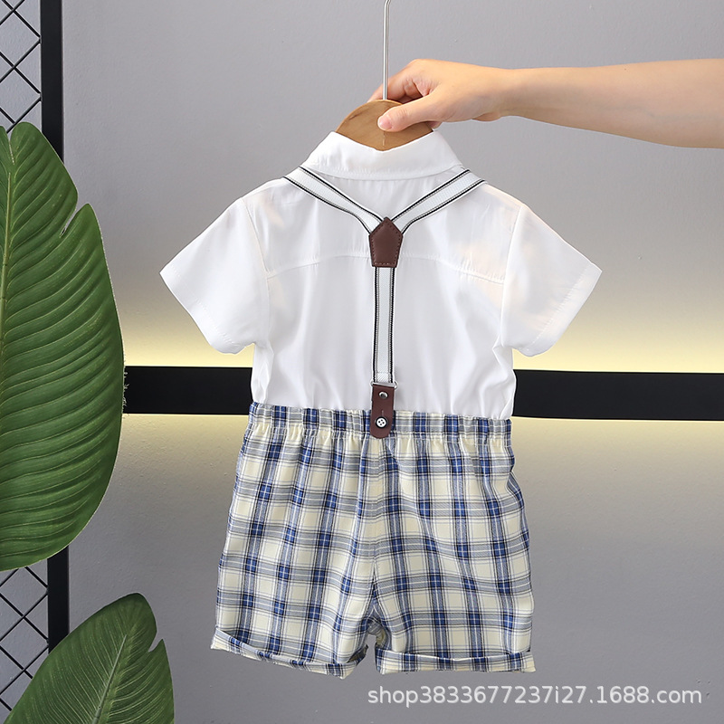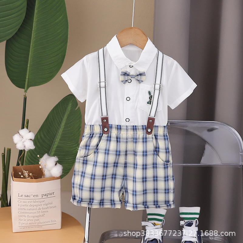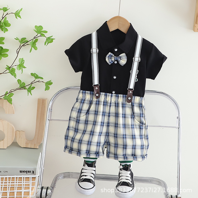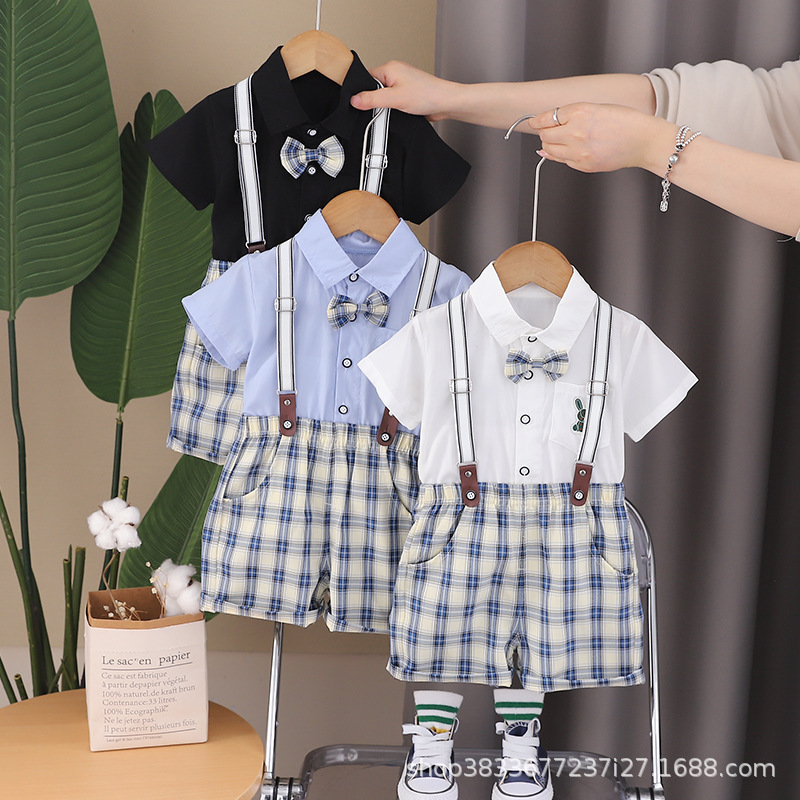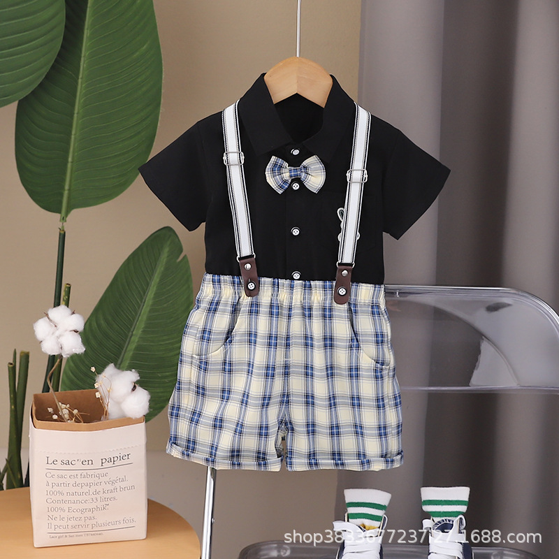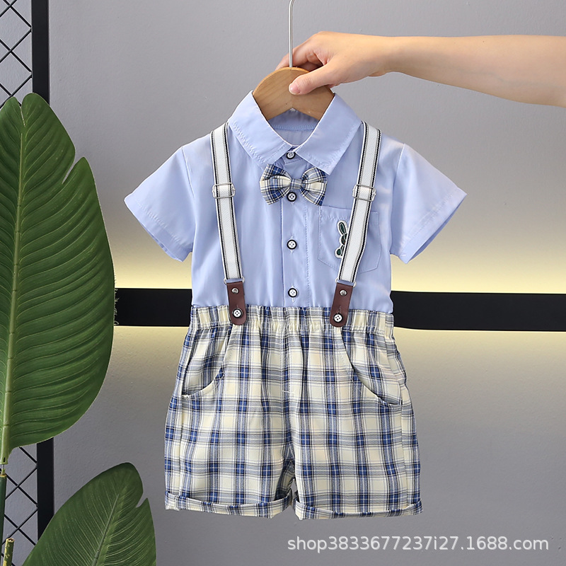 남자들의 여름 세트 새로운 스타일의 아기 나비 넥타이 짧은 소매 어깨 끈 바지 투피스 어린이 여름 옷 대체 머리