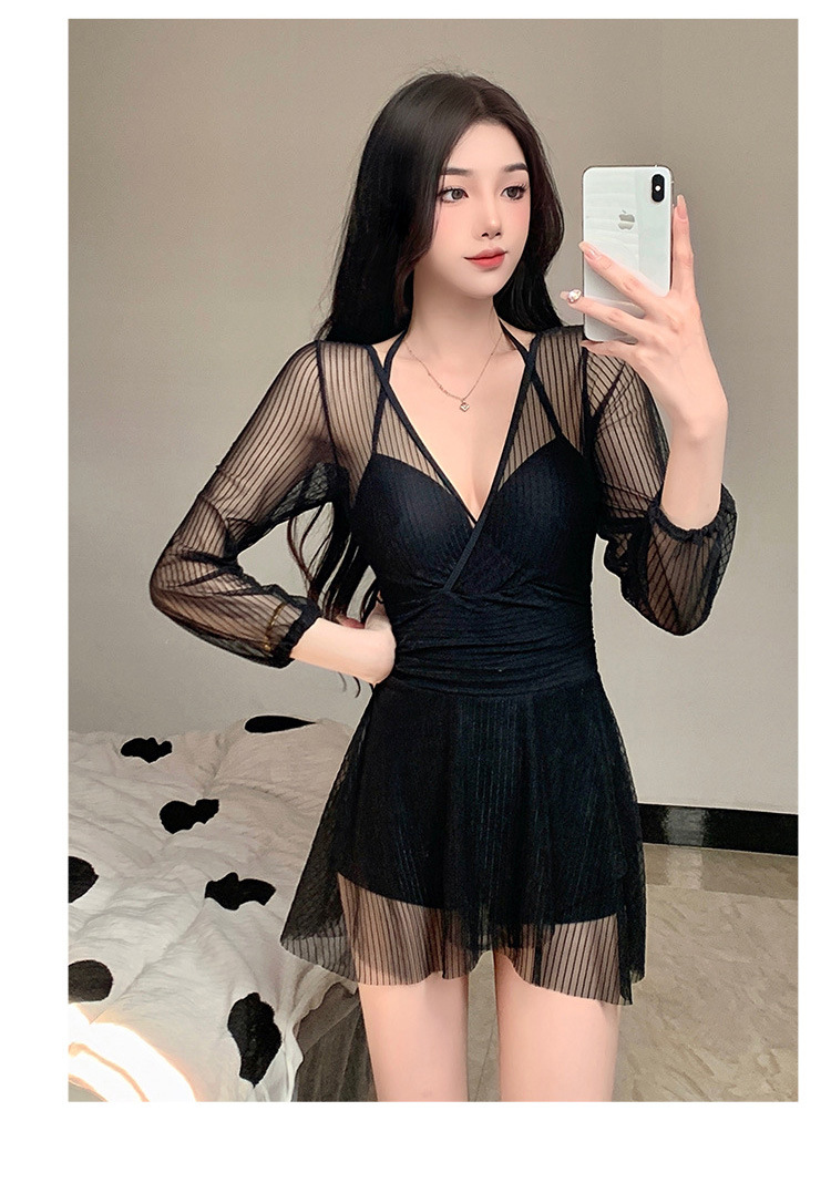 여성 수영복 2025 여름 인터넷 연예인 새로운 원피스 스커트 스타일 살을 덮고 슬리밍 레이스 긴팔 작은 가슴 푸시 업 휴가 수영복스토어 가기
