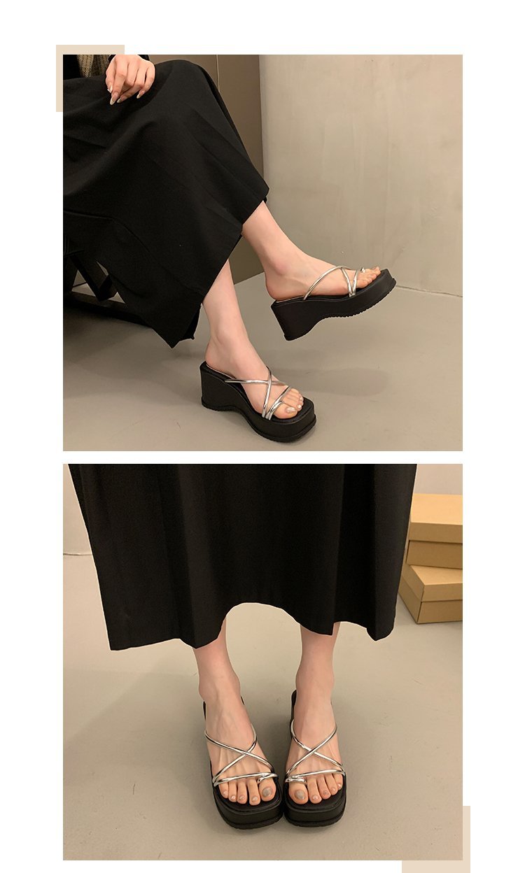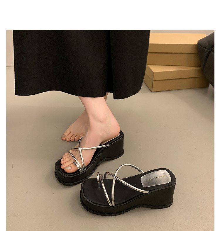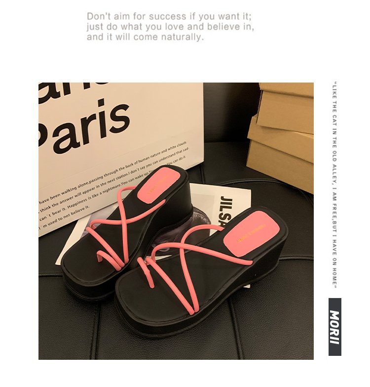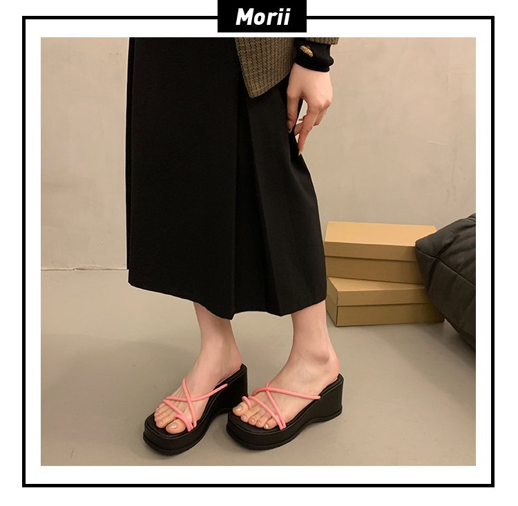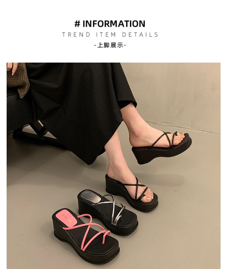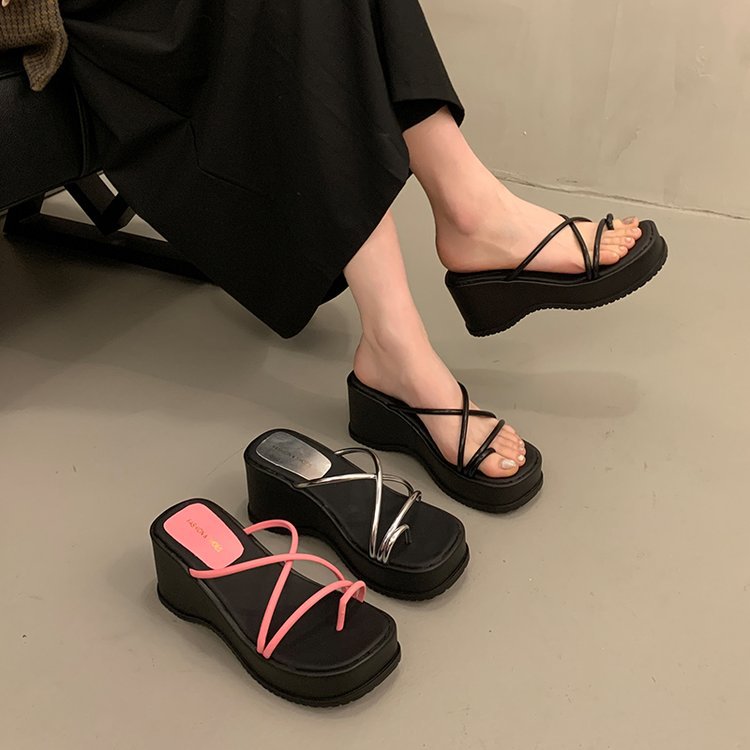2024 년 여름 새로운 두꺼운 밑창 플립 플롭 여성용 겉옷 크로스 오픈 토 웨지 힐 작은 하이힐 도매스토어 가기