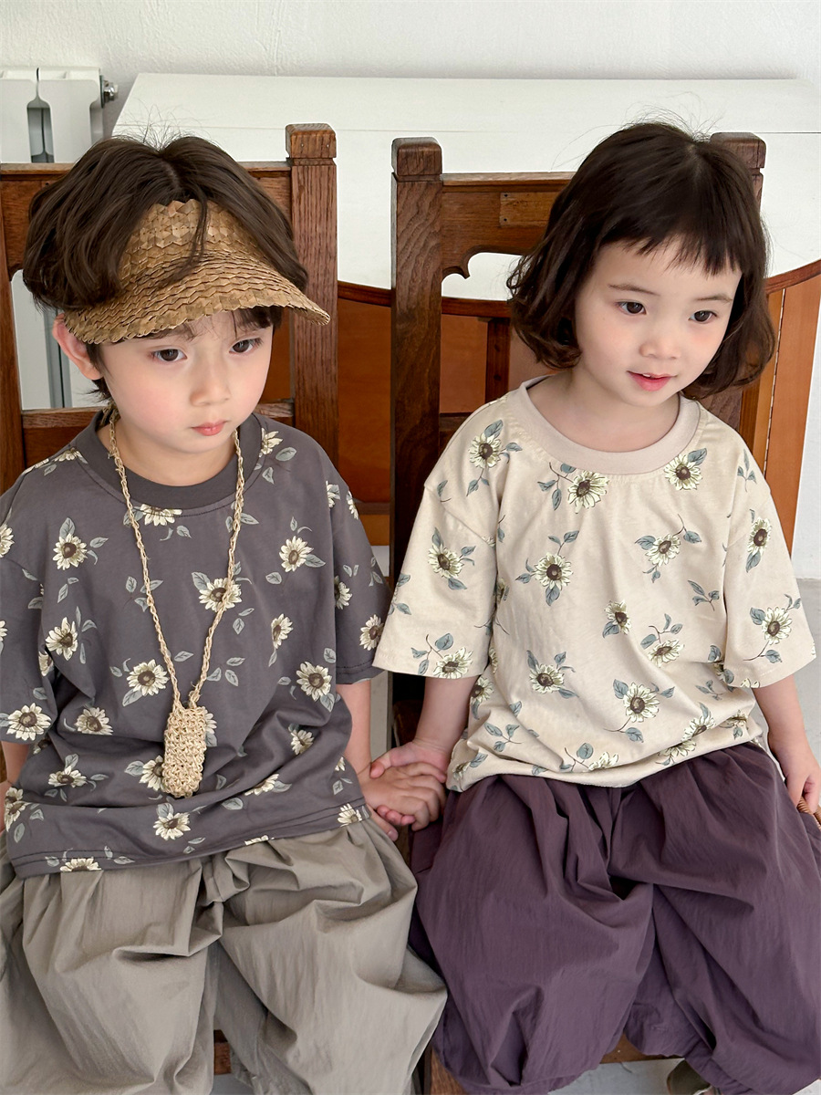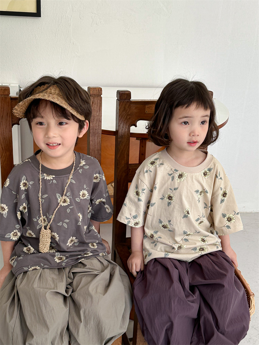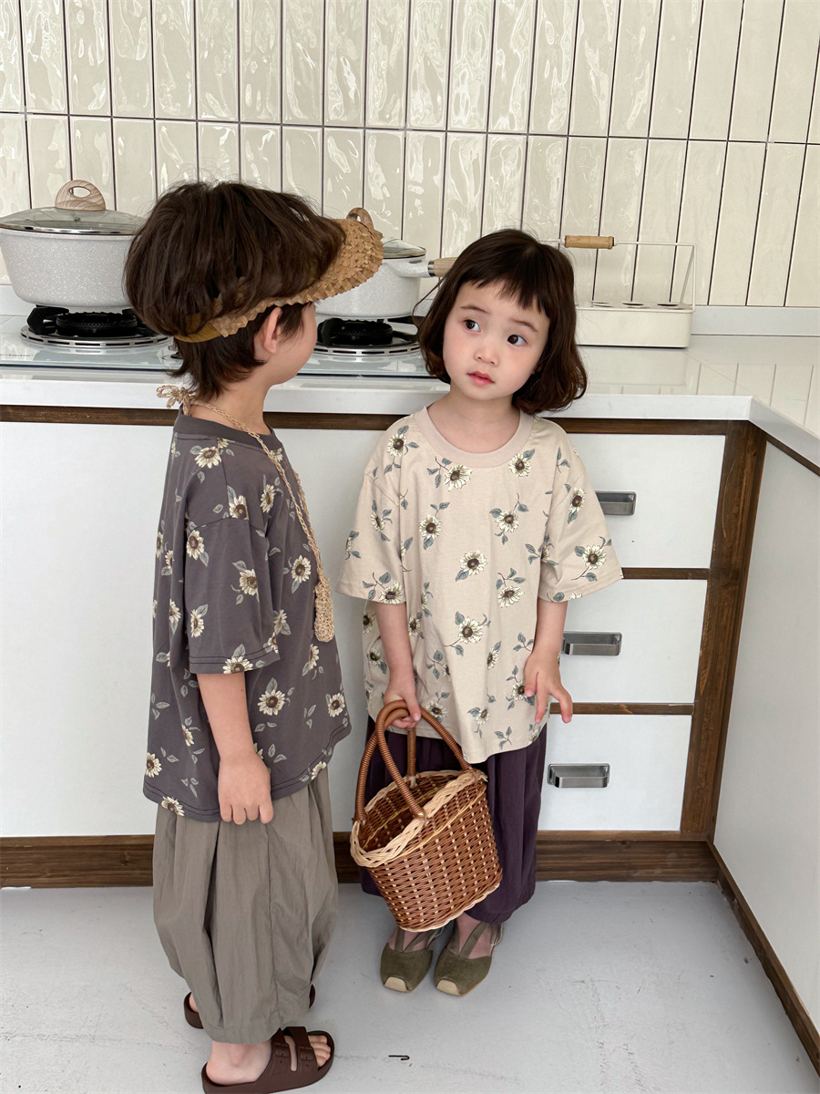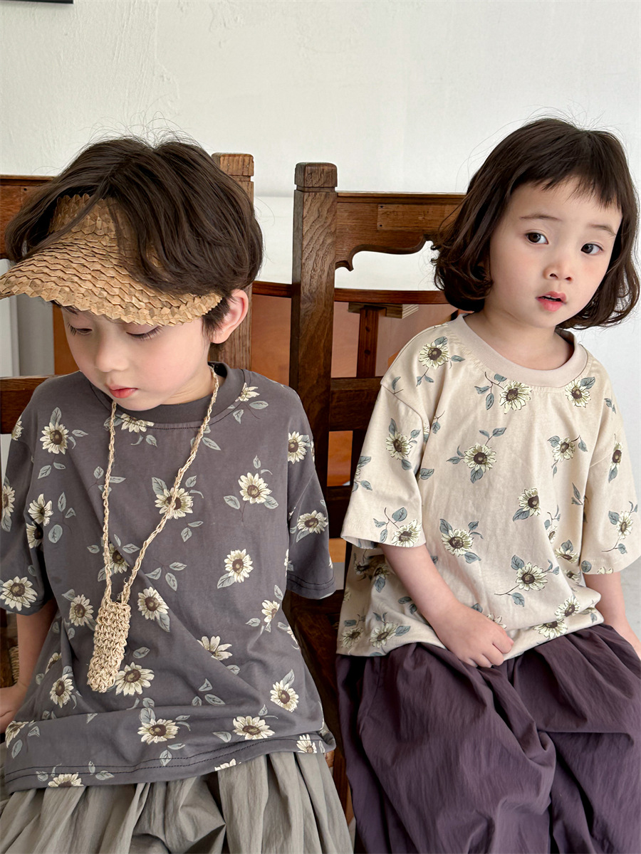 Jiaye 어린이 제품 2025 여름 새로운 어린이 꽃 프린트 반팔 티셔츠 소년과 소녀를위한 느슨한 서양식 반팔