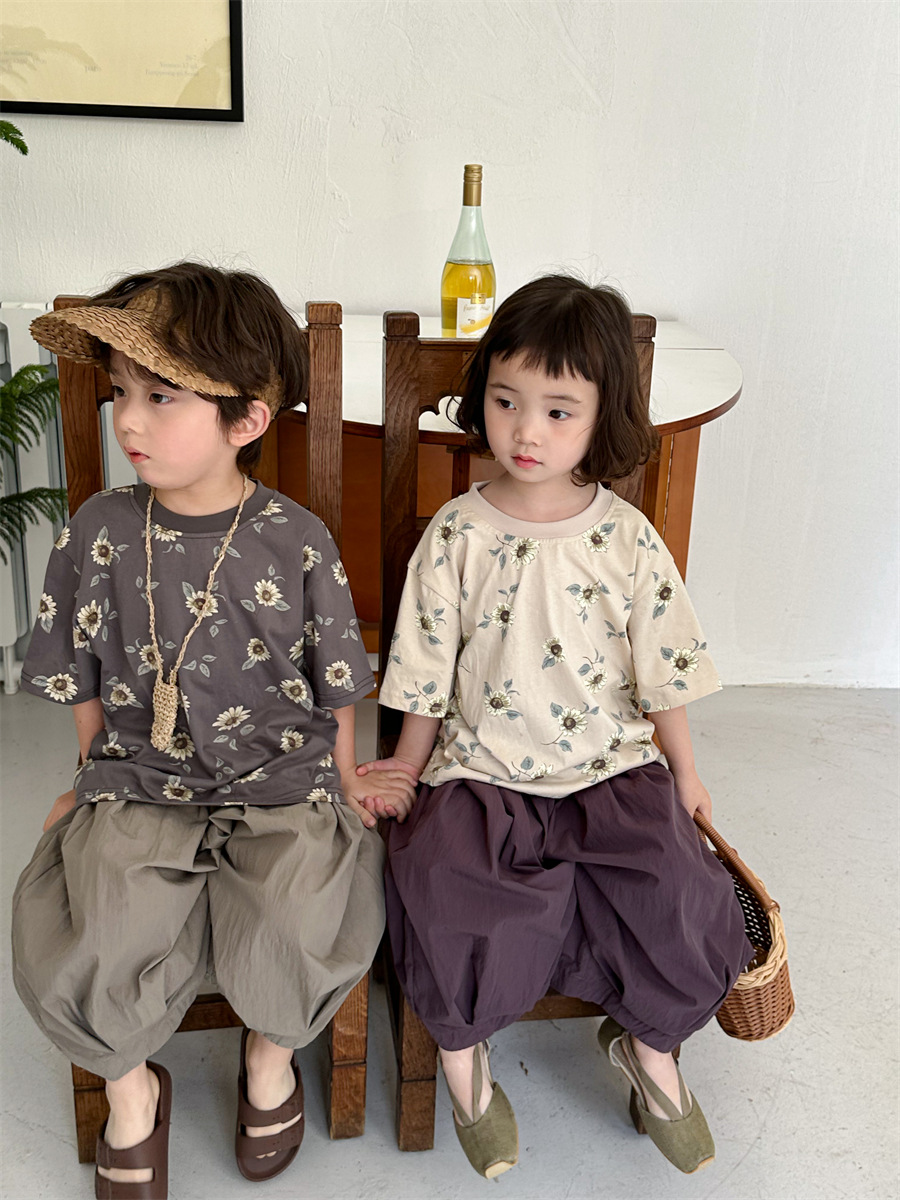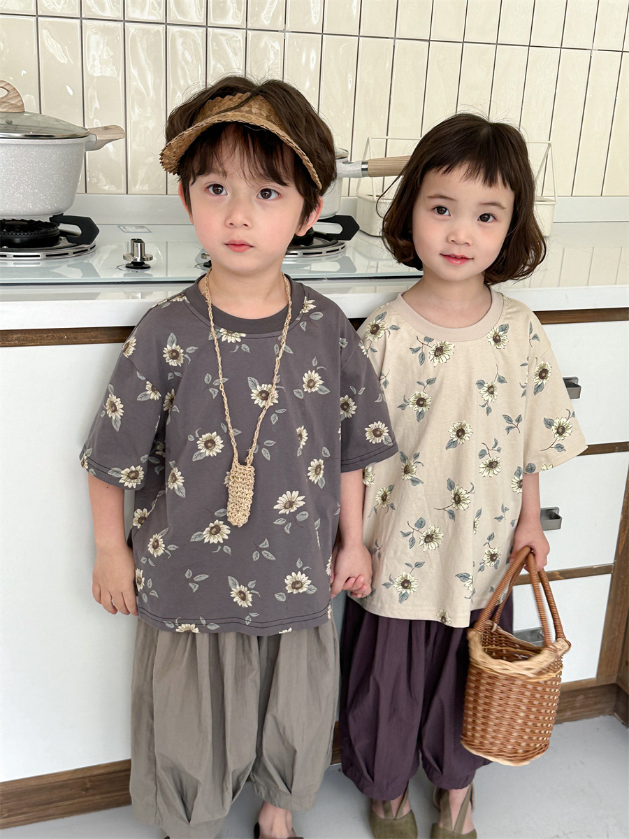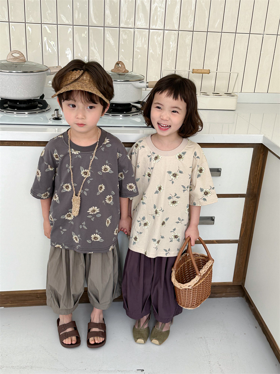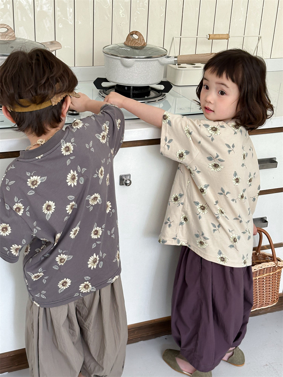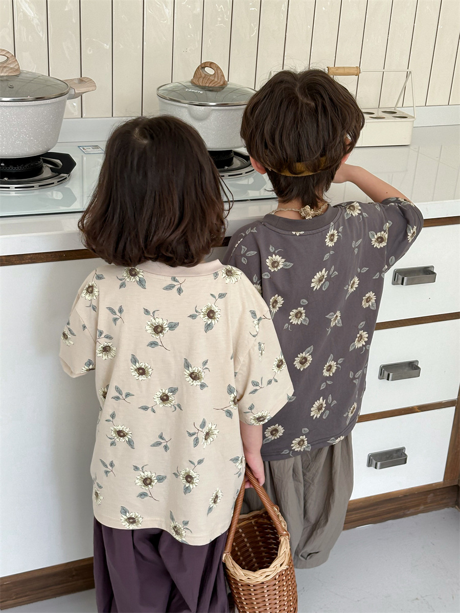 Jiaye 어린이 제품 2025 여름 새로운 어린이 꽃 프린트 반팔 티셔츠 소년과 소녀를위한 느슨한 서양식 반팔