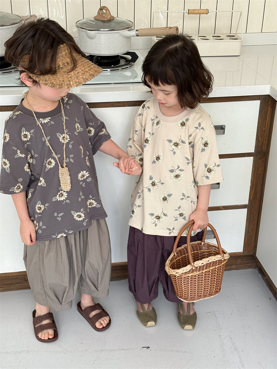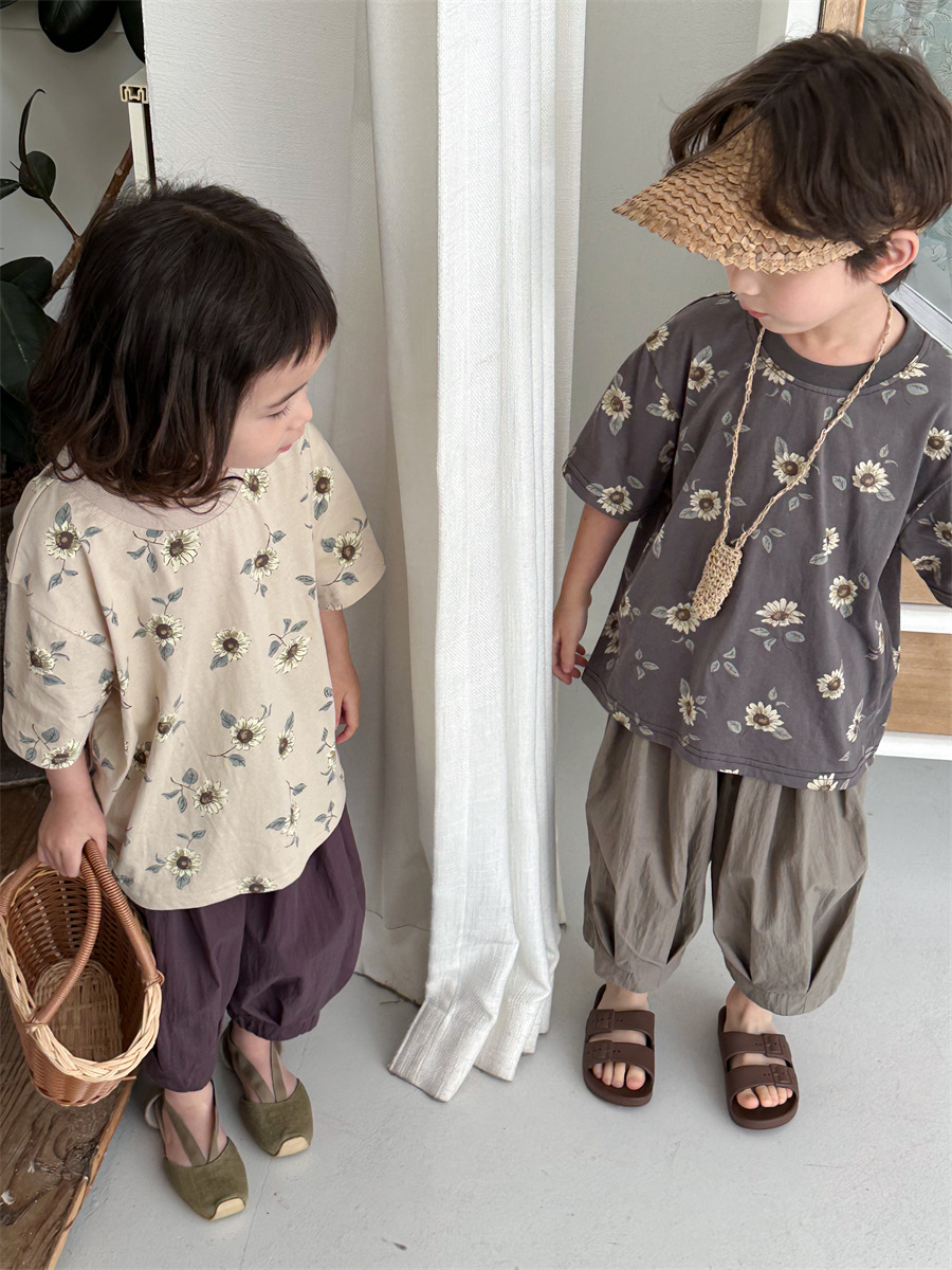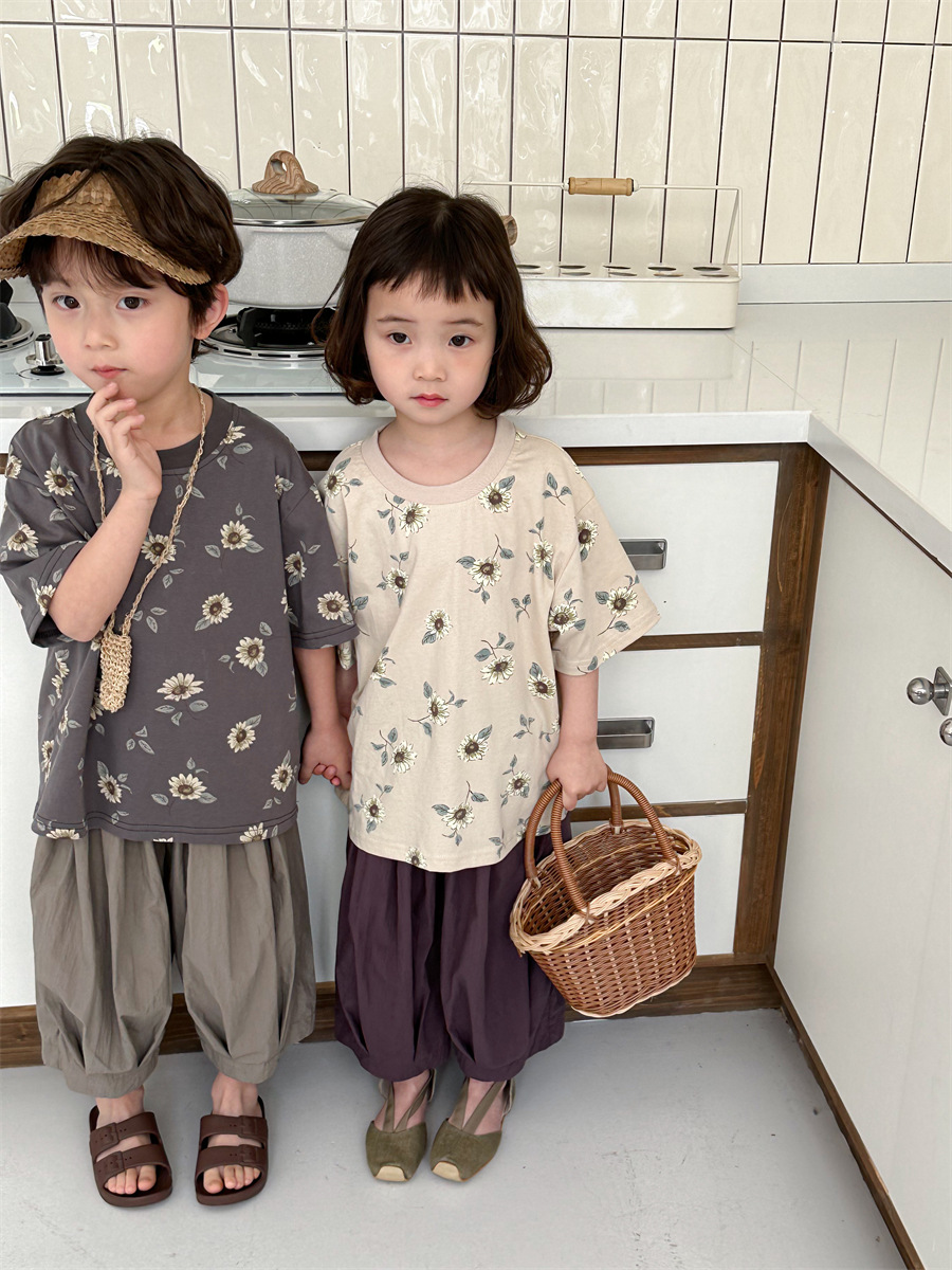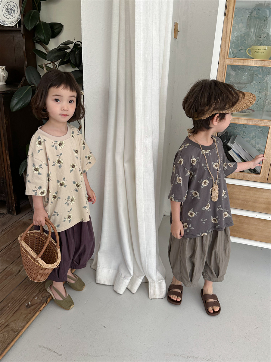 Jiaye 어린이 제품 2025 여름 새로운 어린이 꽃 프린트 반팔 티셔츠 소년과 소녀를위한 느슨한 서양식 반팔