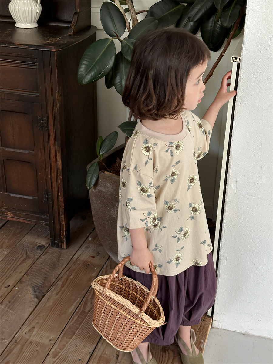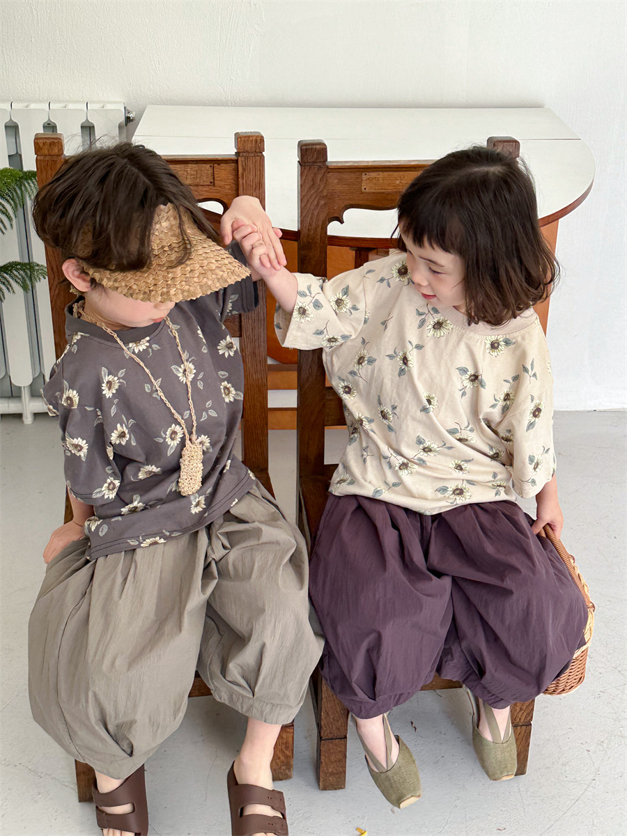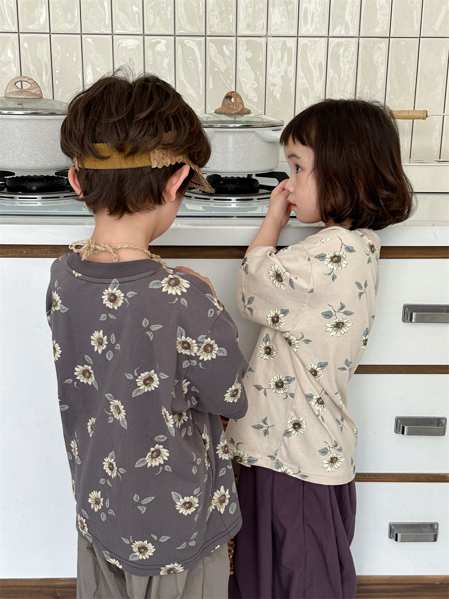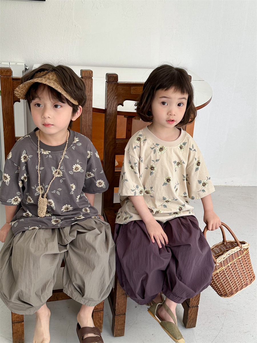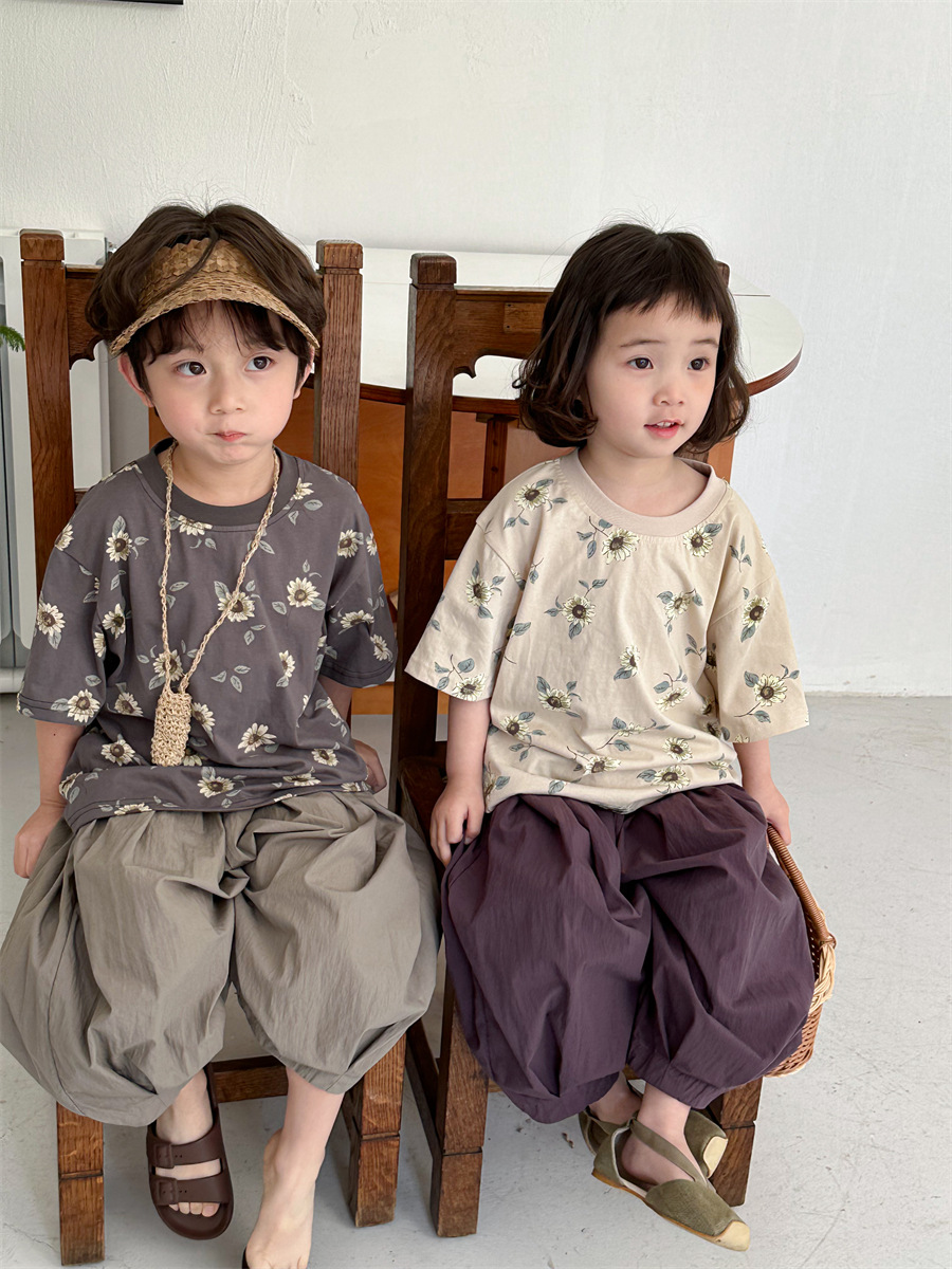 Jiaye 어린이 제품 2025 여름 새로운 어린이 꽃 프린트 반팔 티셔츠 소년과 소녀를위한 느슨한 서양식 반팔