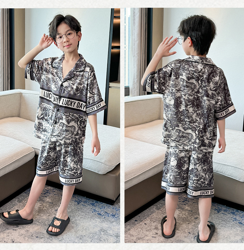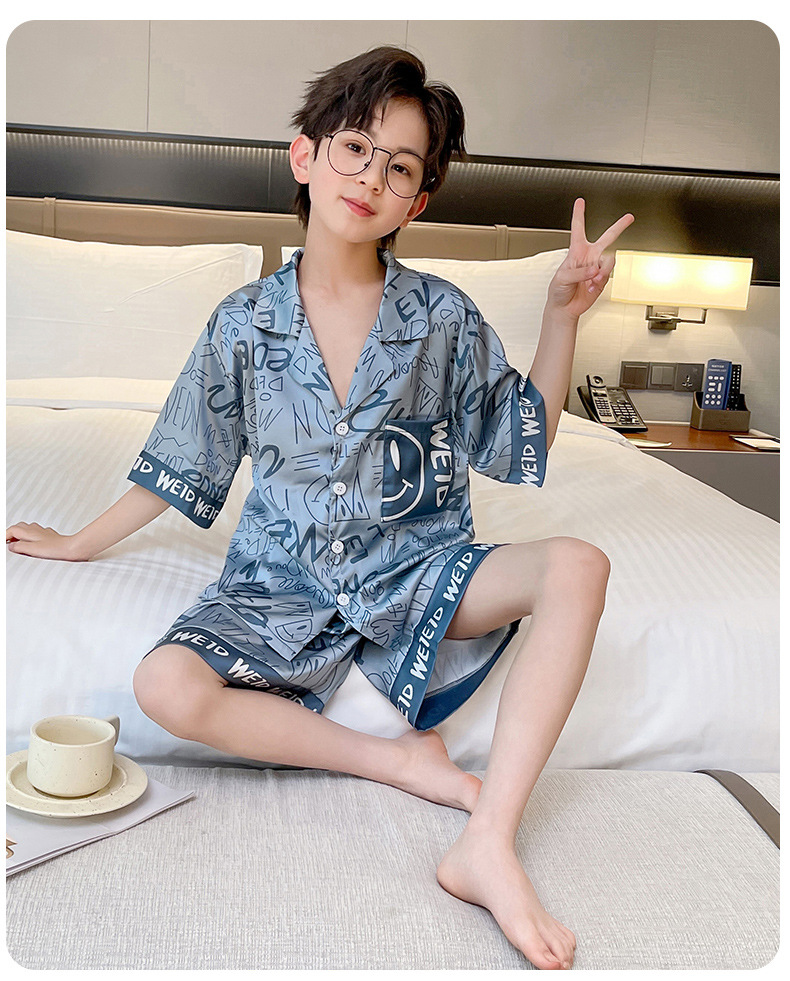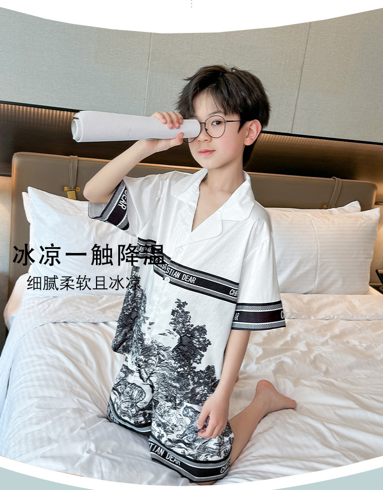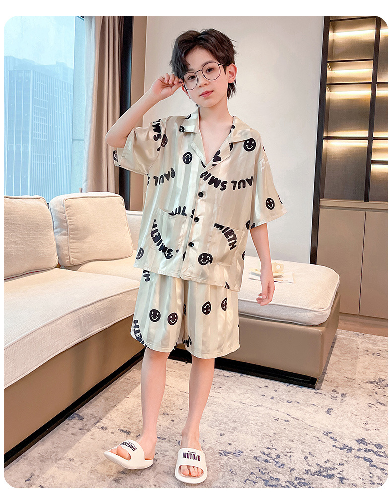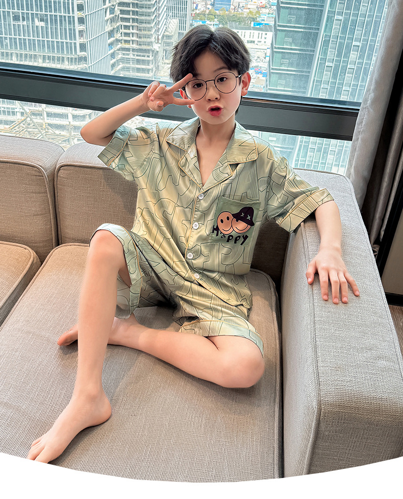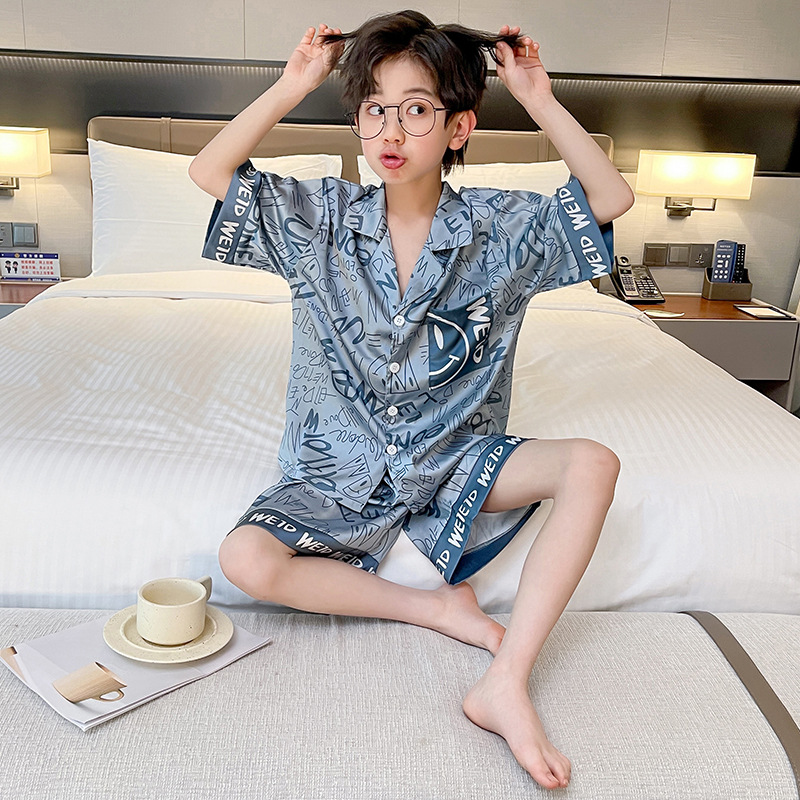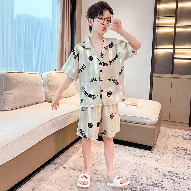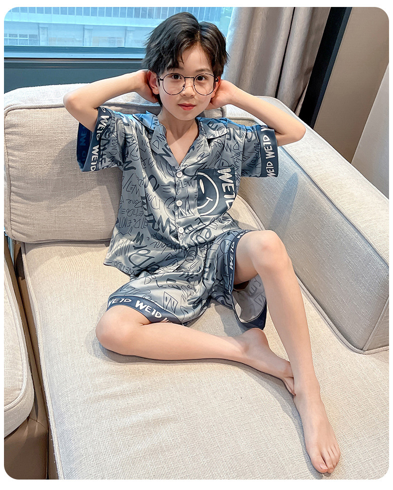 어린이 의류 소년 여름 잠옷 아이스 실크 반팔 홈 의류 세트 얇은 소년의 여름 에어컨 세트스토어 가기