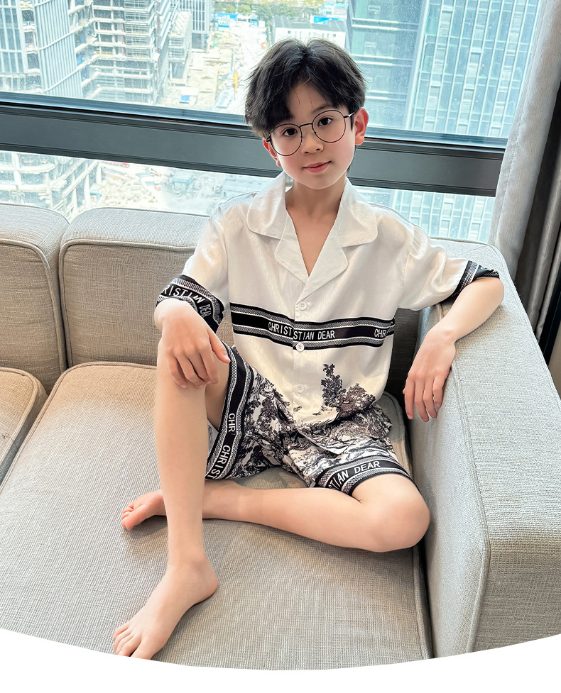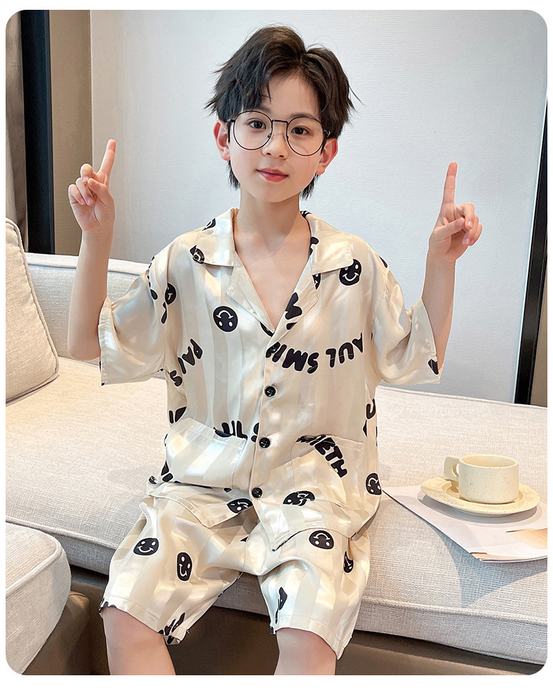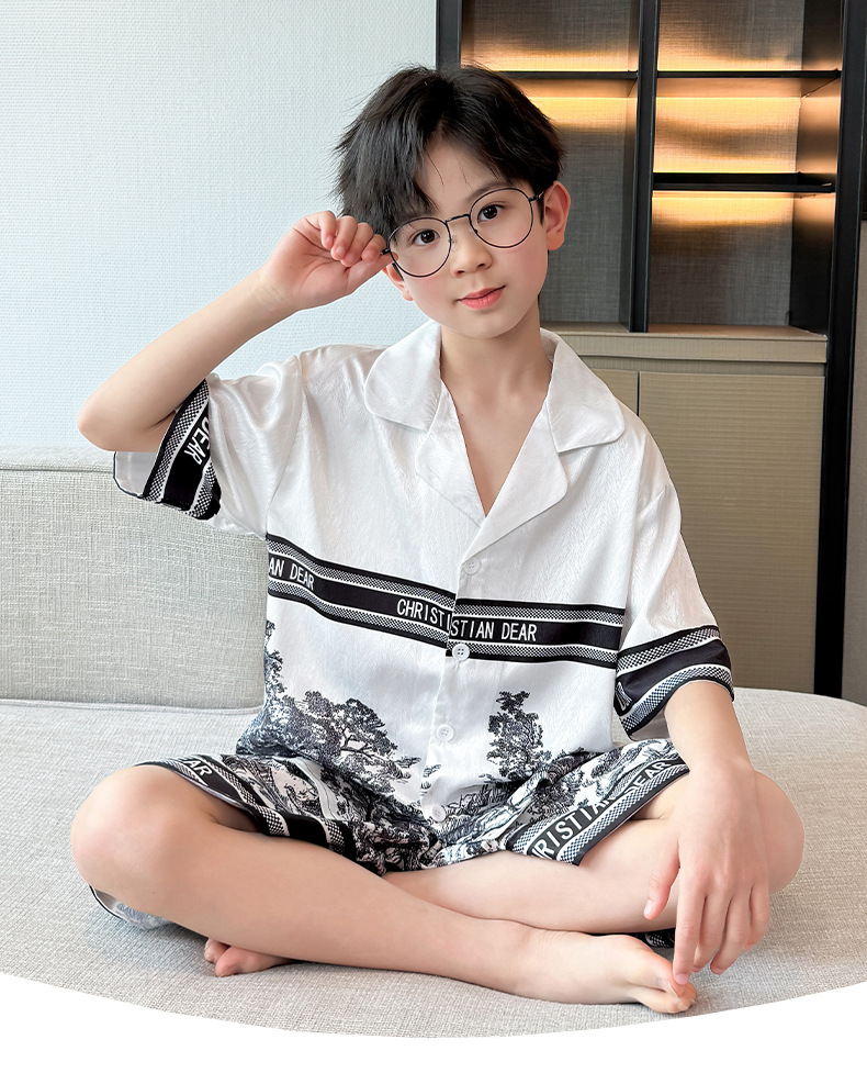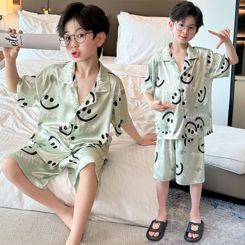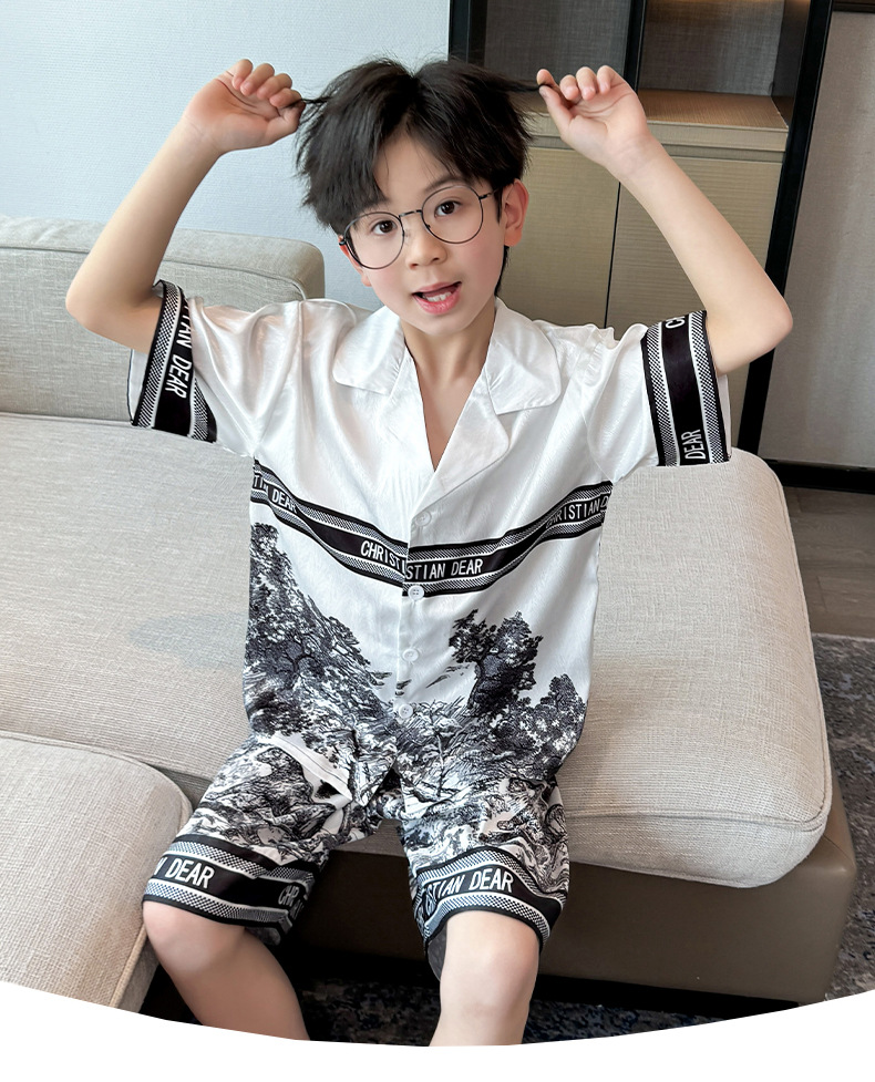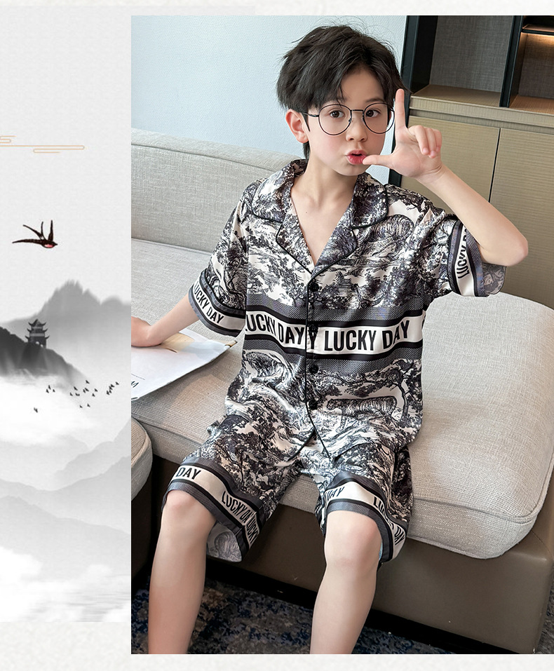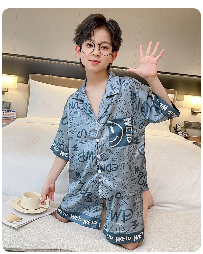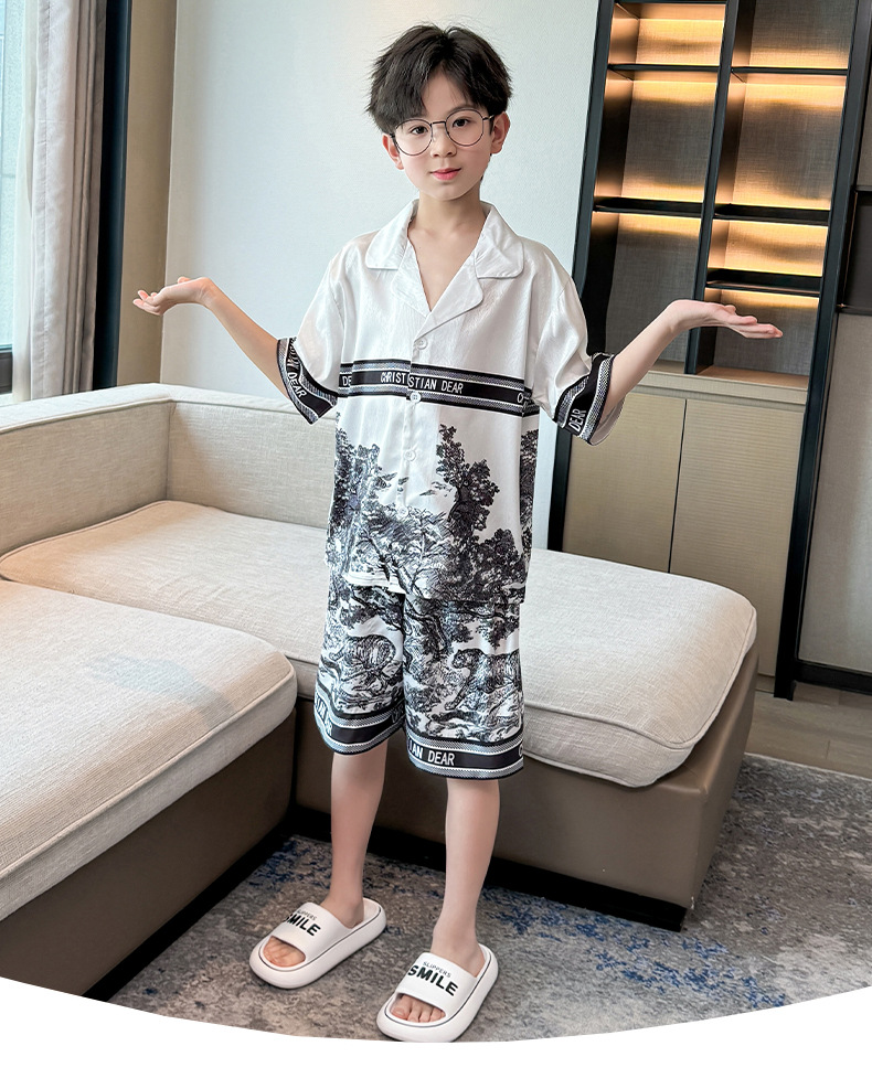어린이 의류 소년 여름 잠옷 아이스 실크 반팔 홈 의류 세트 얇은 소년의 여름 에어컨 세트스토어 가기