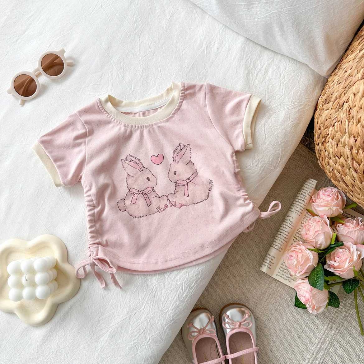 여자 여름 반팔 한국어 버전 2025 새로운 어린이 솔리드 컬러 만화 티셔츠 아기 소녀 drawstring 반팔 탑 유행 t