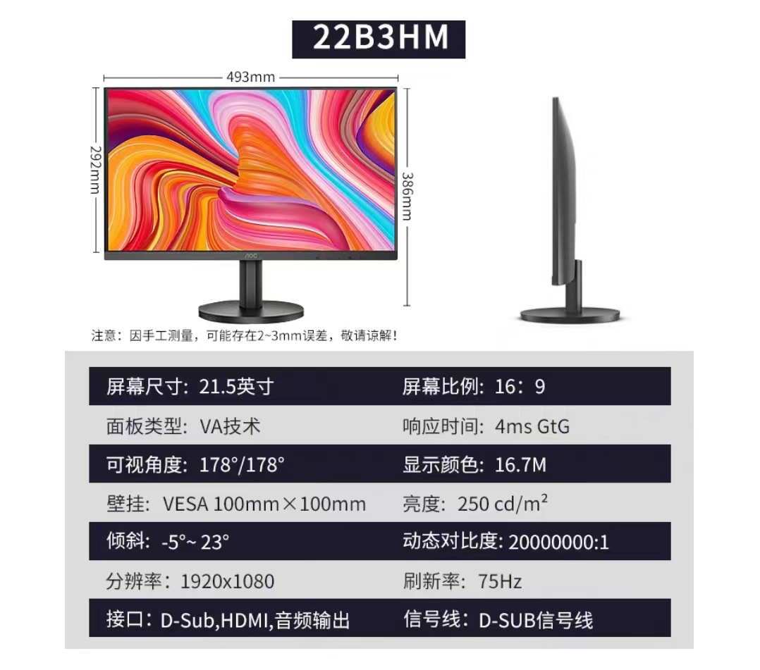 22B3HM 모니터 21.5inch VA 광시야각 1080P 풀 HD HDR 모드 벽걸이 가능