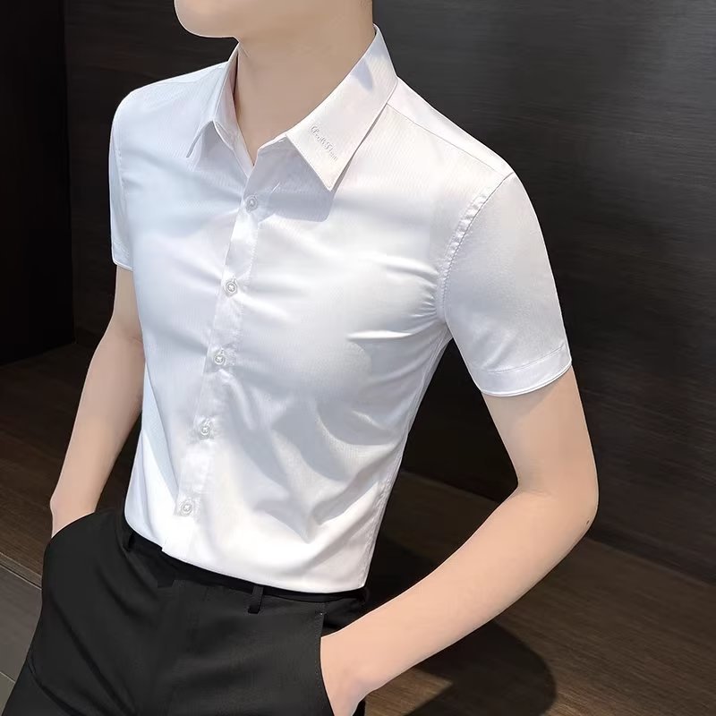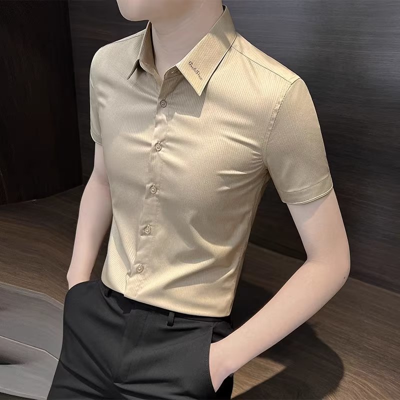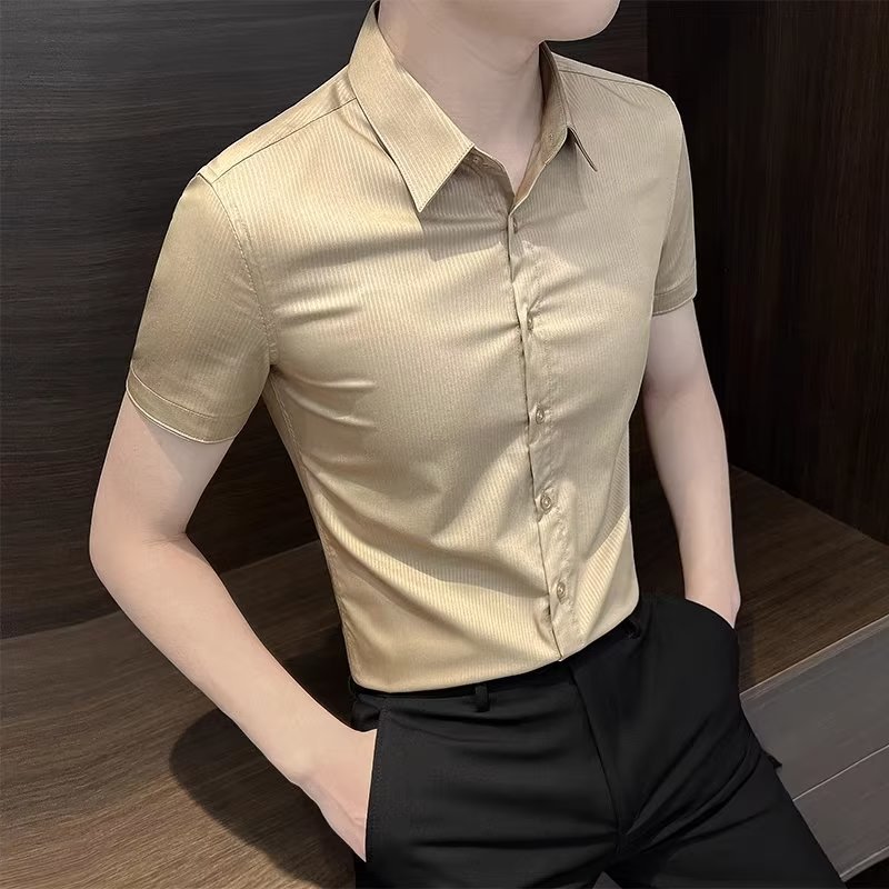 수직 스트라이프 남자 반팔 셔츠 여름 아이스 실크 2024 새로운 여름 비즈니스 하이 엔드 슬림 핏 하이 엔드 센스 셔츠