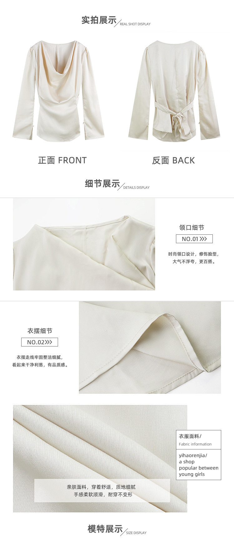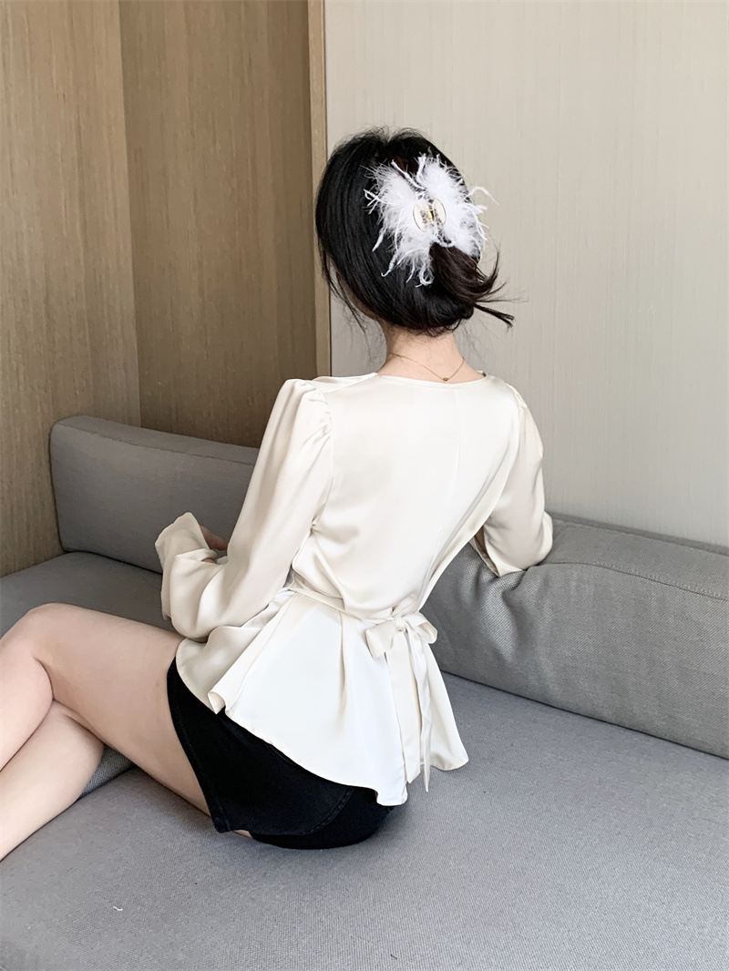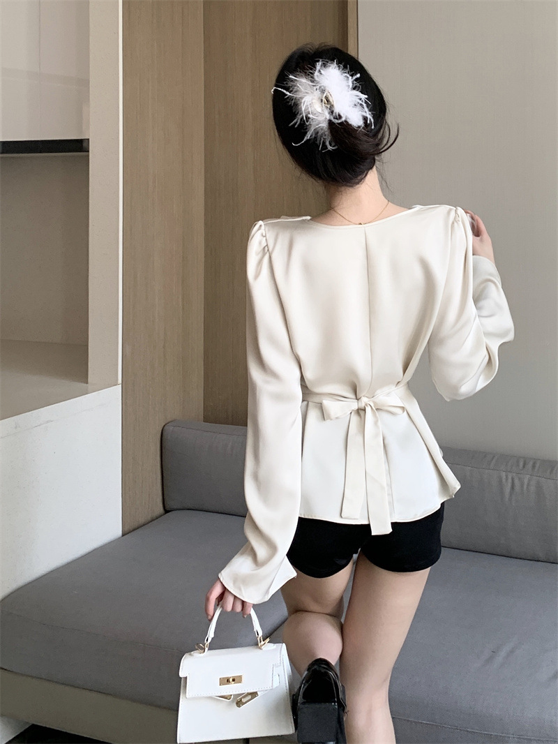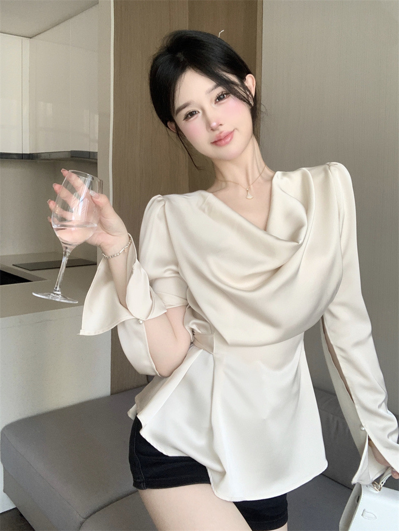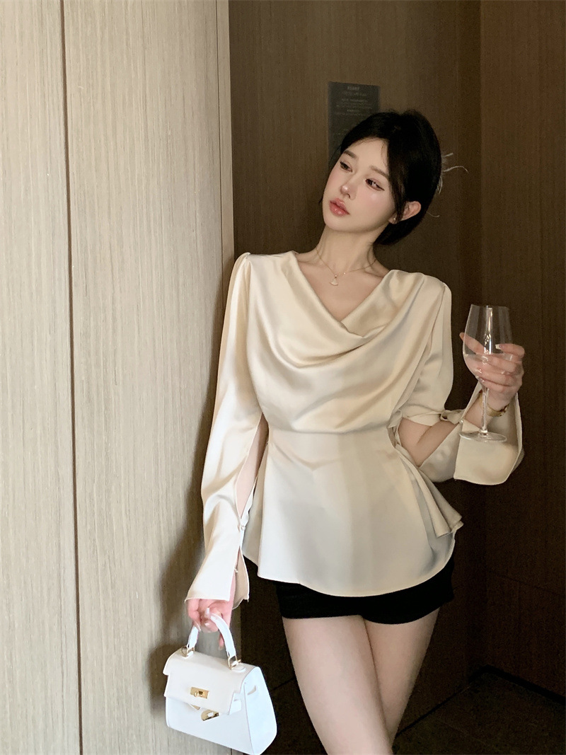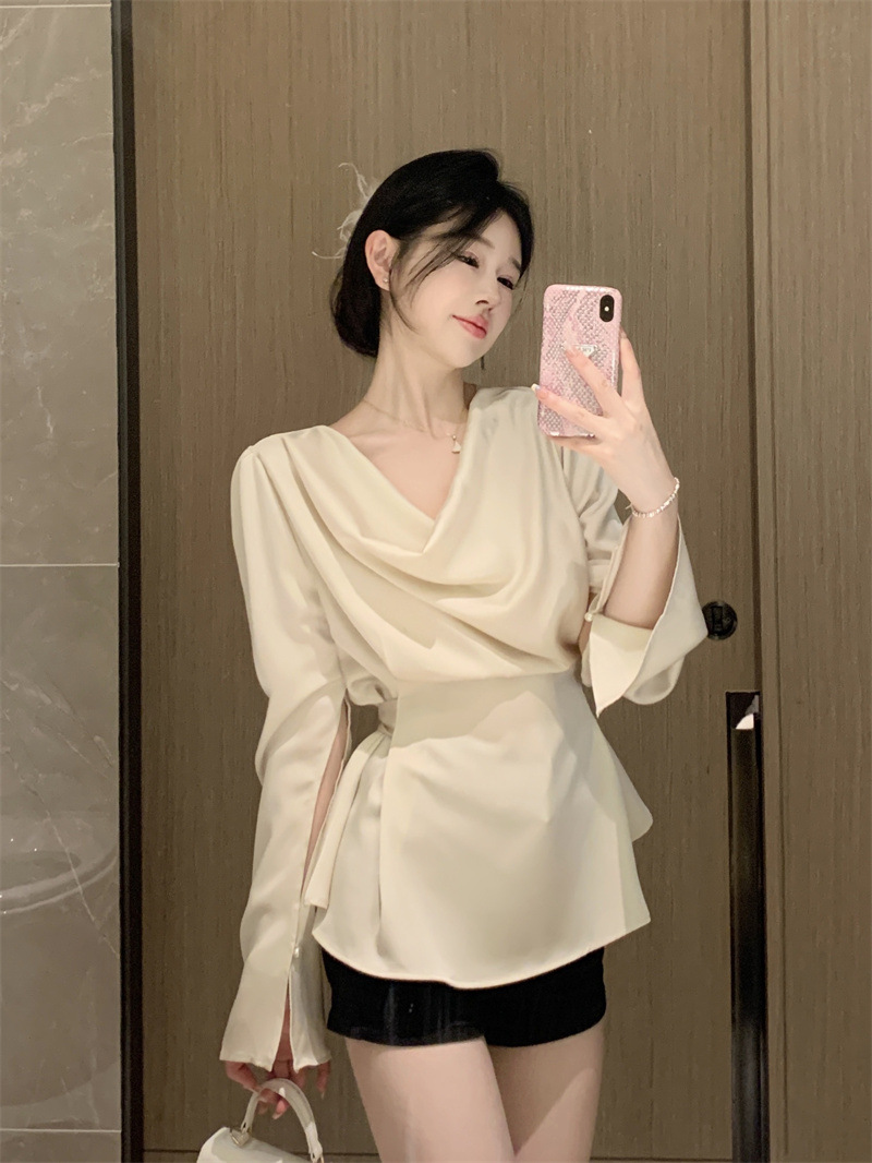 실크 새틴 우아한 긴팔 셔츠 여성용 봄 디자인 센스 스윙 칼라 레이스 업 셔츠 라이트 성숙한 프랑스 스타일 핀치 허리 탑