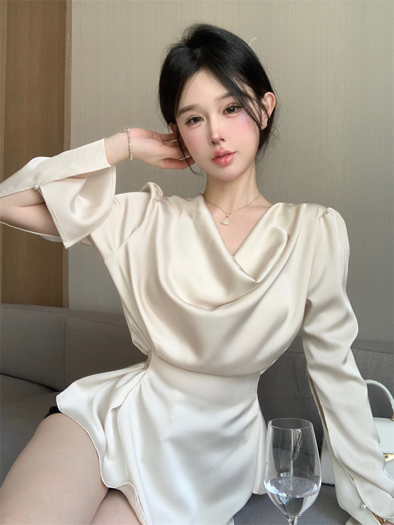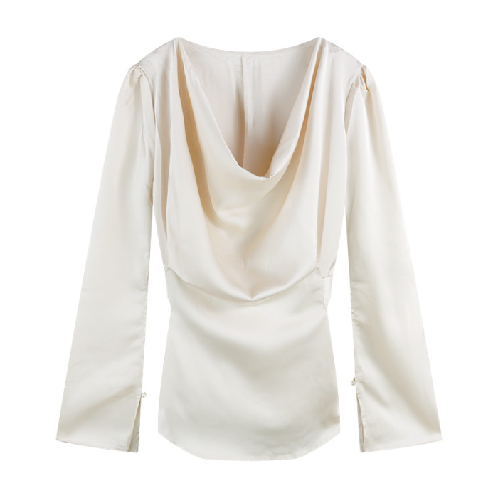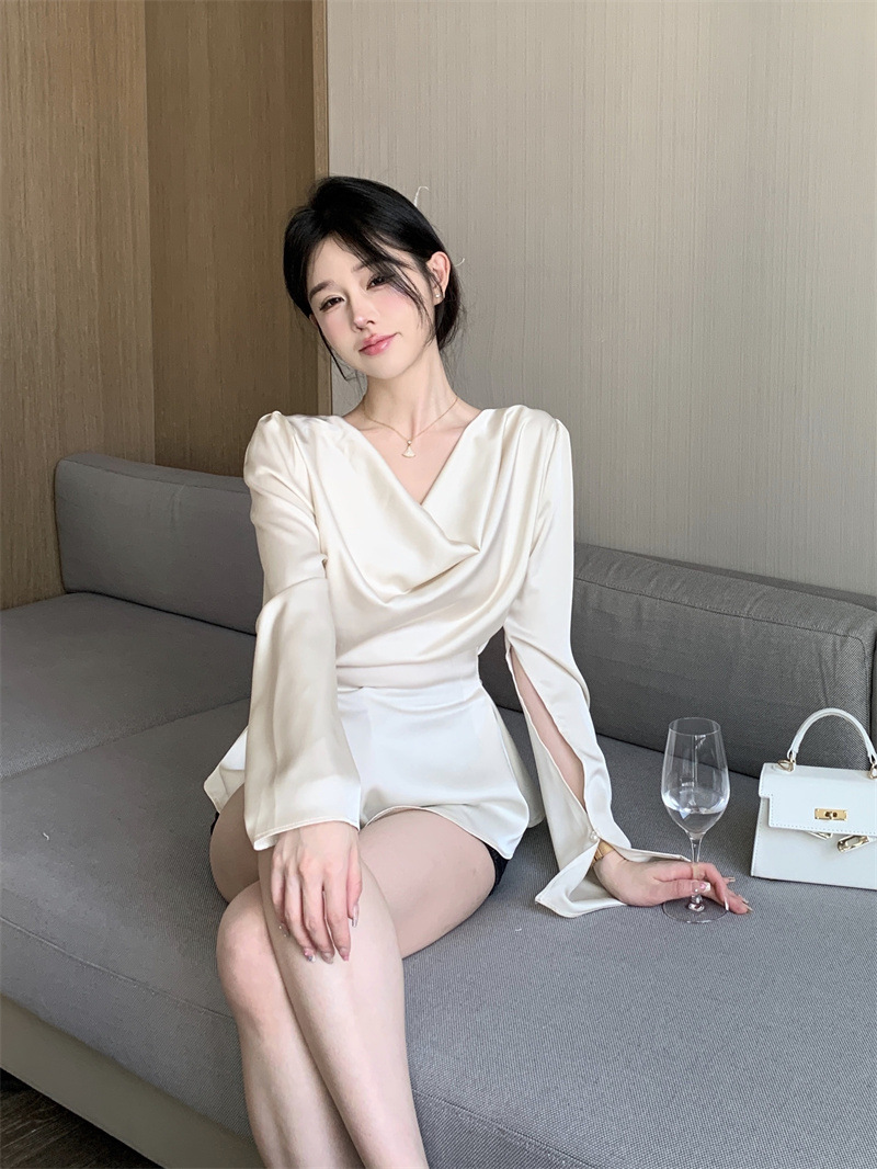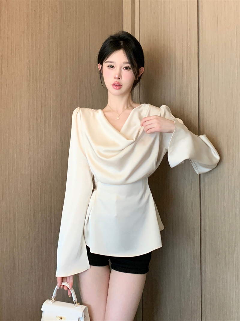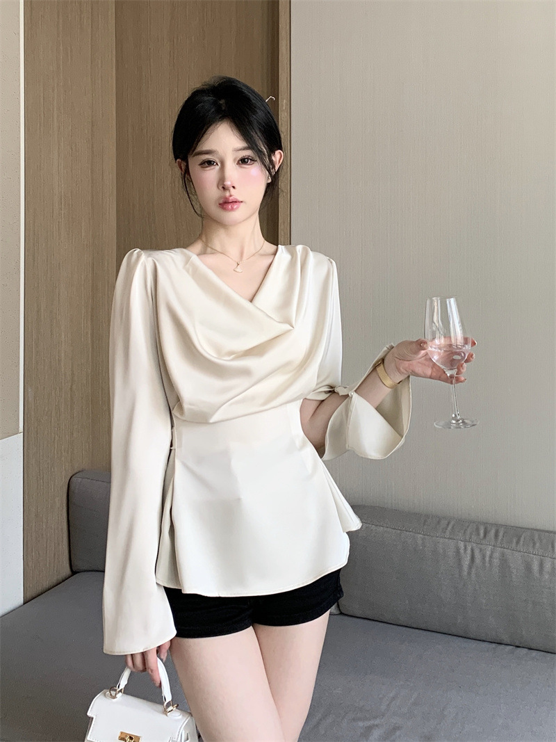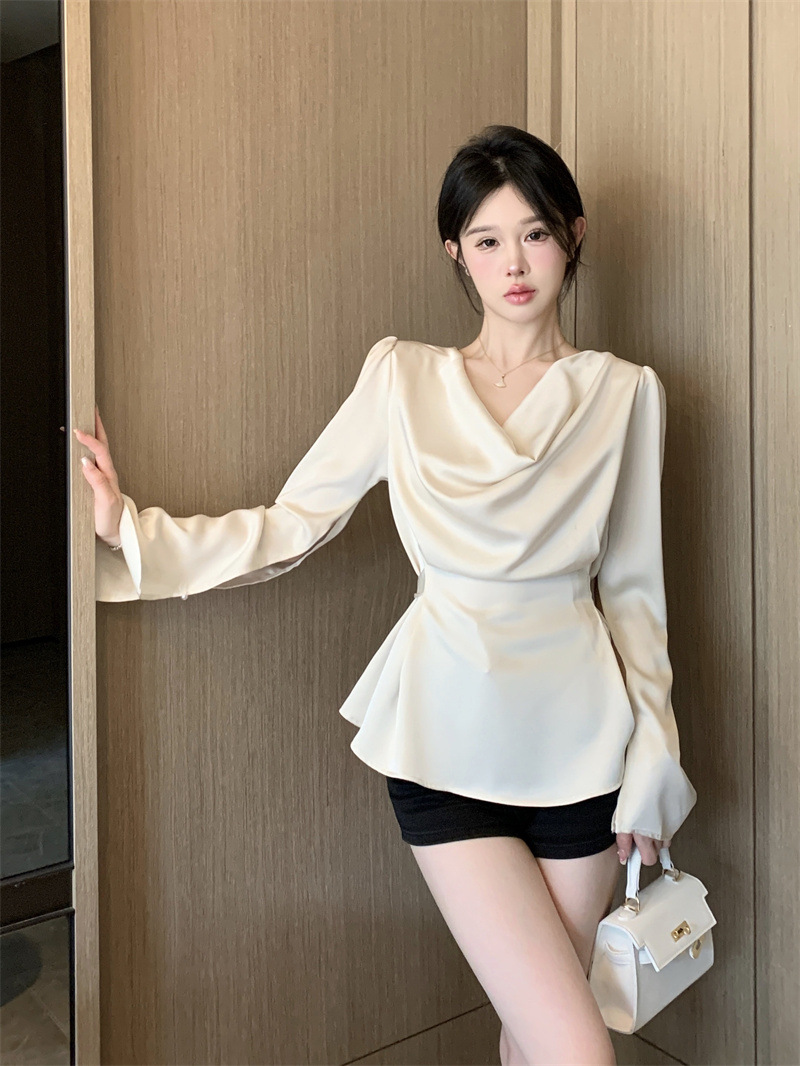 실크 새틴 우아한 긴팔 셔츠 여성용 봄 디자인 센스 스윙 칼라 레이스 업 셔츠 라이트 성숙한 프랑스 스타일 핀치 허리 탑