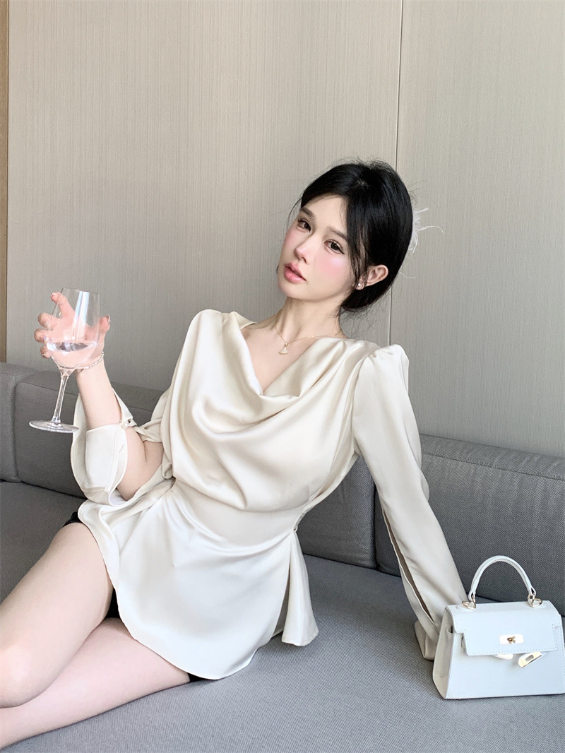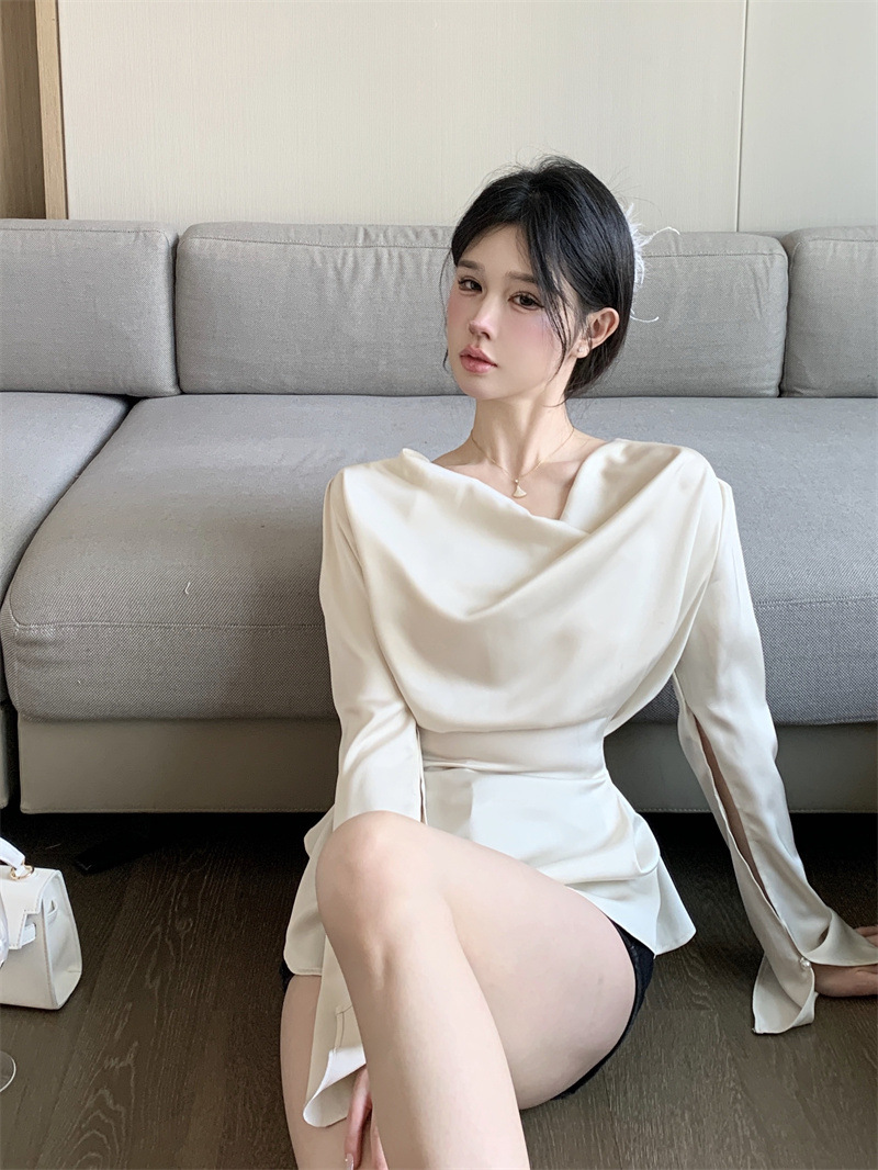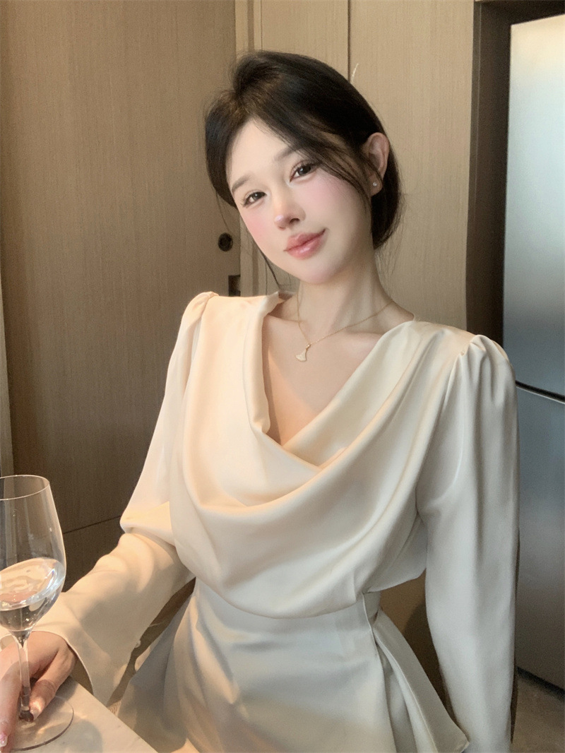실크 새틴 우아한 긴팔 셔츠 여성용 봄 디자인 센스 스윙 칼라 레이스 업 셔츠 라이트 성숙한 프랑스 스타일 핀치 허리 탑스토어 가기