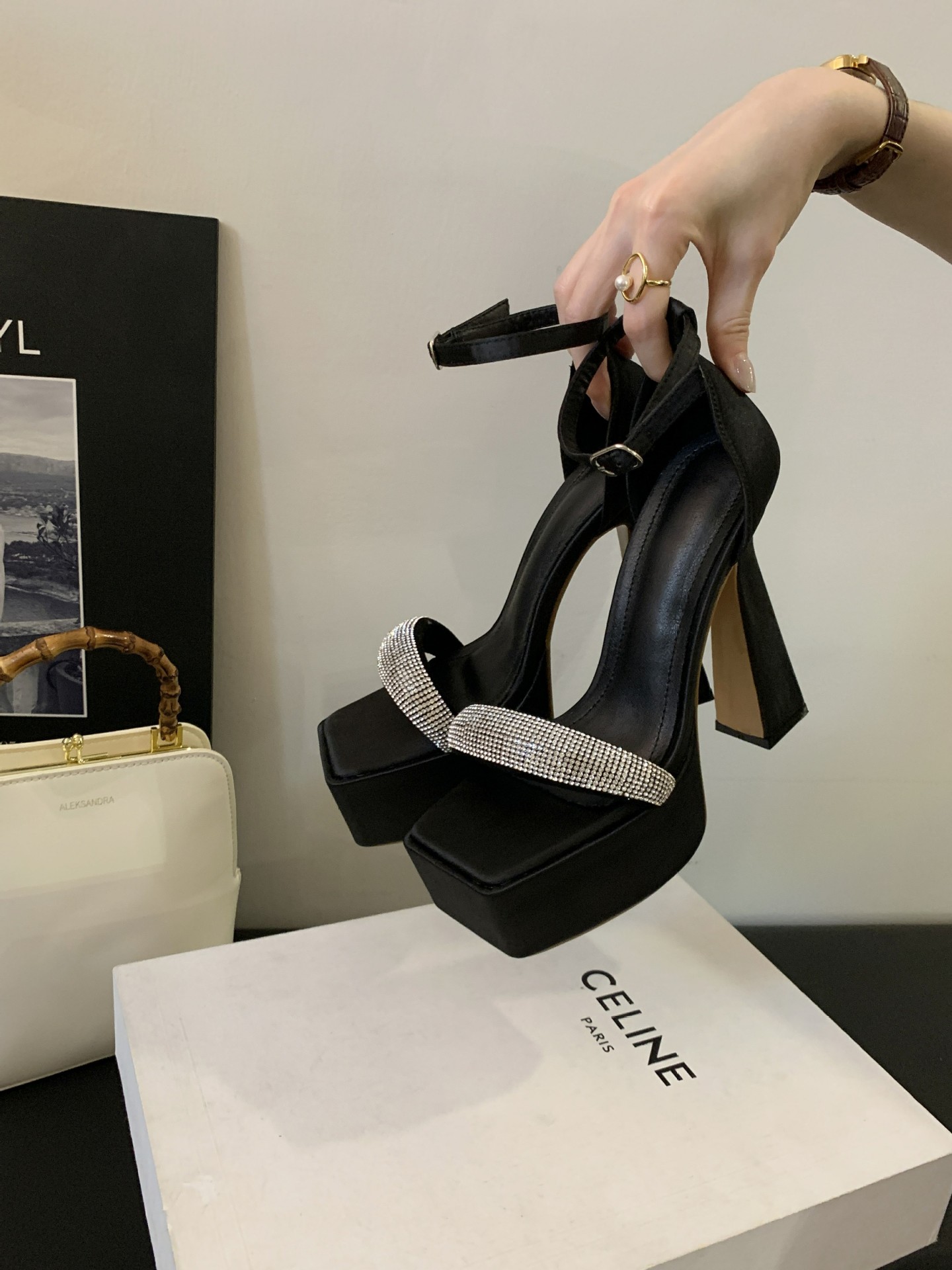 새로운 도착 2024 여름 올매치 라인스톤 블랙 하이힐 샌들 한국 여성 신발 35-40스토어 가기