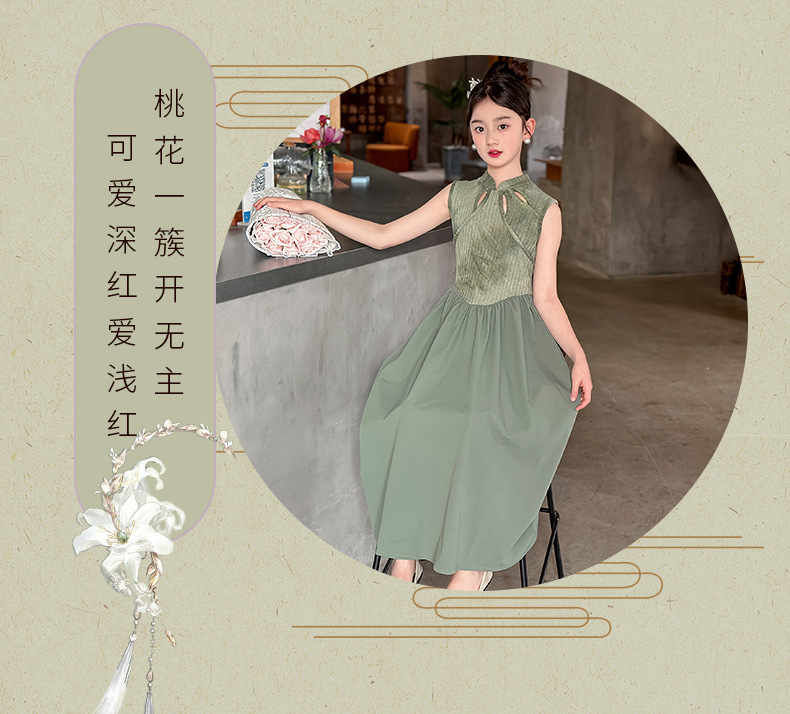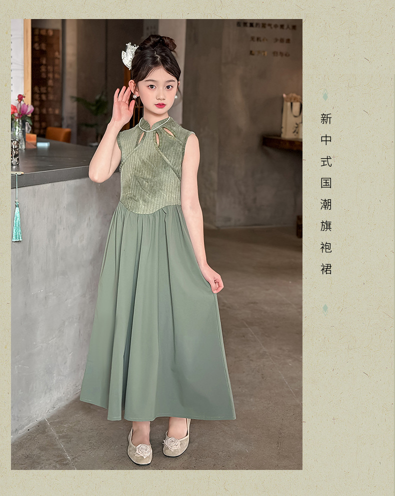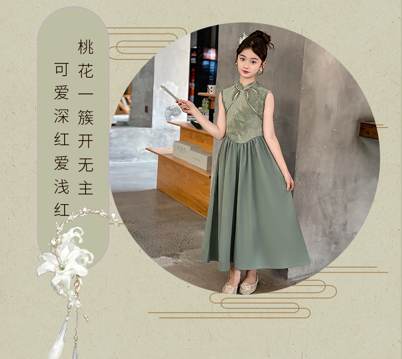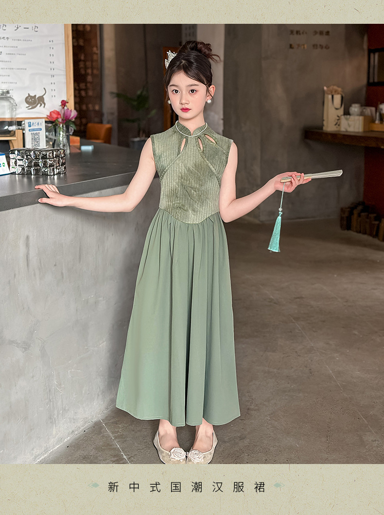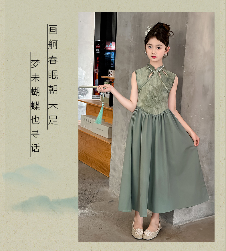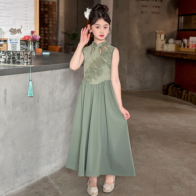여자 여름 원피스 2024 새로운 스타일 서양식 아동복 국가 스타일 청삼 원피스 어린이 여름 원피스 민소매 긴 원피스