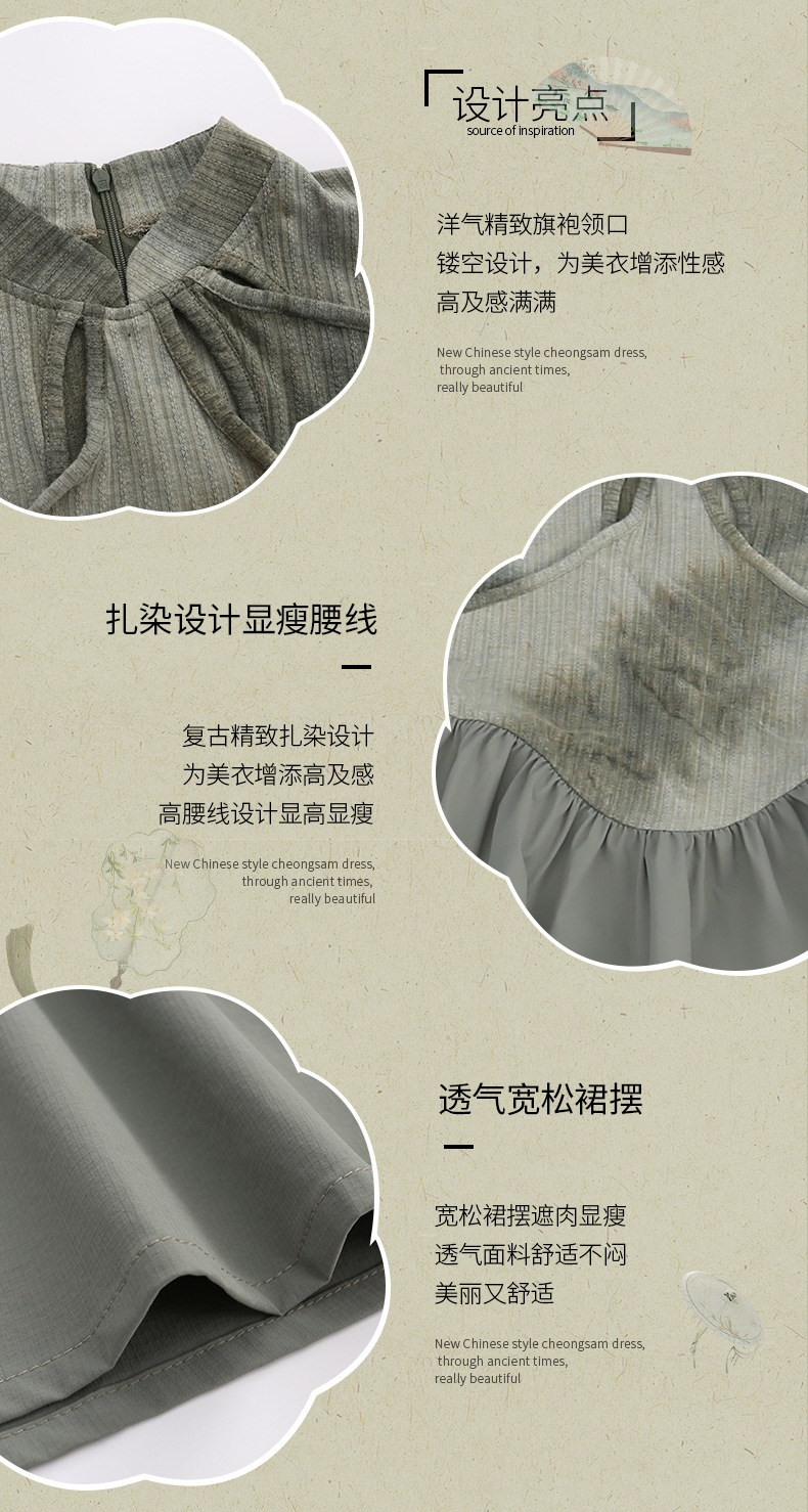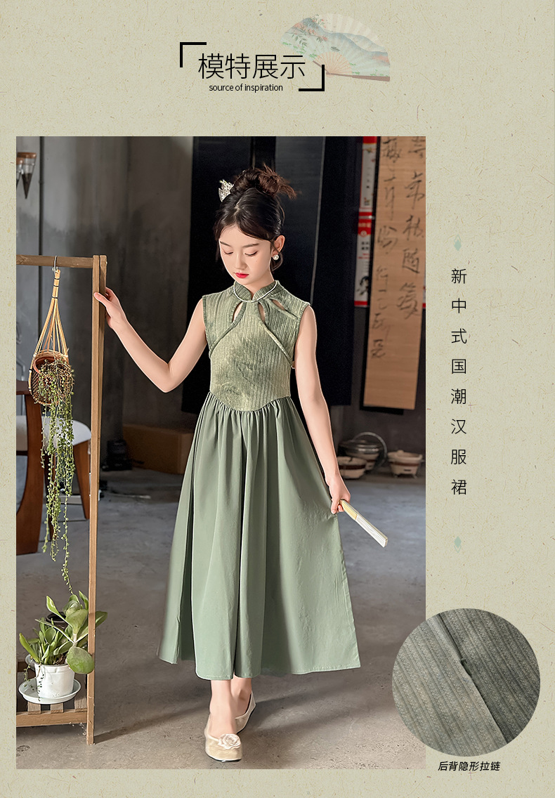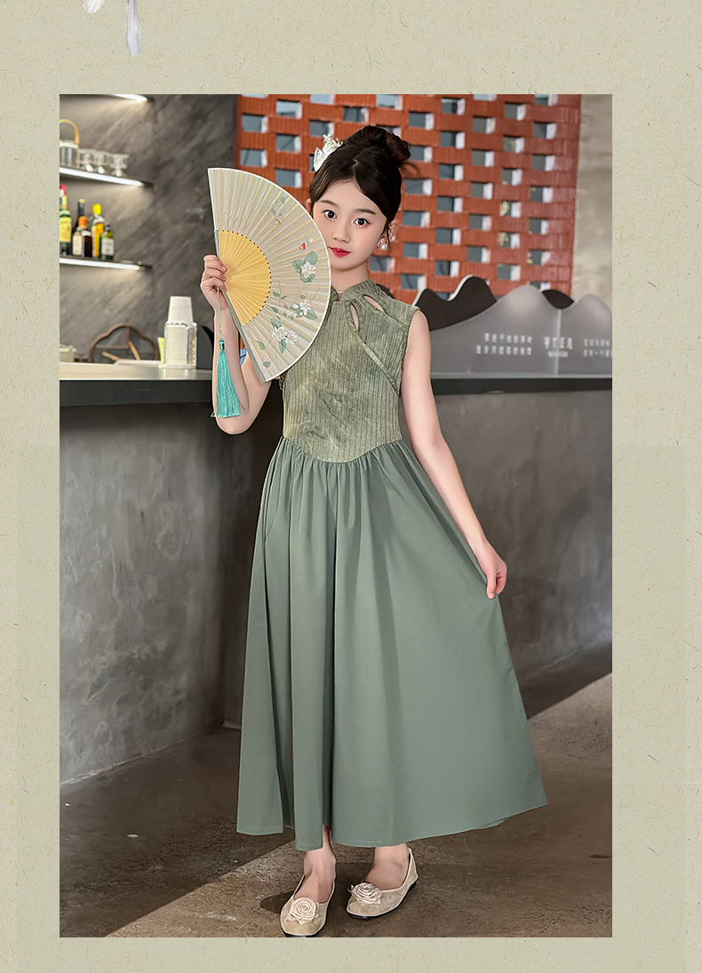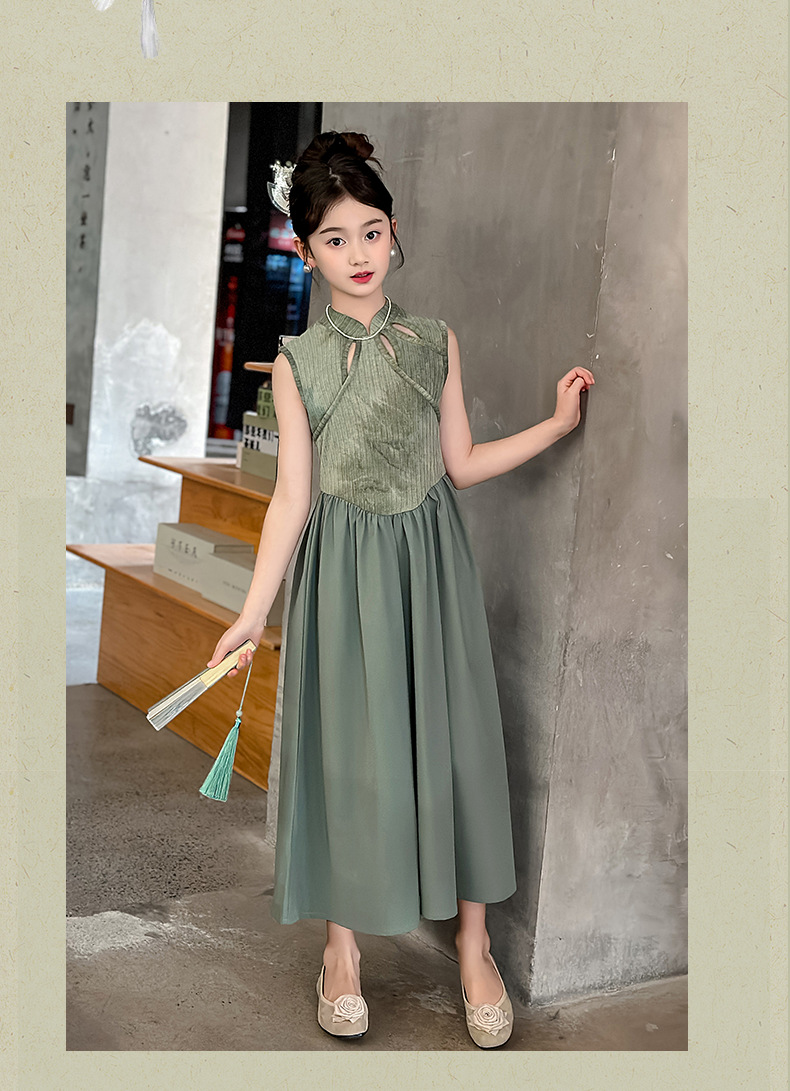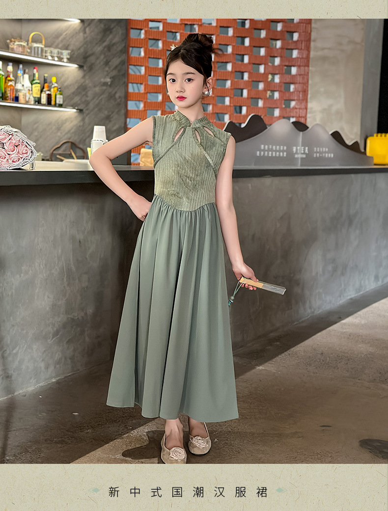 여자 여름 원피스 2024 새로운 스타일 서양식 아동복 국가 스타일 청삼 원피스 어린이 여름 원피스 민소매 긴 원피스