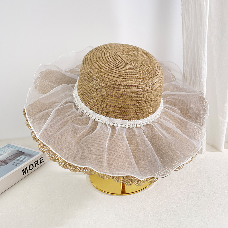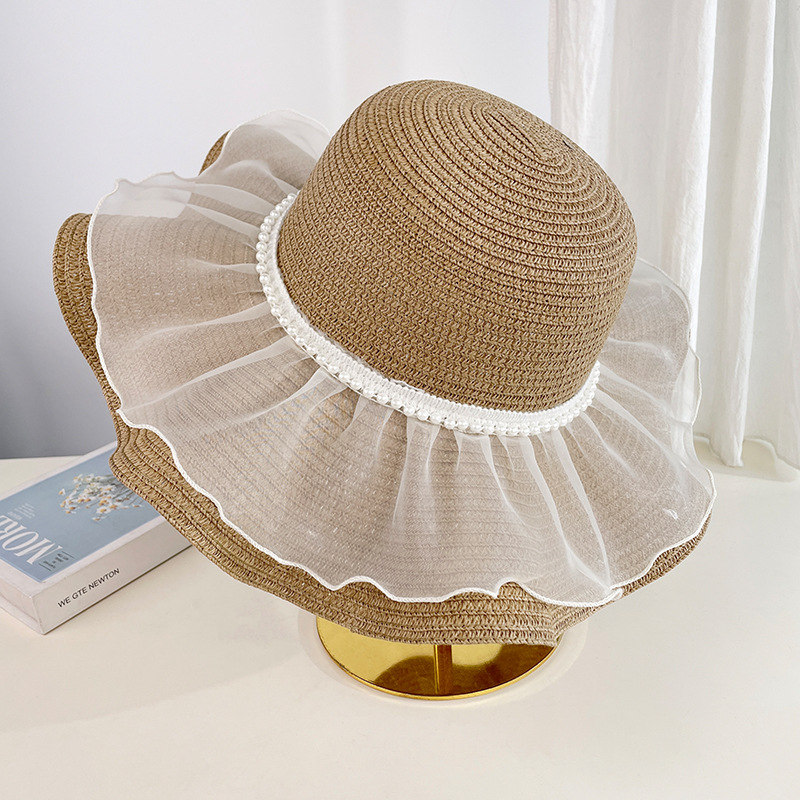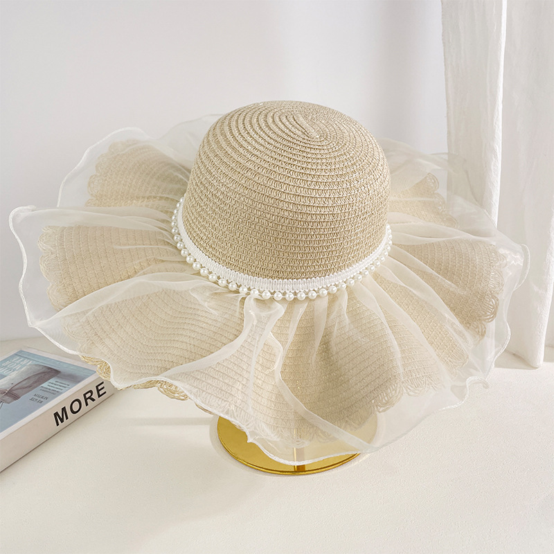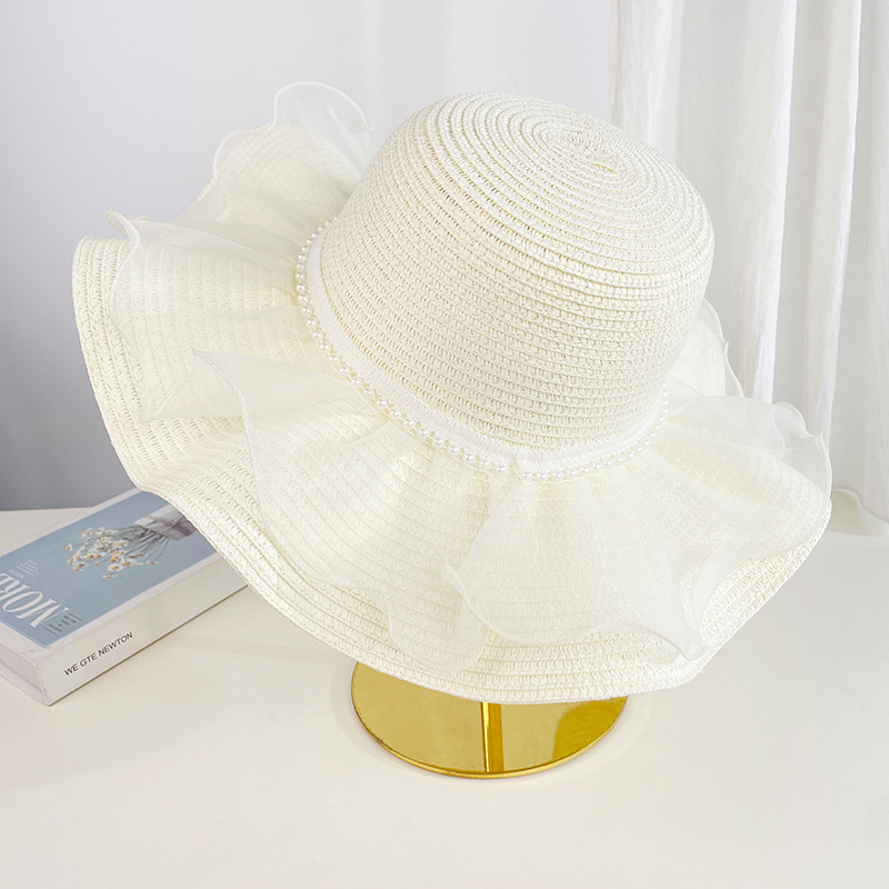 • D- 528m 컬러 진주 망사 물결 레이스 밀짚모