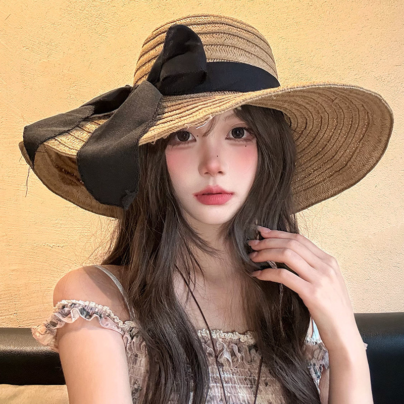 日系棉麻蝴蝶结渔夫帽子女夏季大檐防晒盆帽透气轻薄后开叉遮阳帽