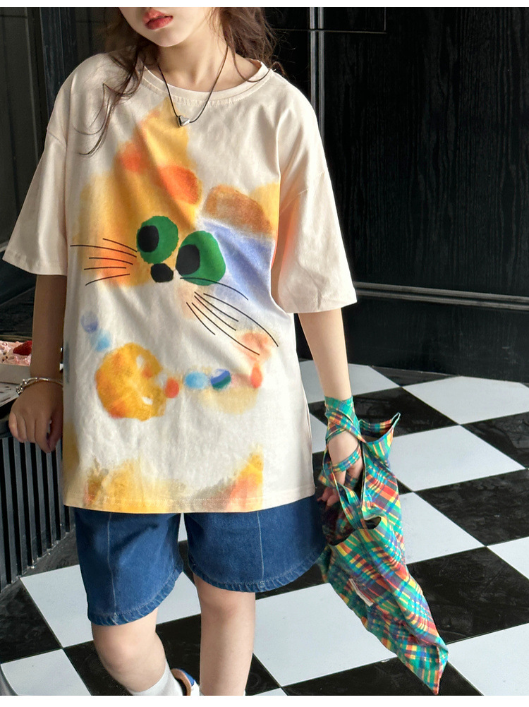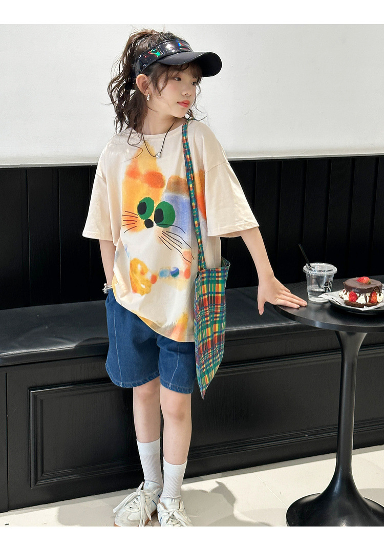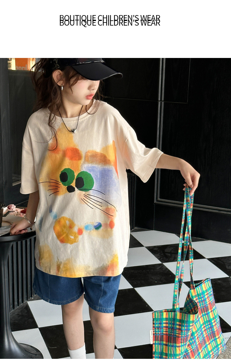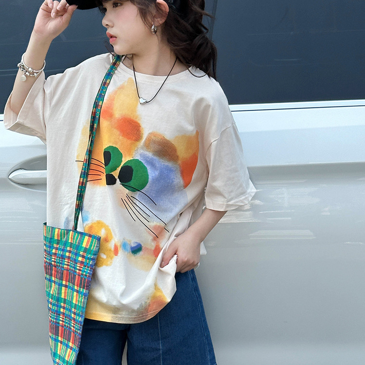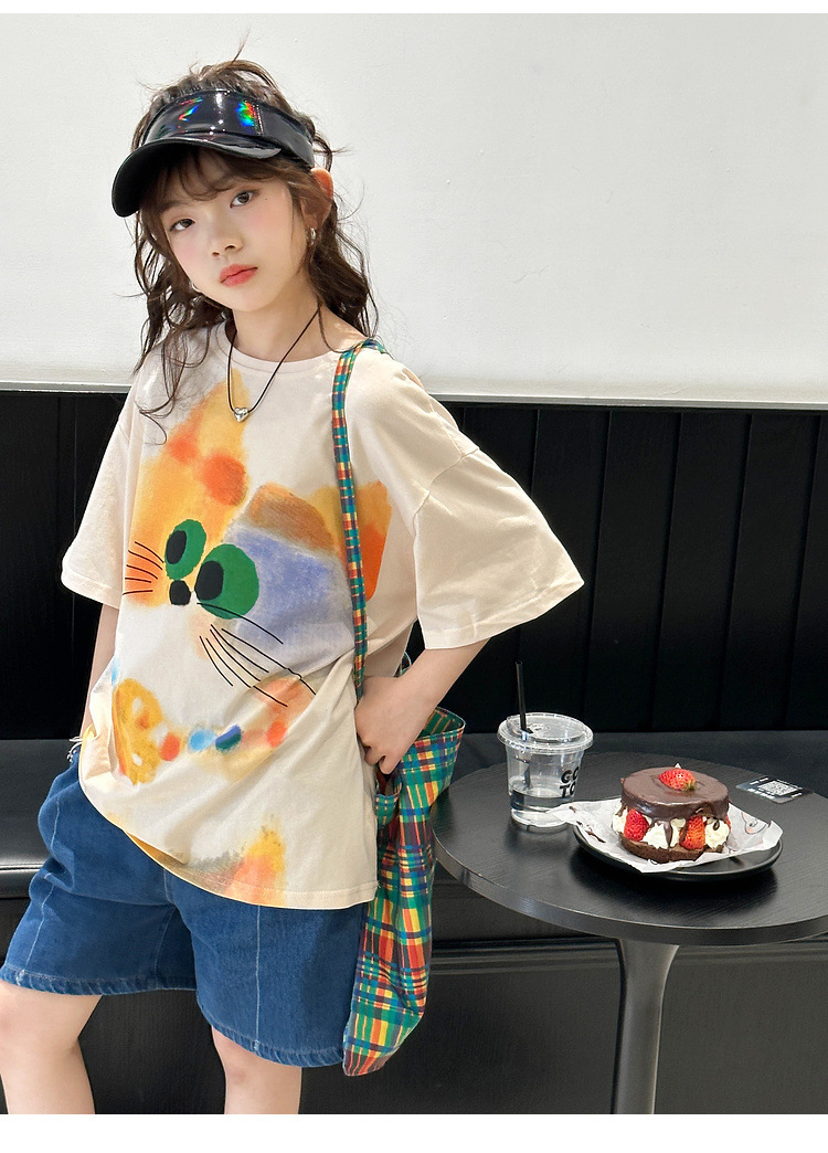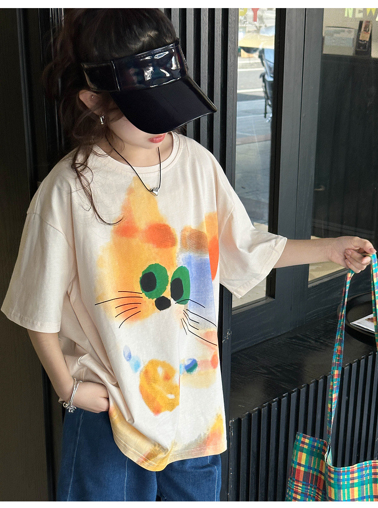 여자 반팔 티셔츠 여름 2025 새로운 큰 어린이 여름 스타일 만화 탑 어린이 한국 스타일 유행 여름 옷스토어 가기