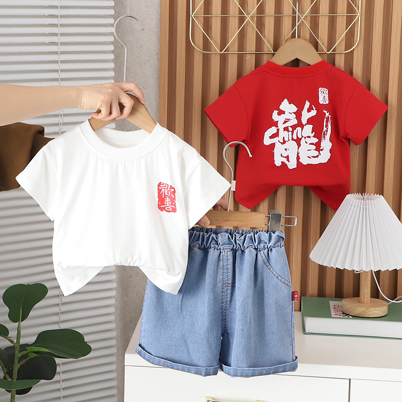 2024 남자 아기 여름 세트 새로운 스타일 소년 여름 잘 생긴 반팔 어린이 반팔 데님 반바지