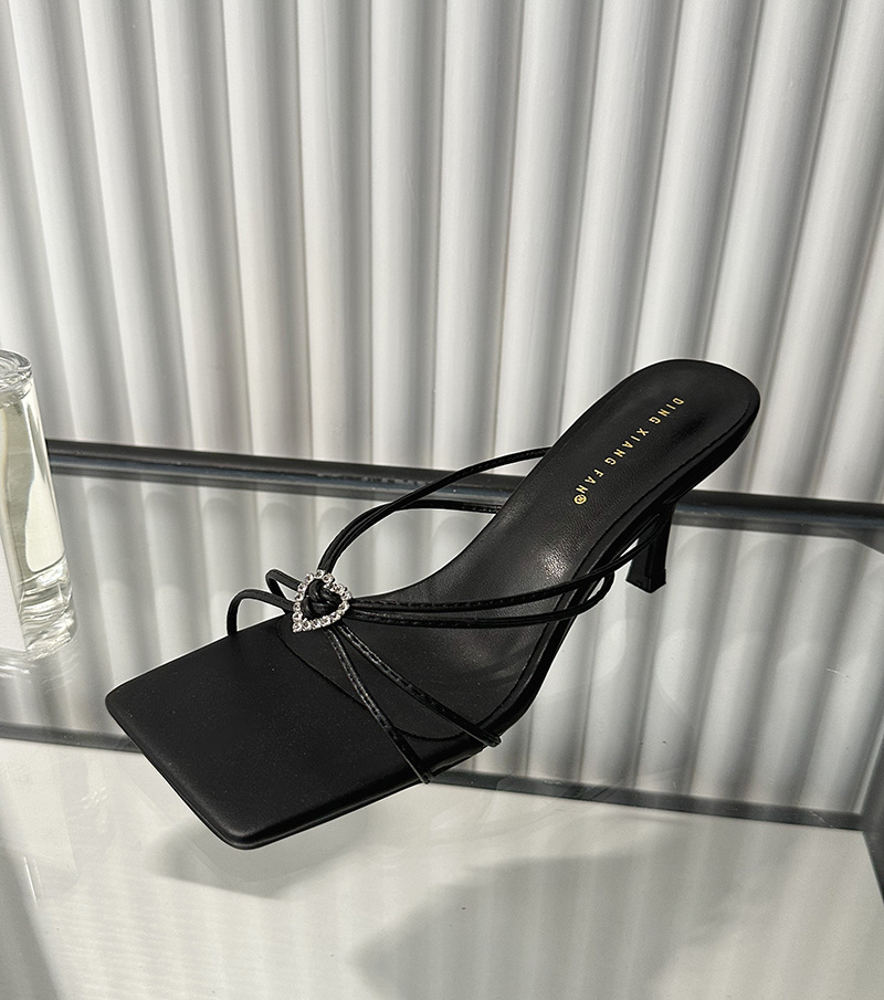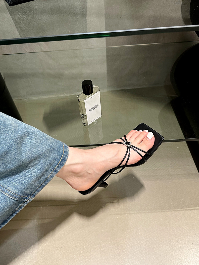 2023 년 여름 매일 올 매치 스퀘어 헤드 얇은 스트랩 샌들 패션 달콤한 사랑 다이아몬드 버클 하이힐 여성 신발스토어 가기