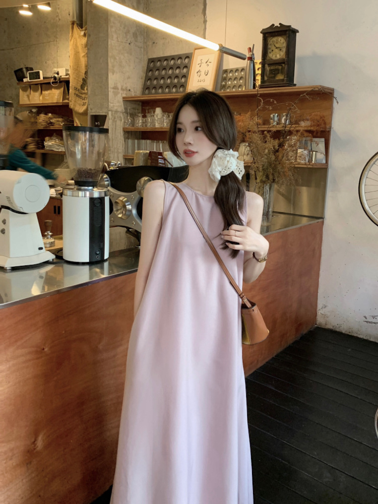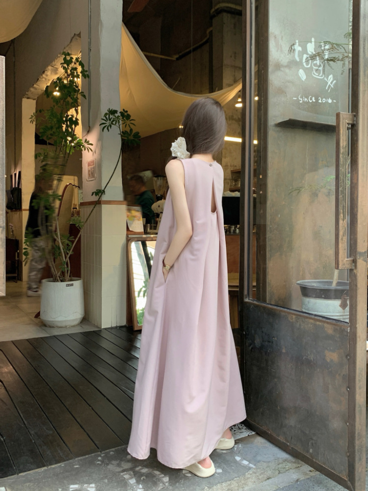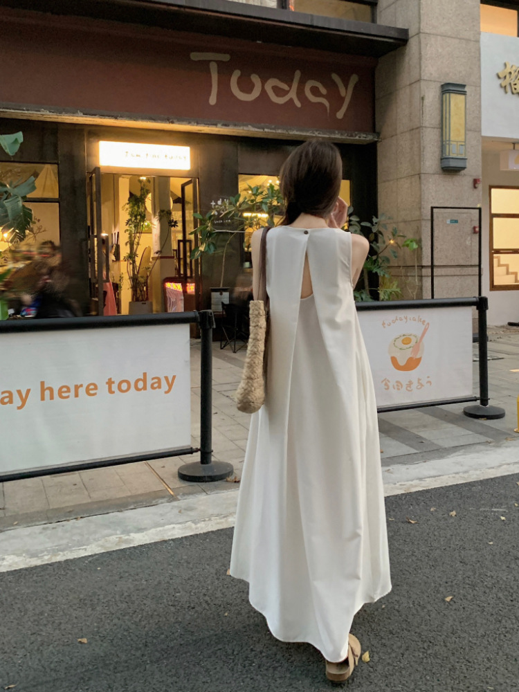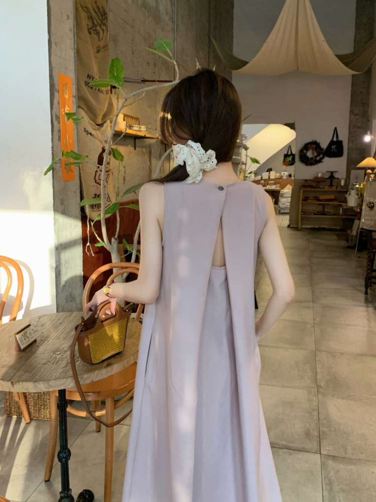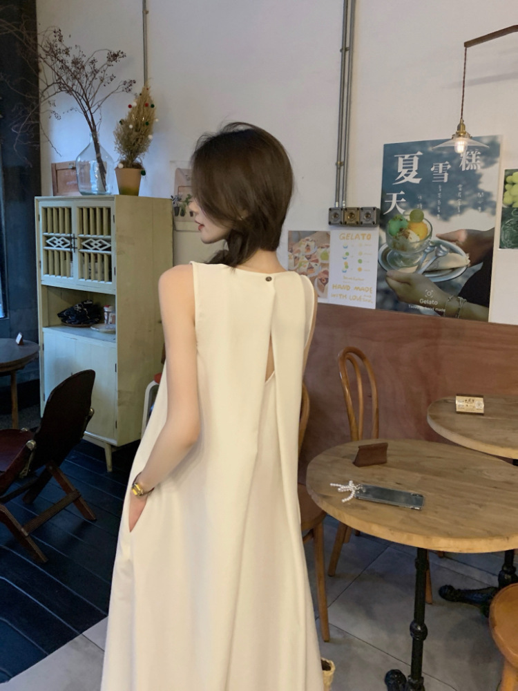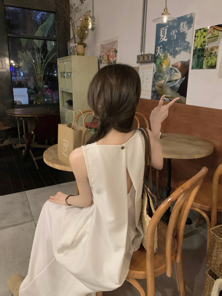 리얼 샷 우아한 민소매 솔리드 컬러 원피스 느슨한 백 할로우 디자인 센스 라운드 넥 간단한 선박 원피스 63202스토어 가기