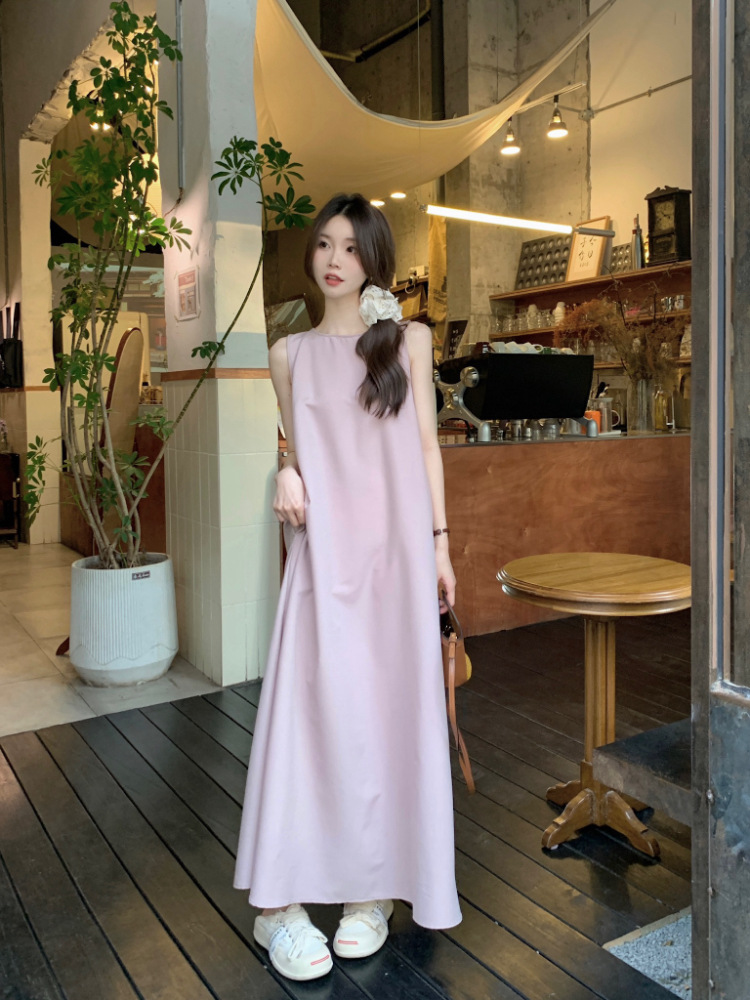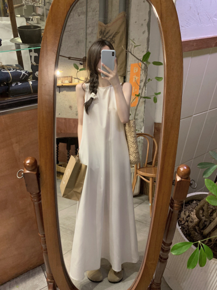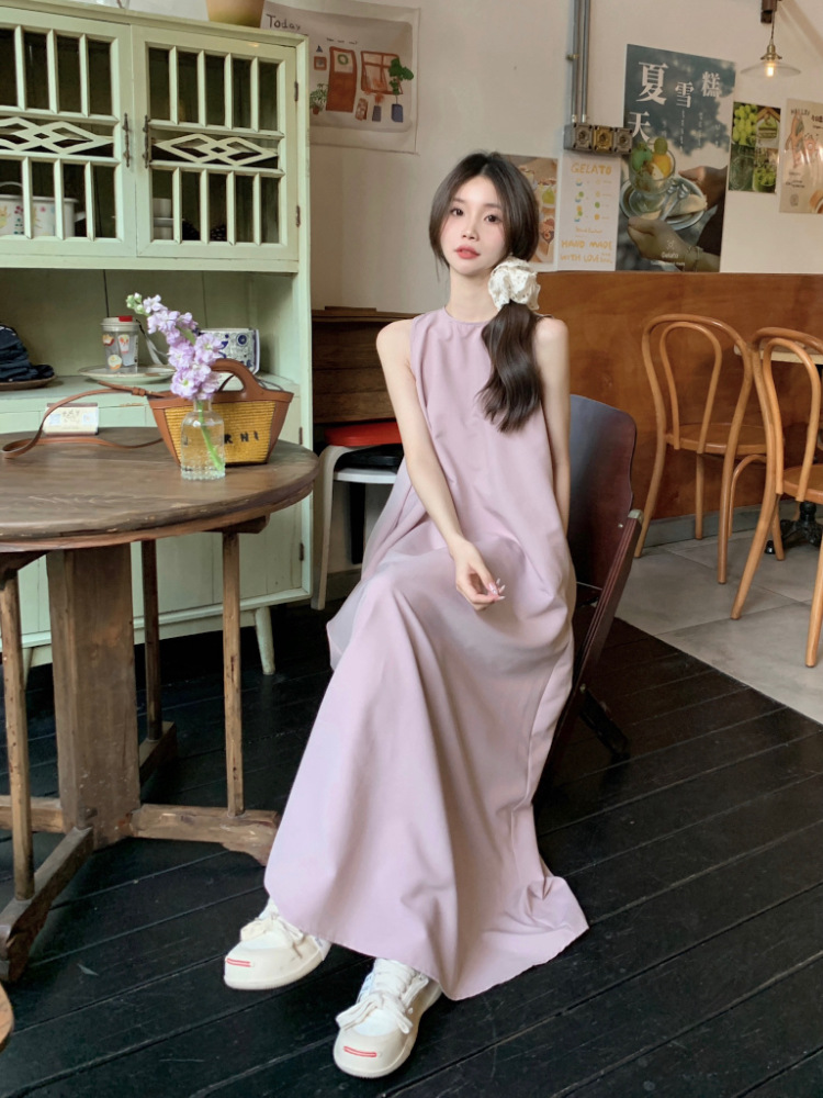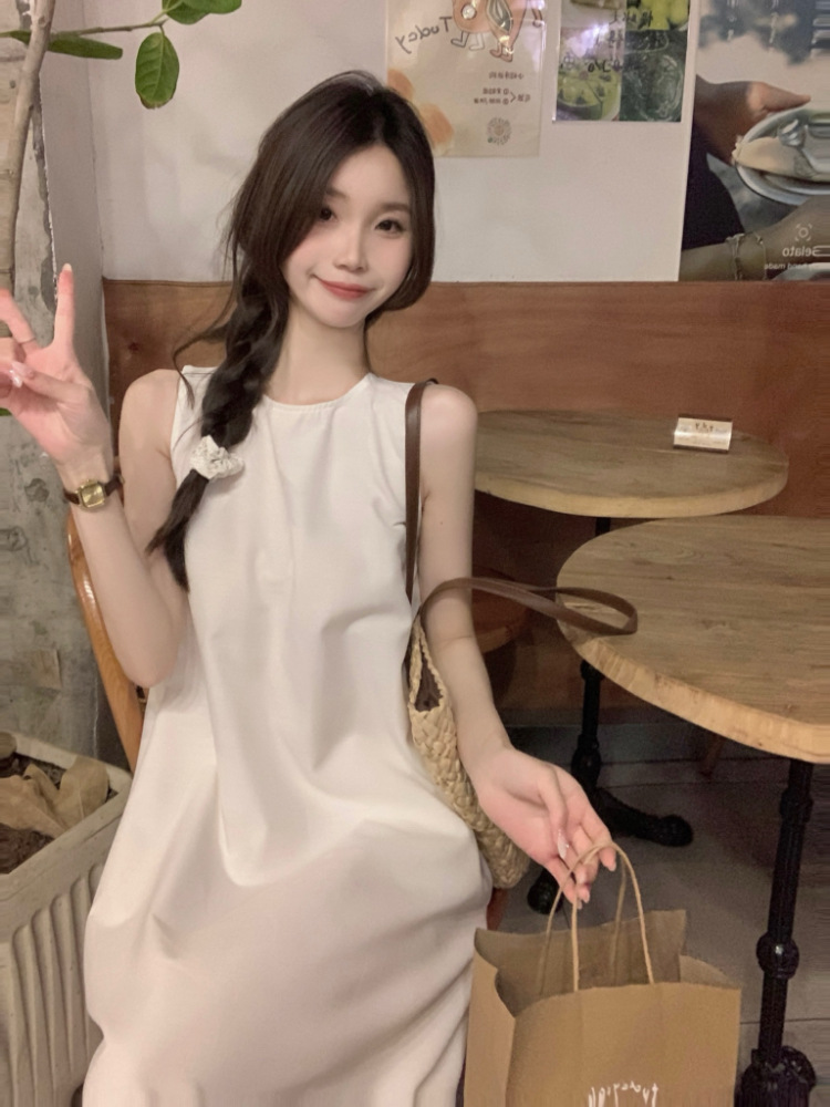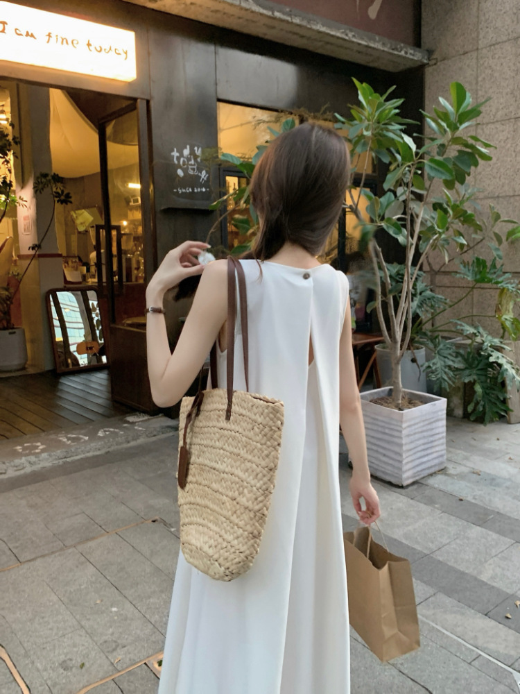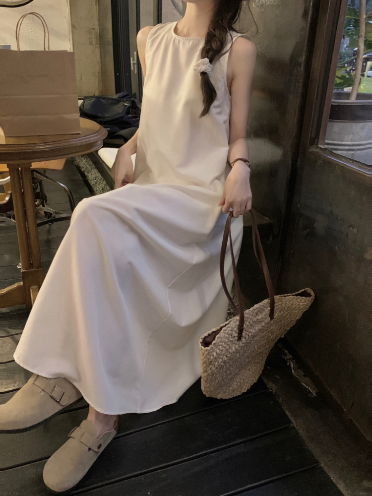 리얼 샷 우아한 민소매 솔리드 컬러 원피스 느슨한 백 할로우 디자인 센스 라운드 넥 간단한 선박 원피스 63202스토어 가기