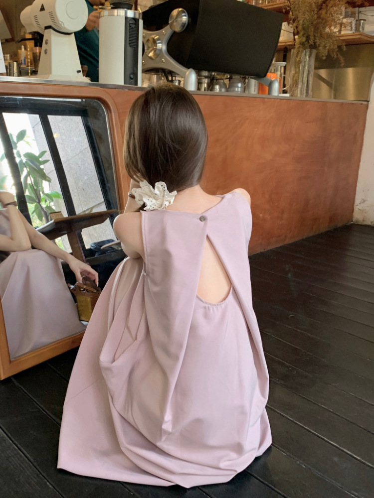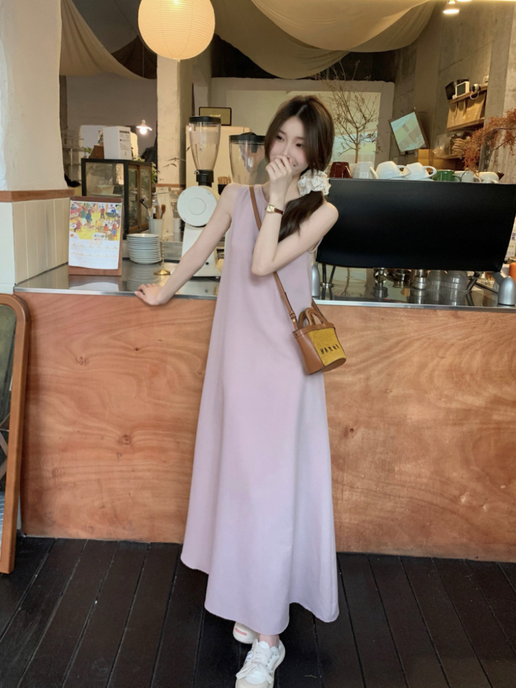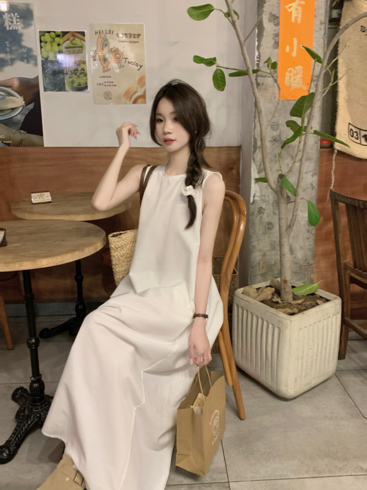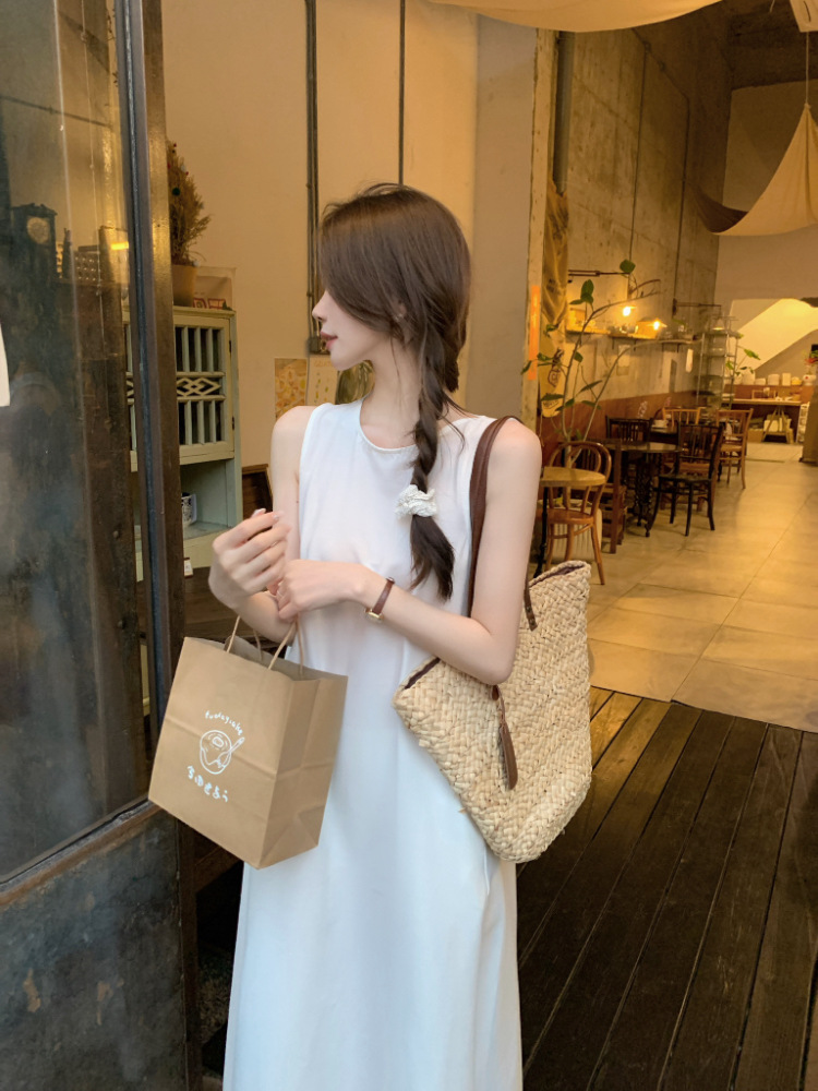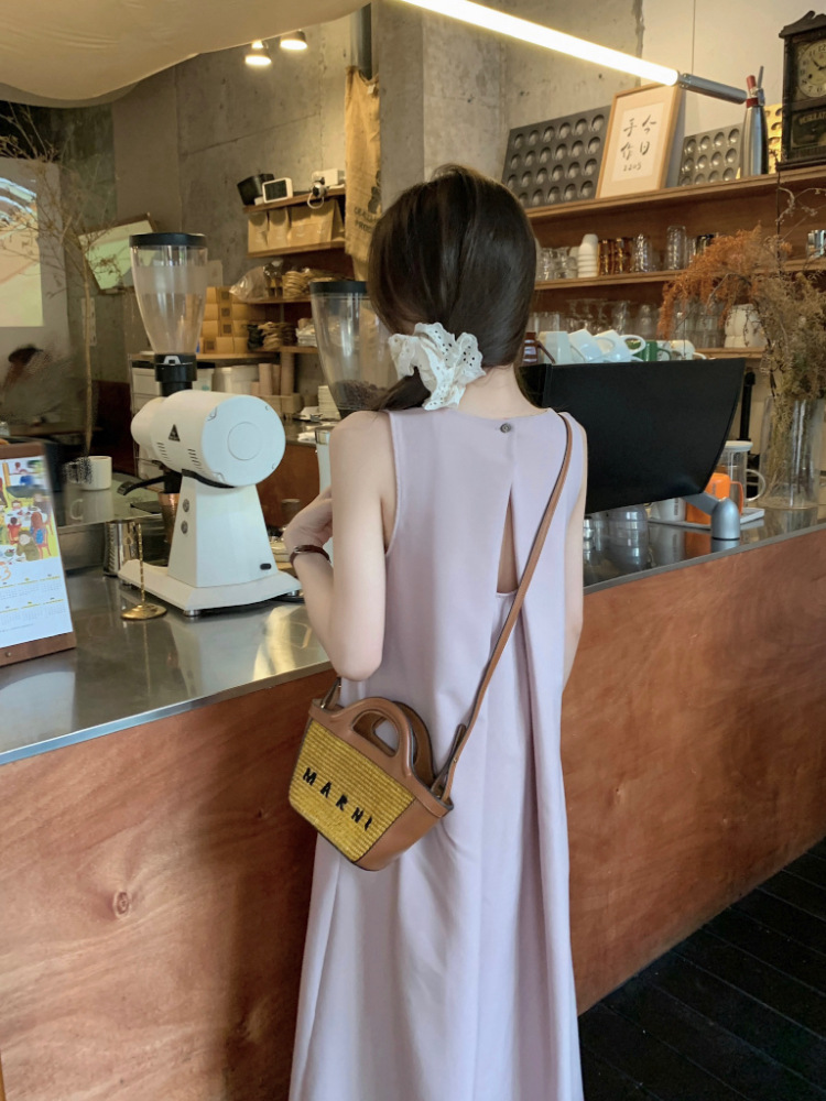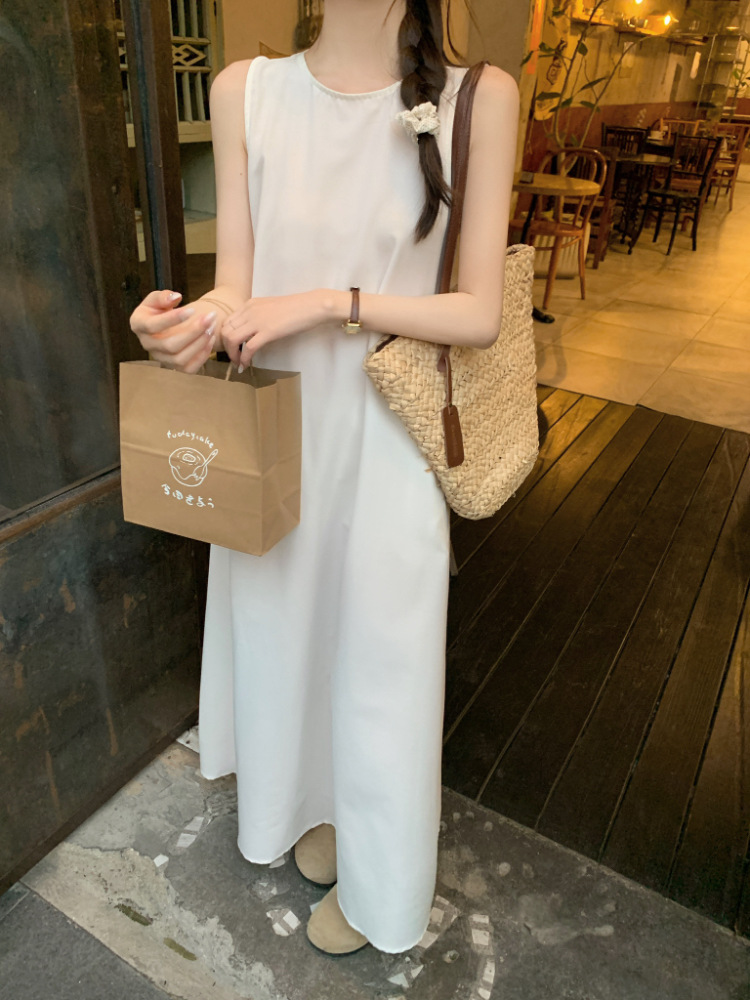 리얼 샷 우아한 민소매 솔리드 컬러 원피스 느슨한 백 할로우 디자인 센스 라운드 넥 간단한 선박 원피스 63202스토어 가기