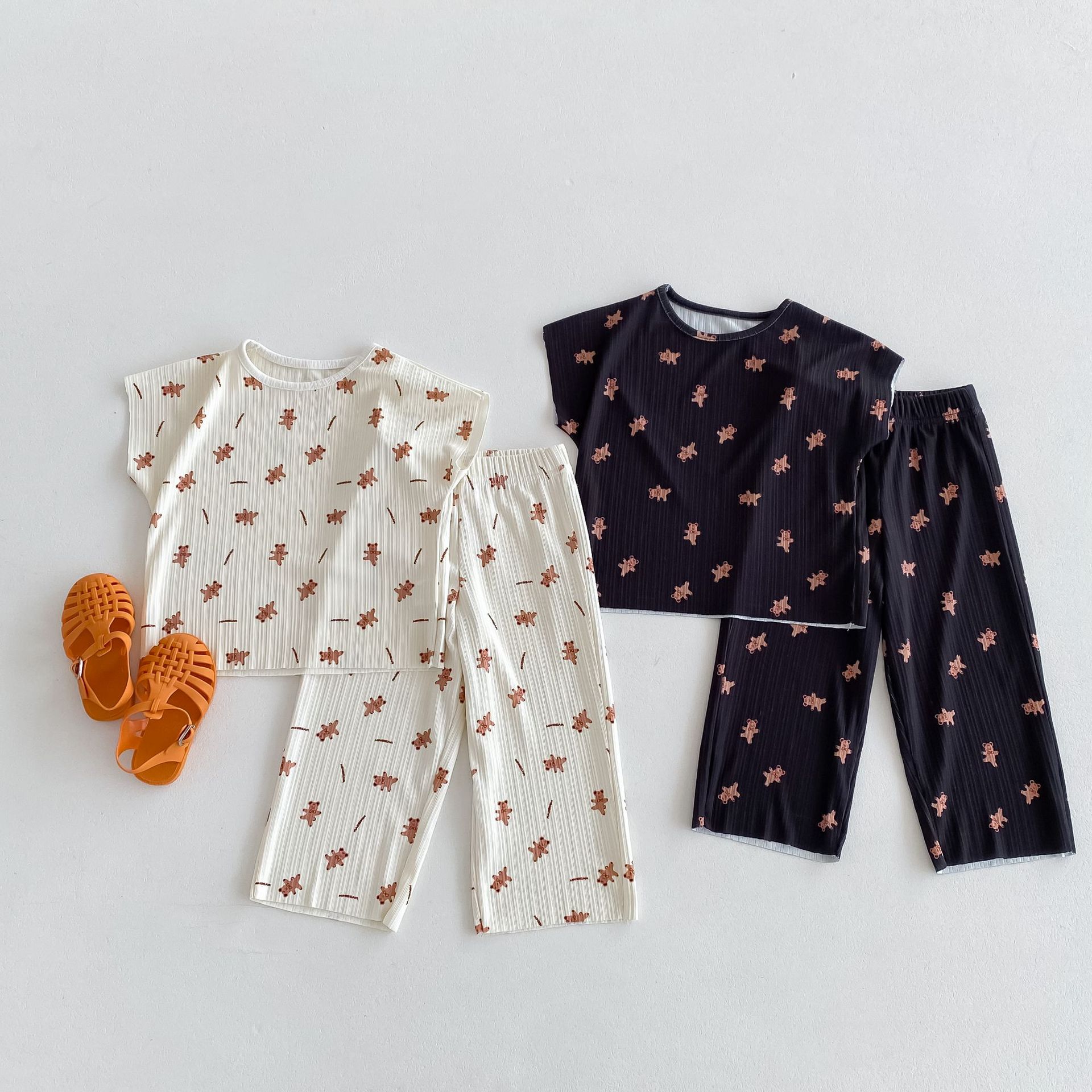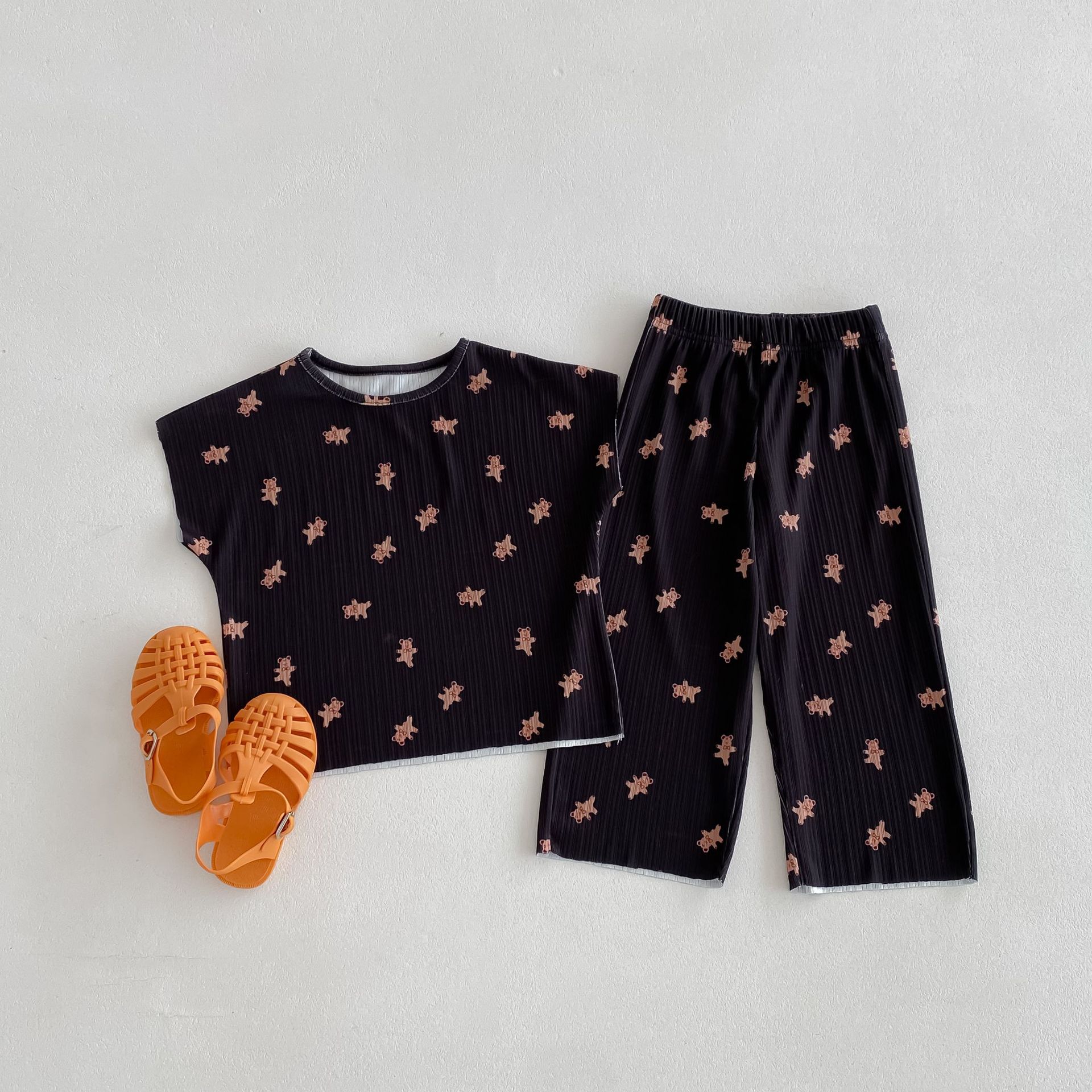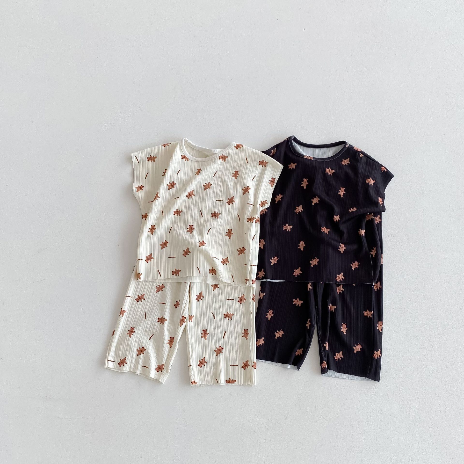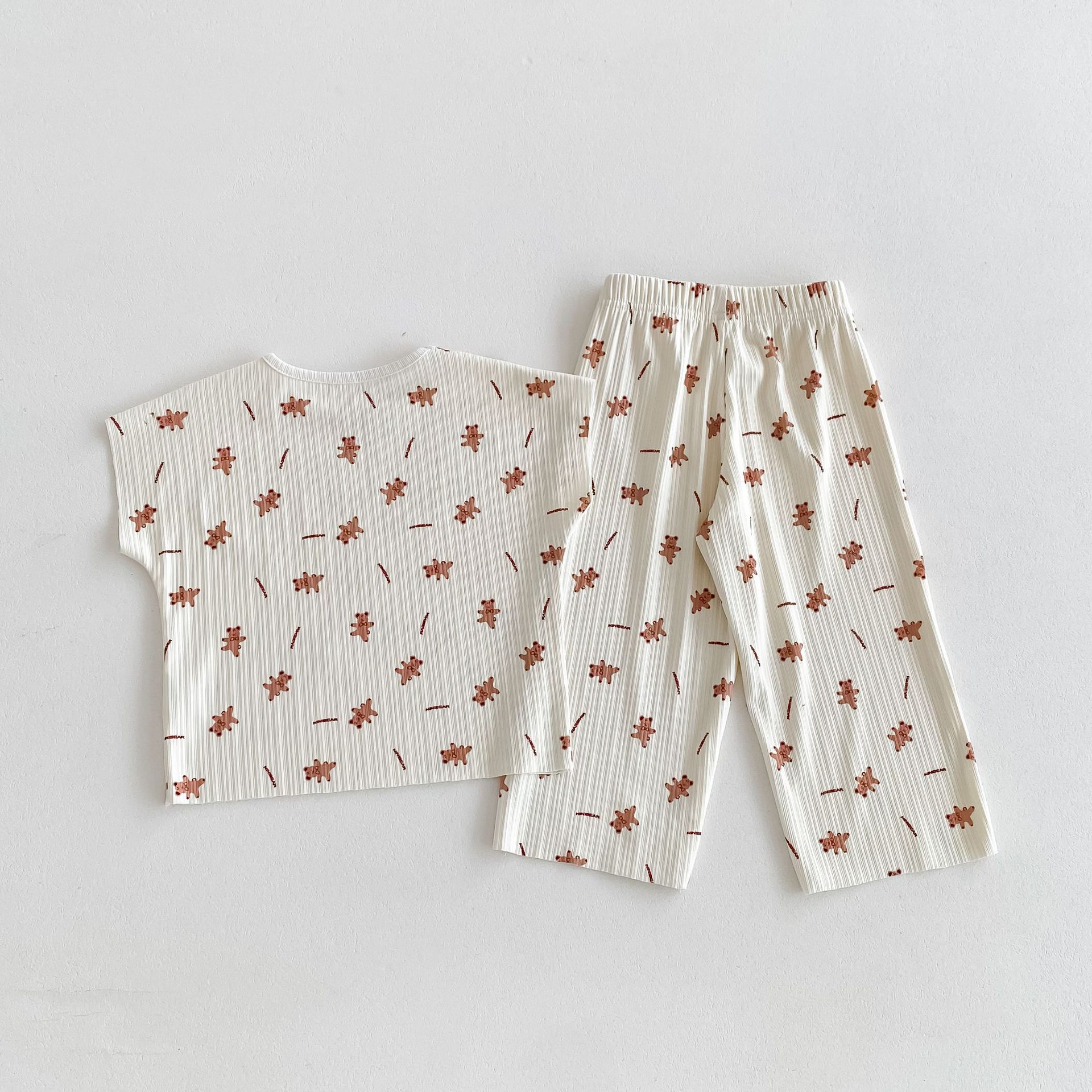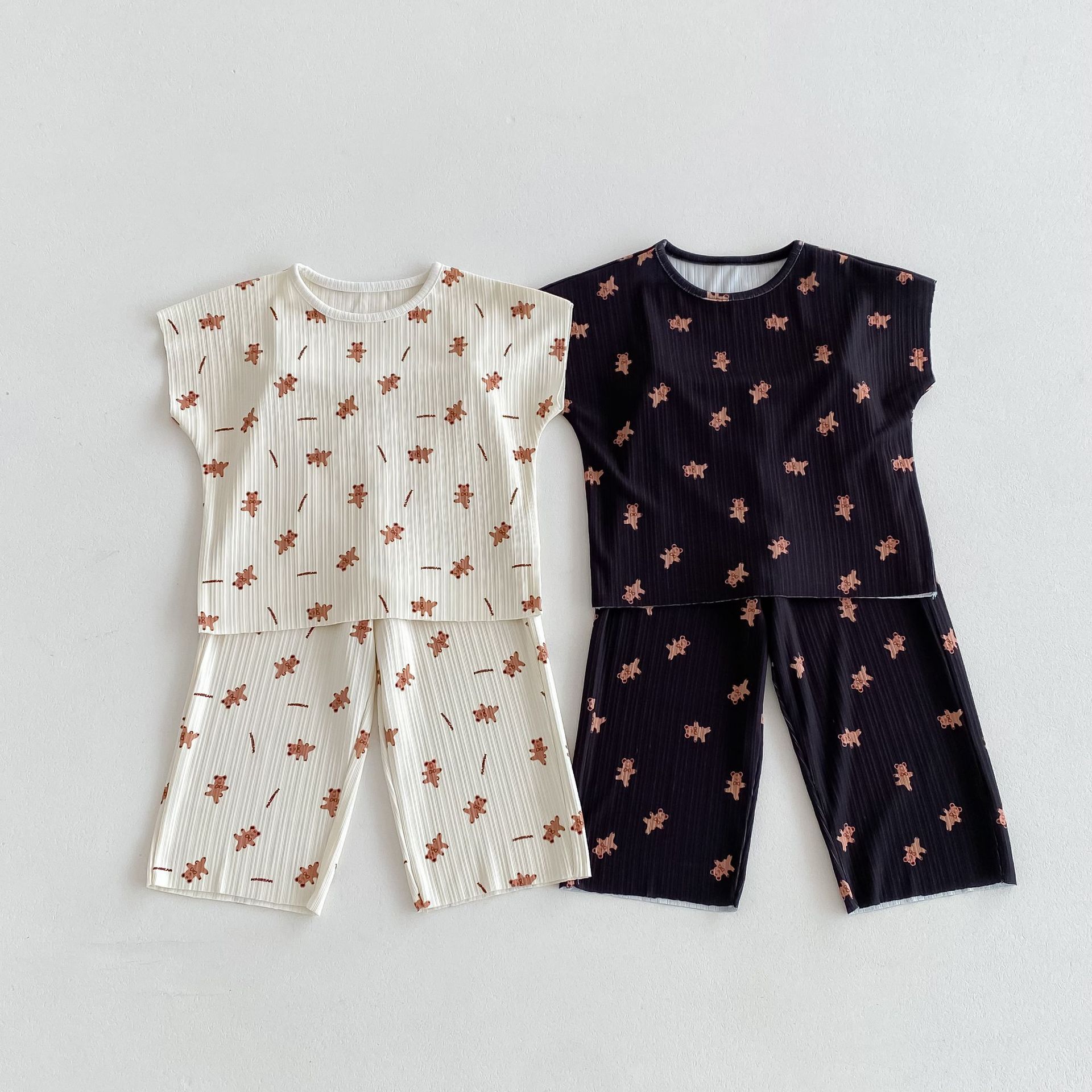 여름 새 2024 년 어린이 한국 에어컨 의류 귀여운 곰 Pleated 소년 소녀 여름 홈 세트