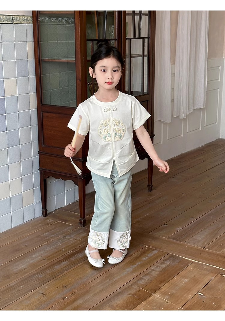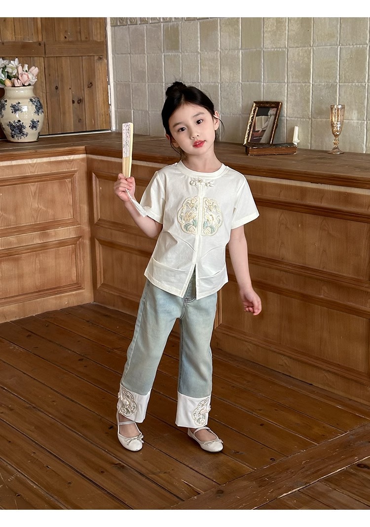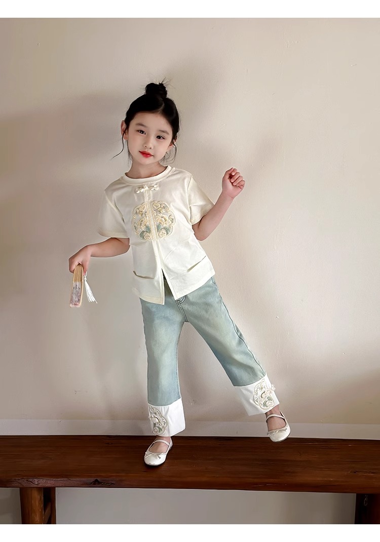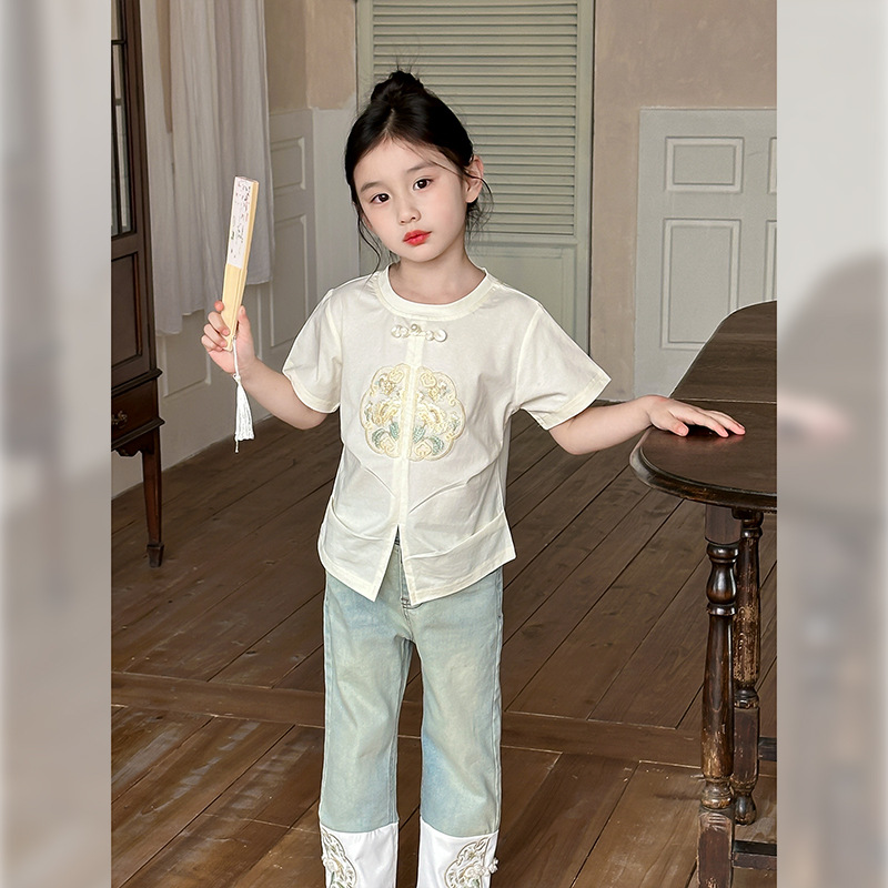 여자 티셔츠 2024 여름 새로운 어린이 국가 스타일 캐주얼 반팔 최고 여름 아기의 새로운 중국베이스 셔츠
