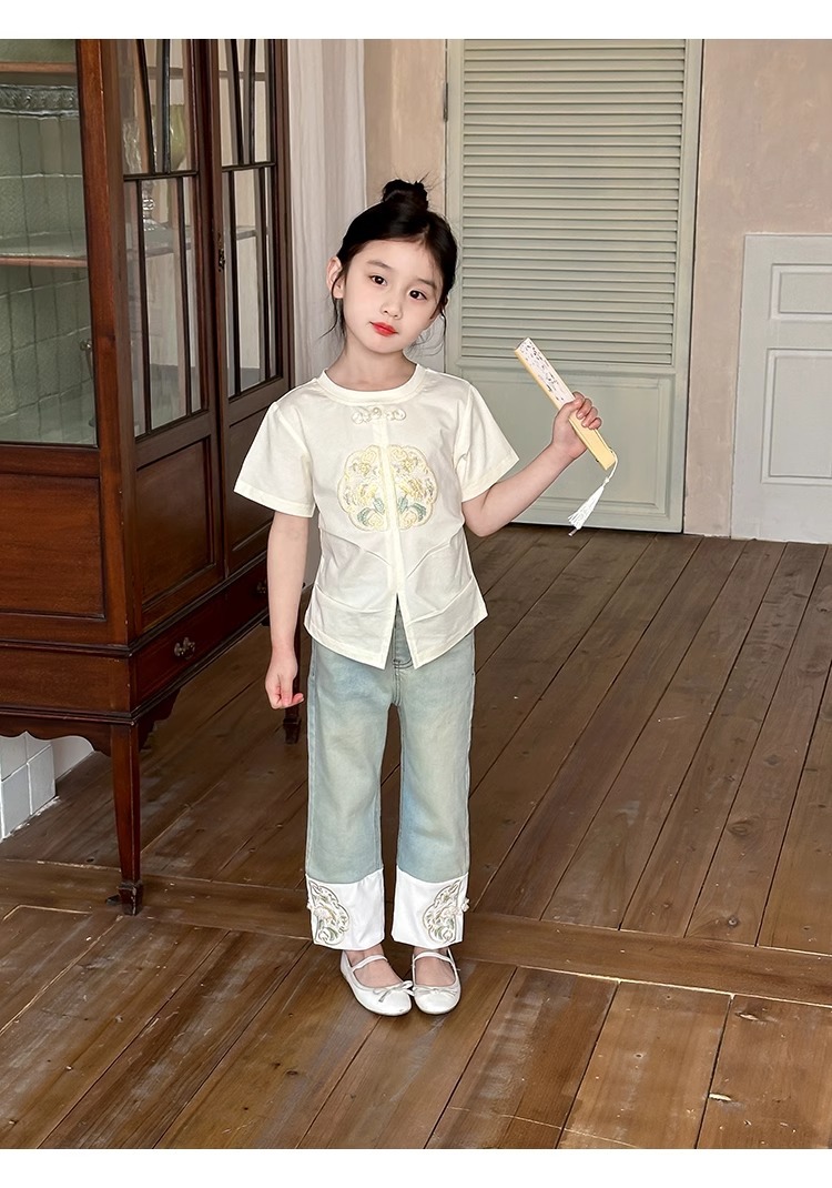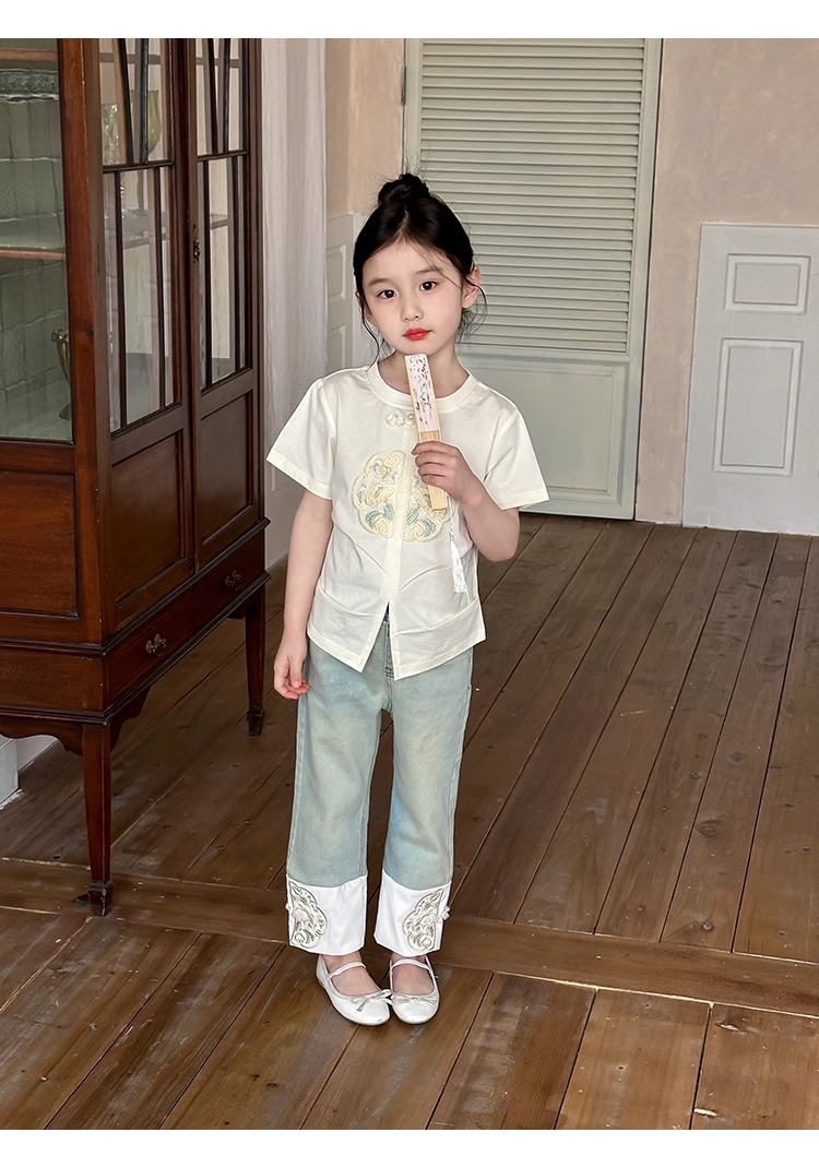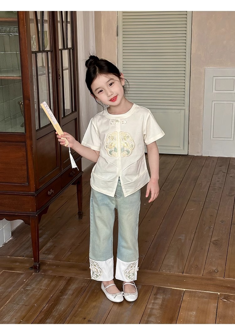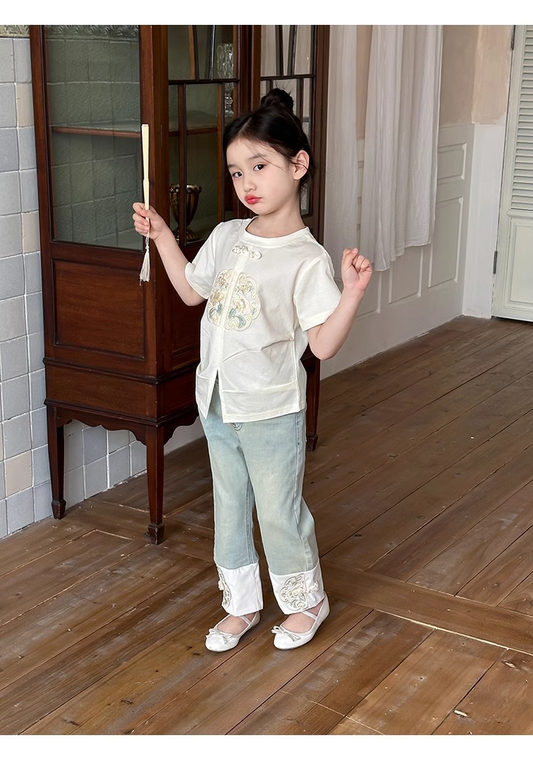 여자 티셔츠 2024 여름 새로운 어린이 국가 스타일 캐주얼 반팔 최고 여름 아기의 새로운 중국베이스 셔츠