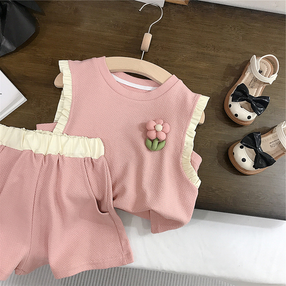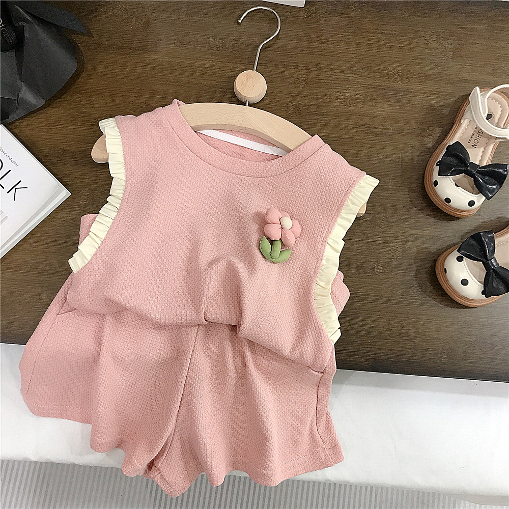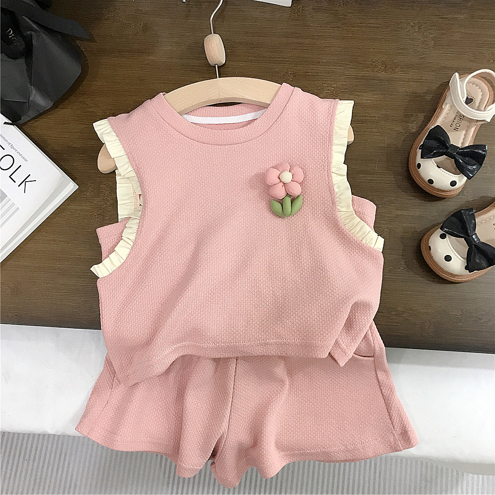 여성 어린이 패션 세트 서양식 여름 여름 새로운 얇은 민소매 반바지 외부 착용 아기 아이들의 유행 대외 무역스토어 가기