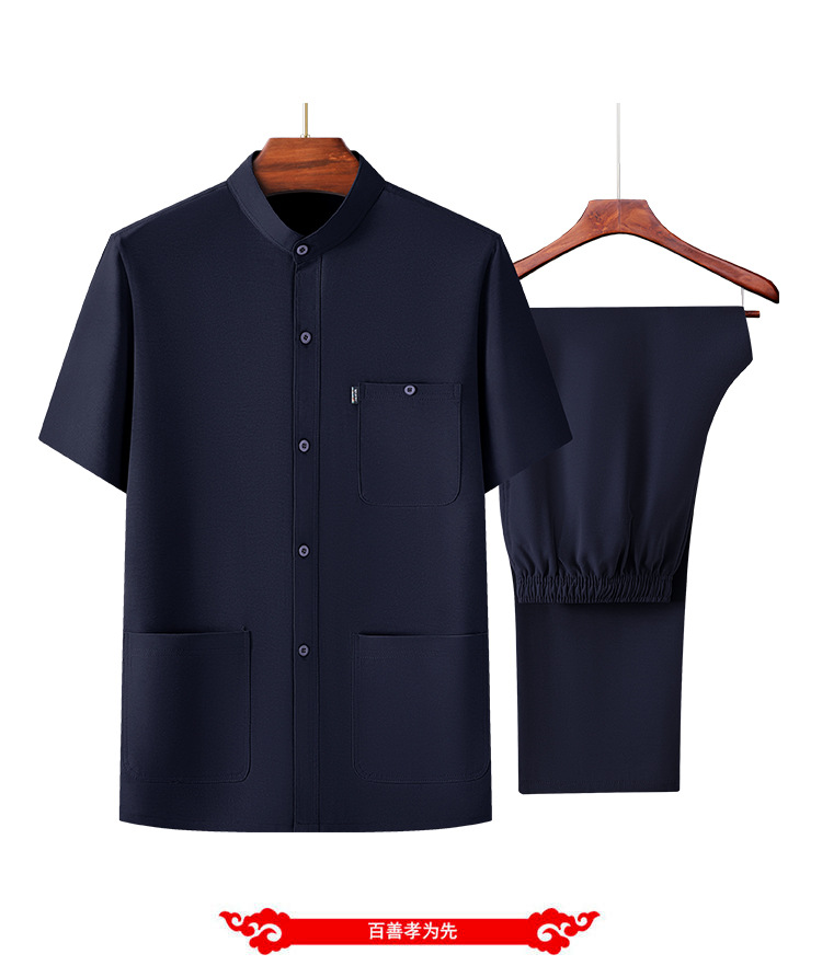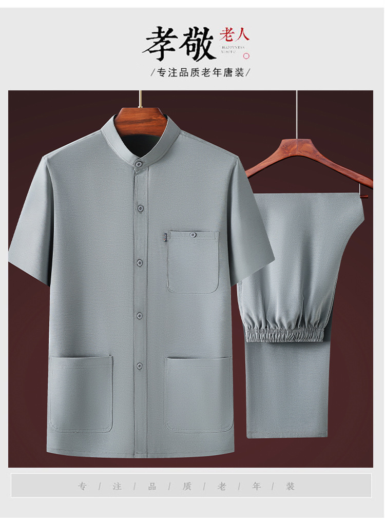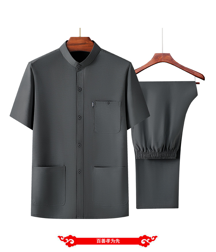 중년 및 노인 남성 여름 반팔 셔츠 스탠드 칼라 아버지의 노인을위한 얇은 세트 투피스 올 매치 셔츠