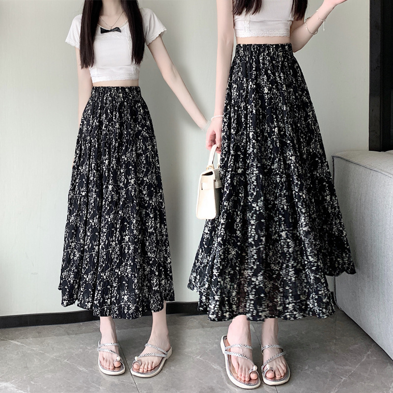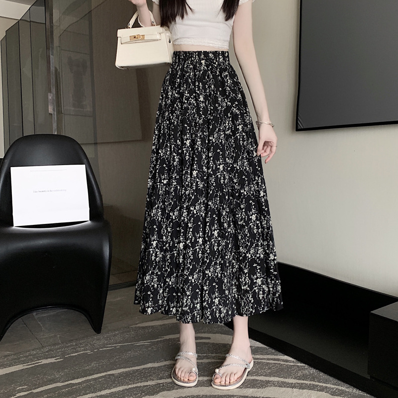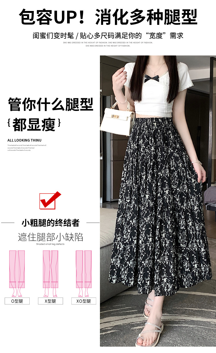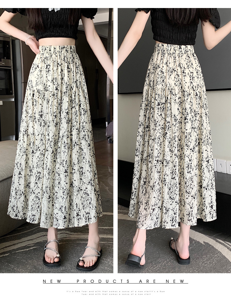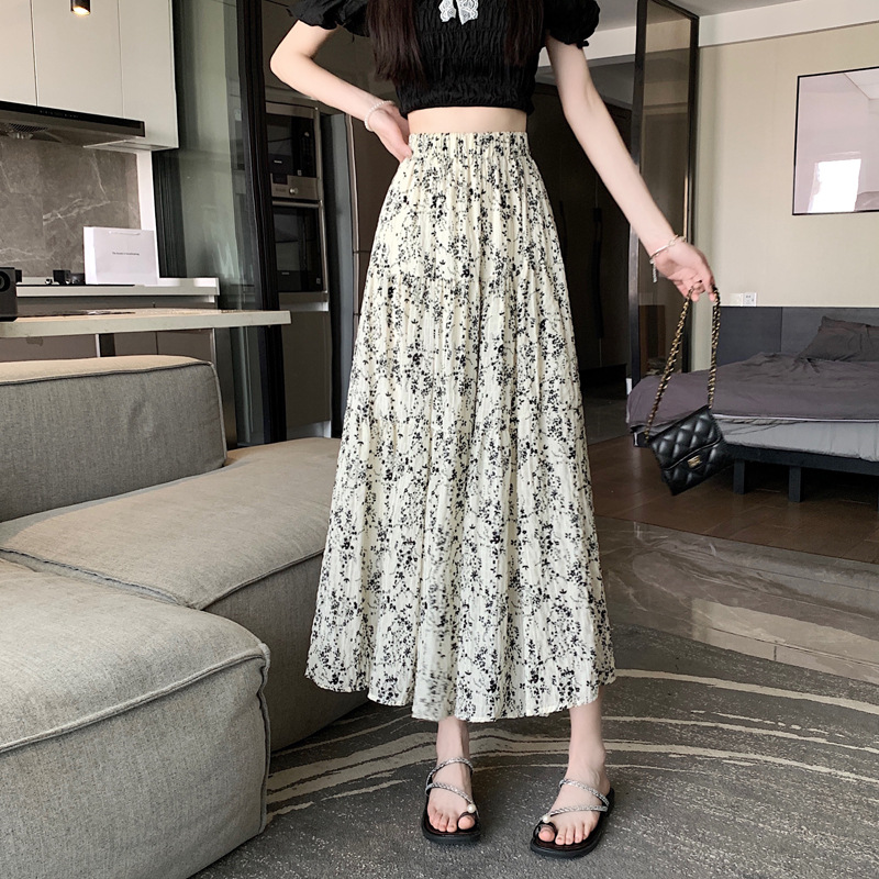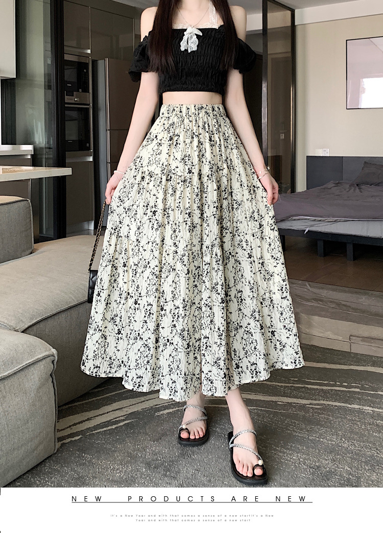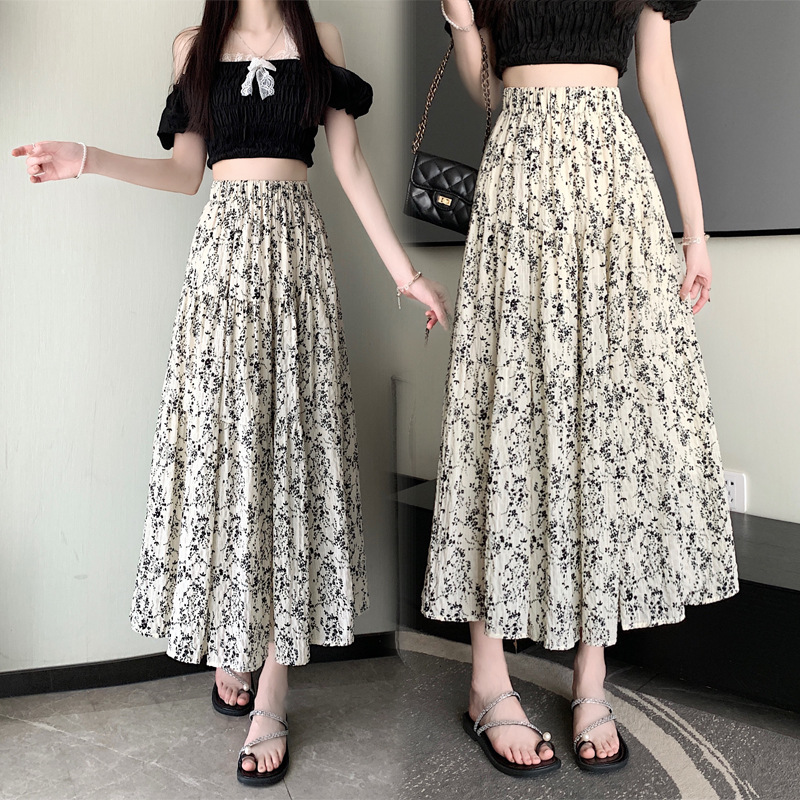 2025 봄/여름 주름 프린트 플로럴 스커트 플리츠 스커트 롱 스커트 밴딩 웨이스트 스타일리시 A라인 스커트