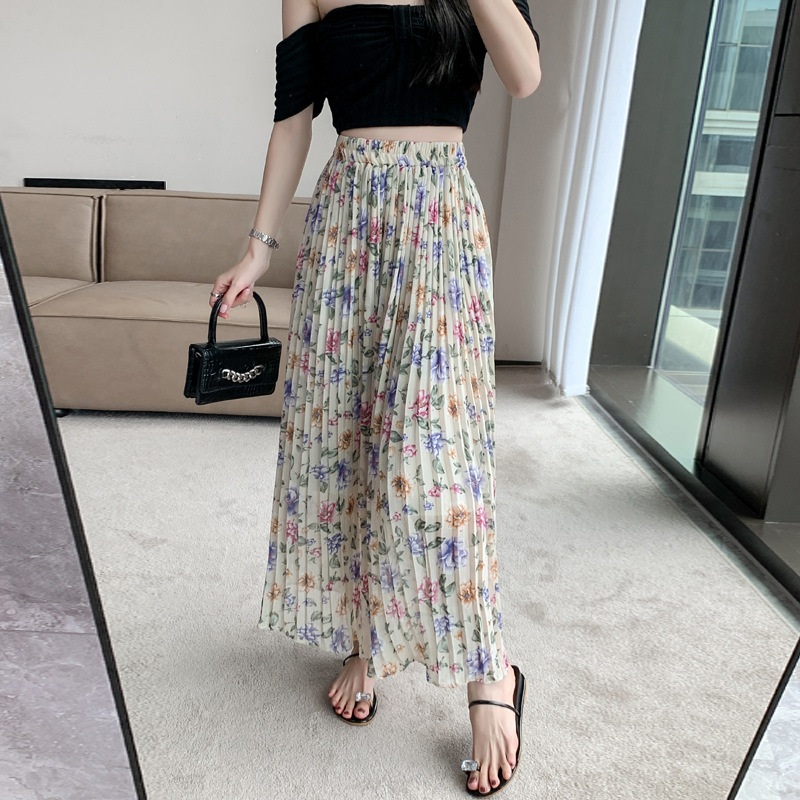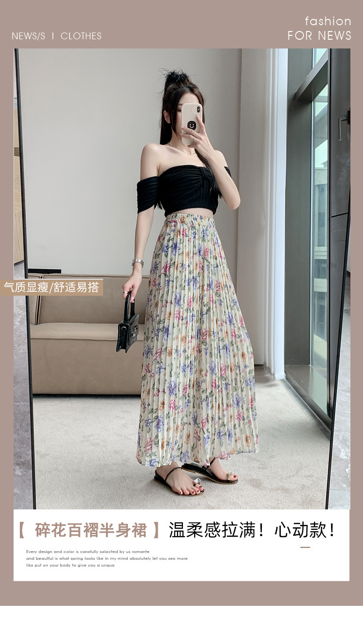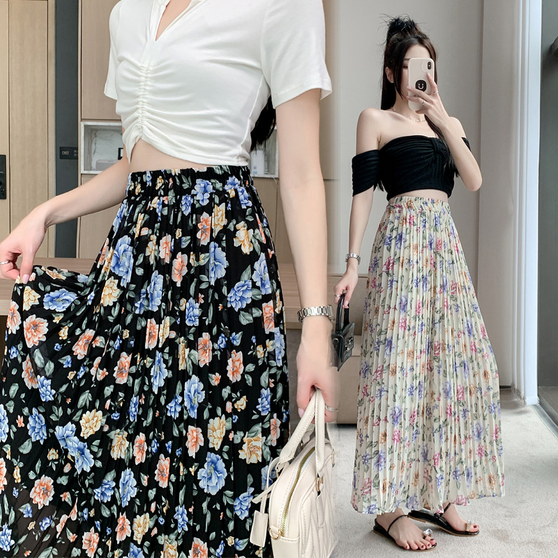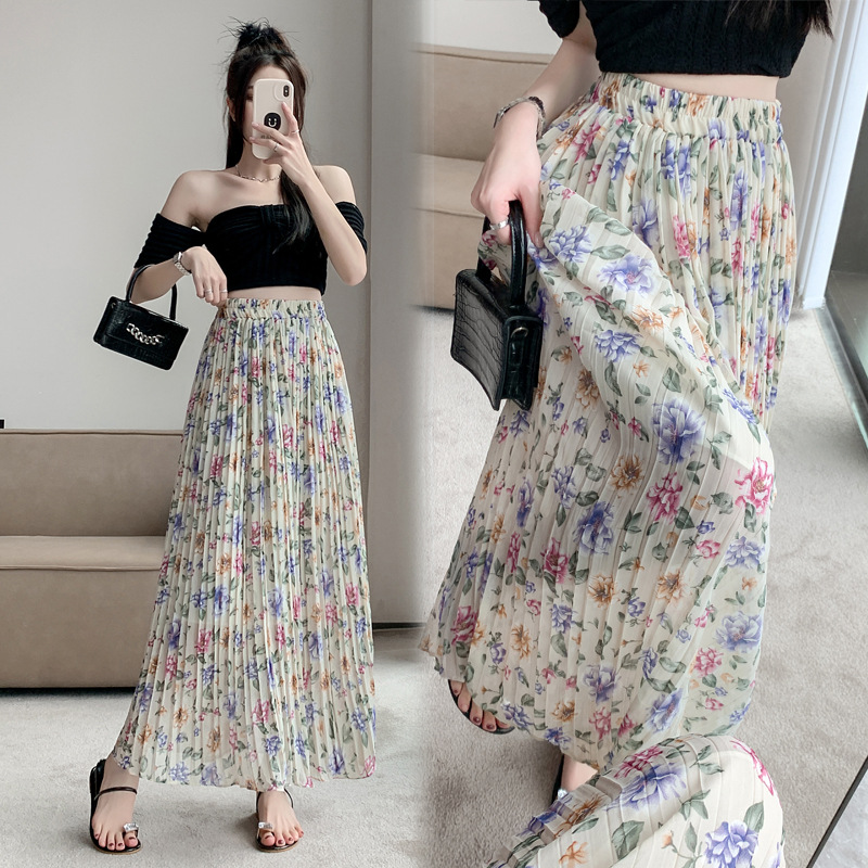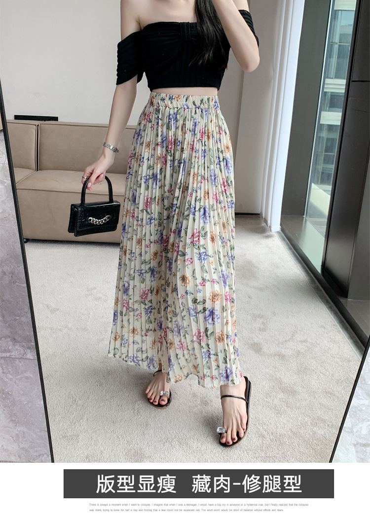 2024 봄과 여름 새로운 주름 프린트 플로럴 스커트 플리츠 스커트 하프 길이 스커트 탄성 허리 외국 스타일 A 라인 스커트스토어 가기