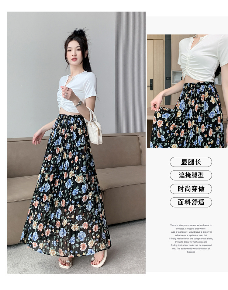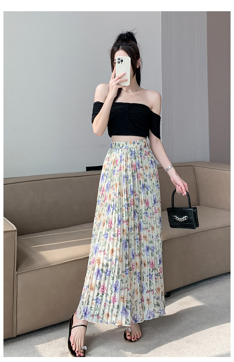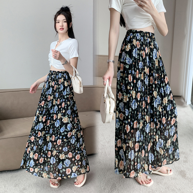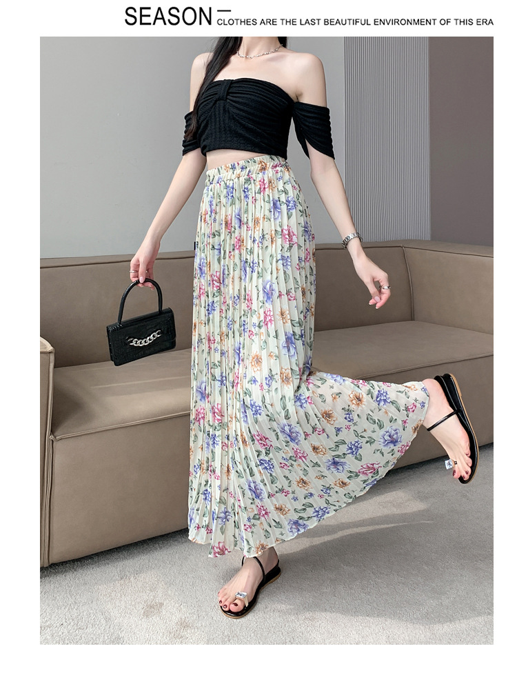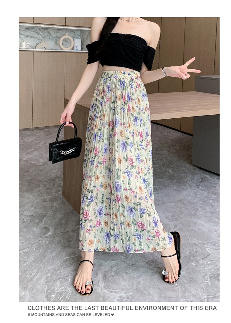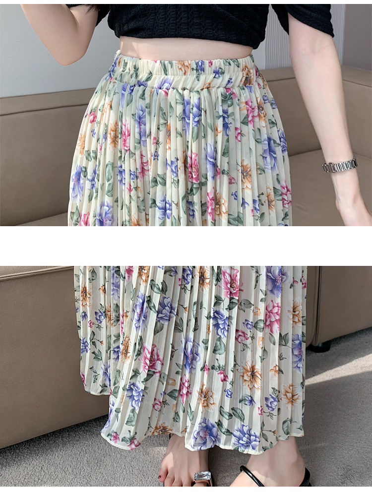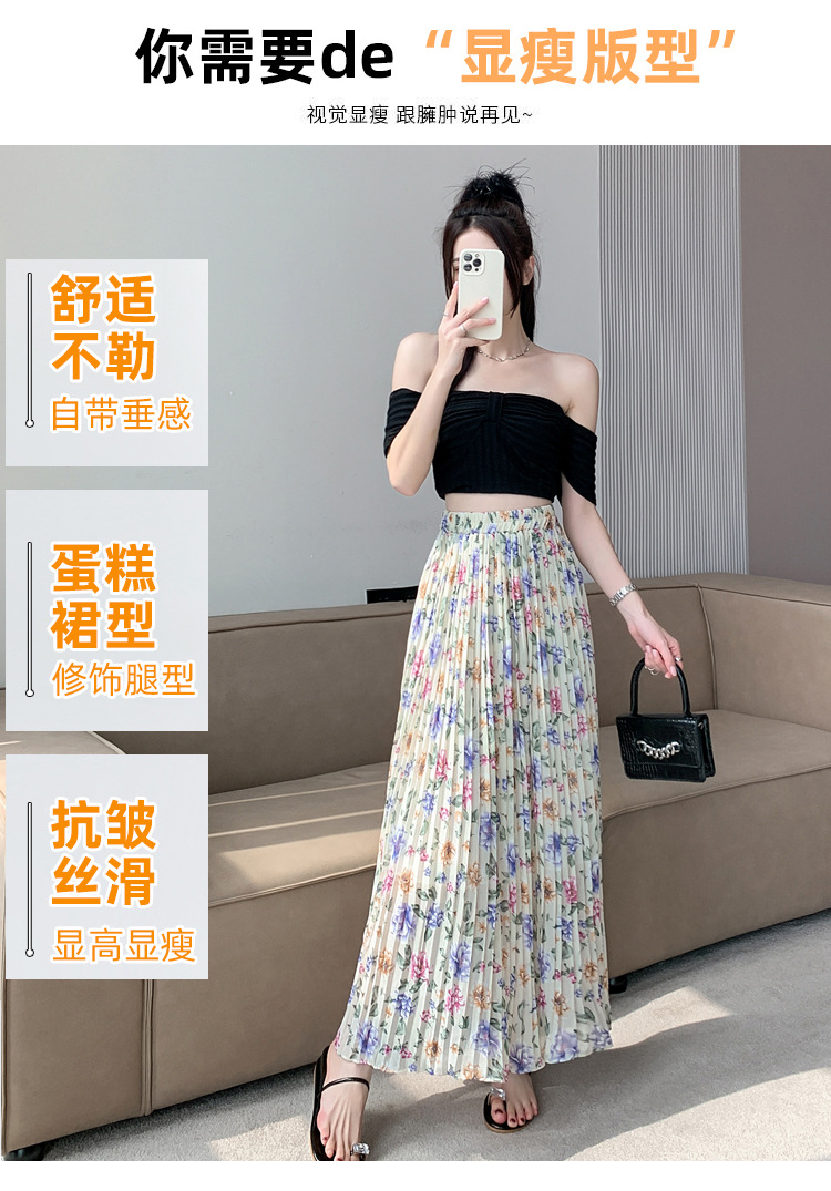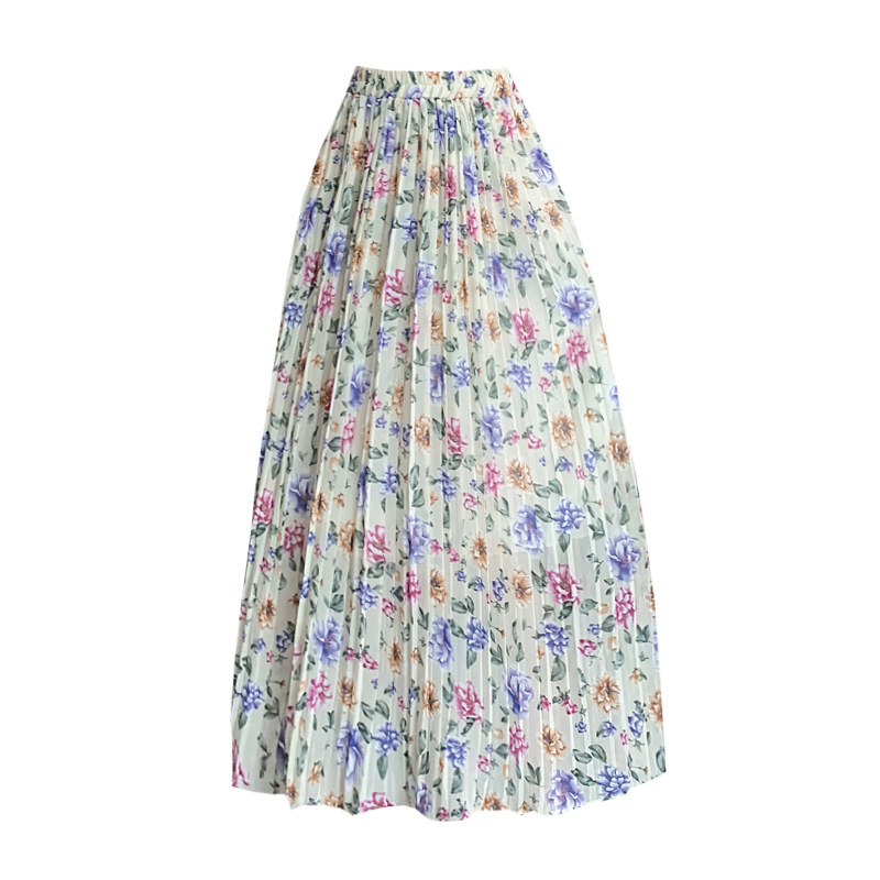 2024 봄과 여름 새로운 주름 프린트 플로럴 스커트 플리츠 스커트 하프 길이 스커트 탄성 허리 외국 스타일 A 라인 스커트