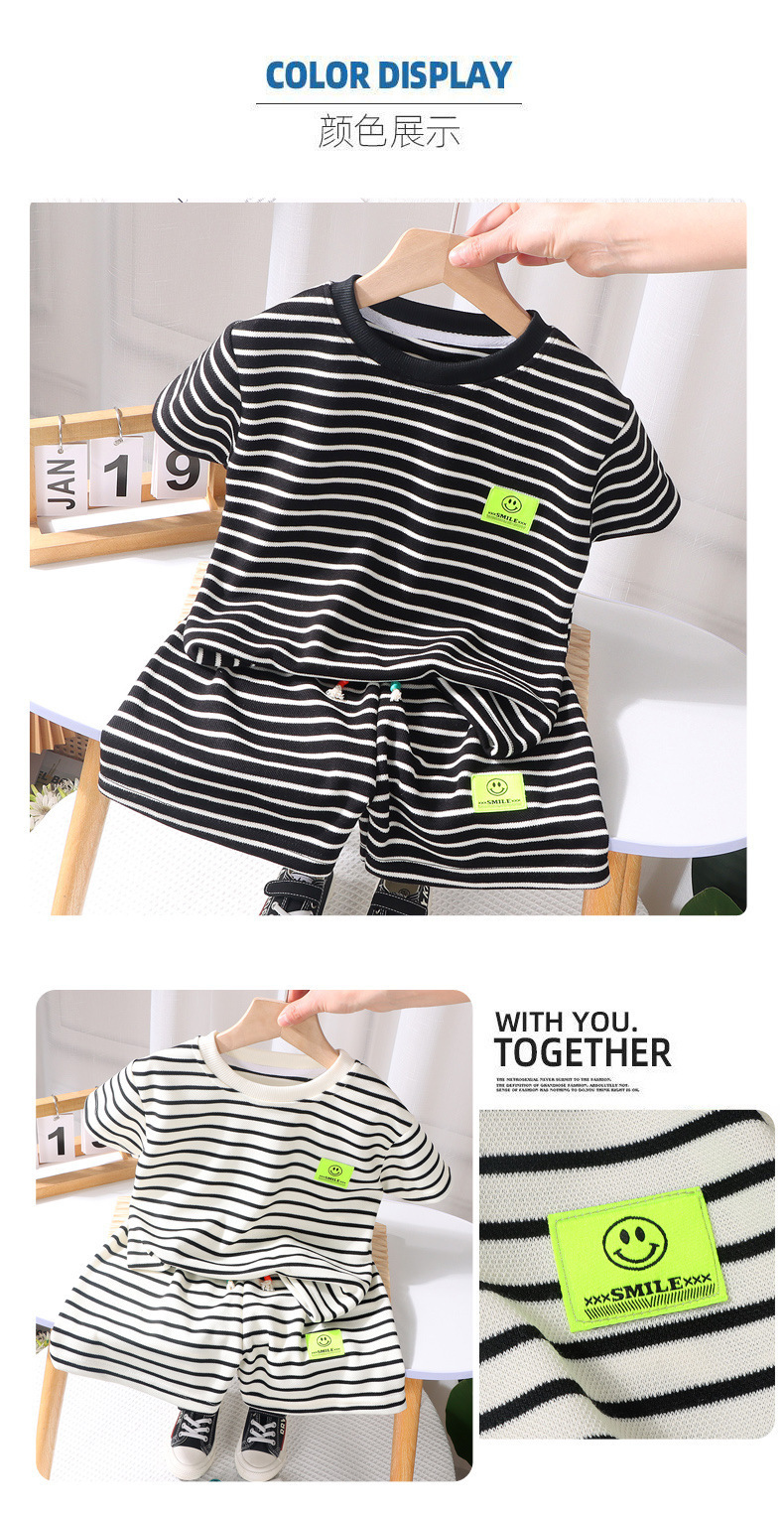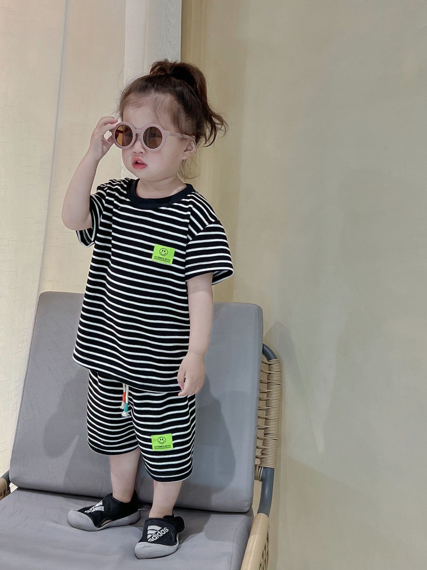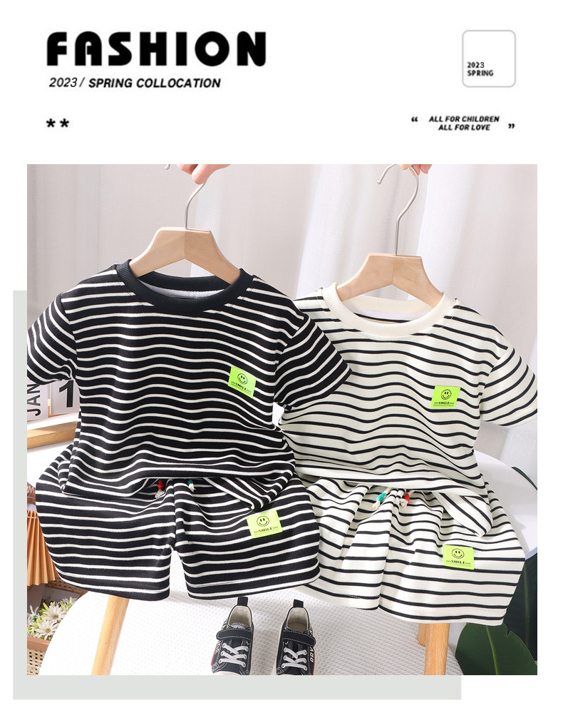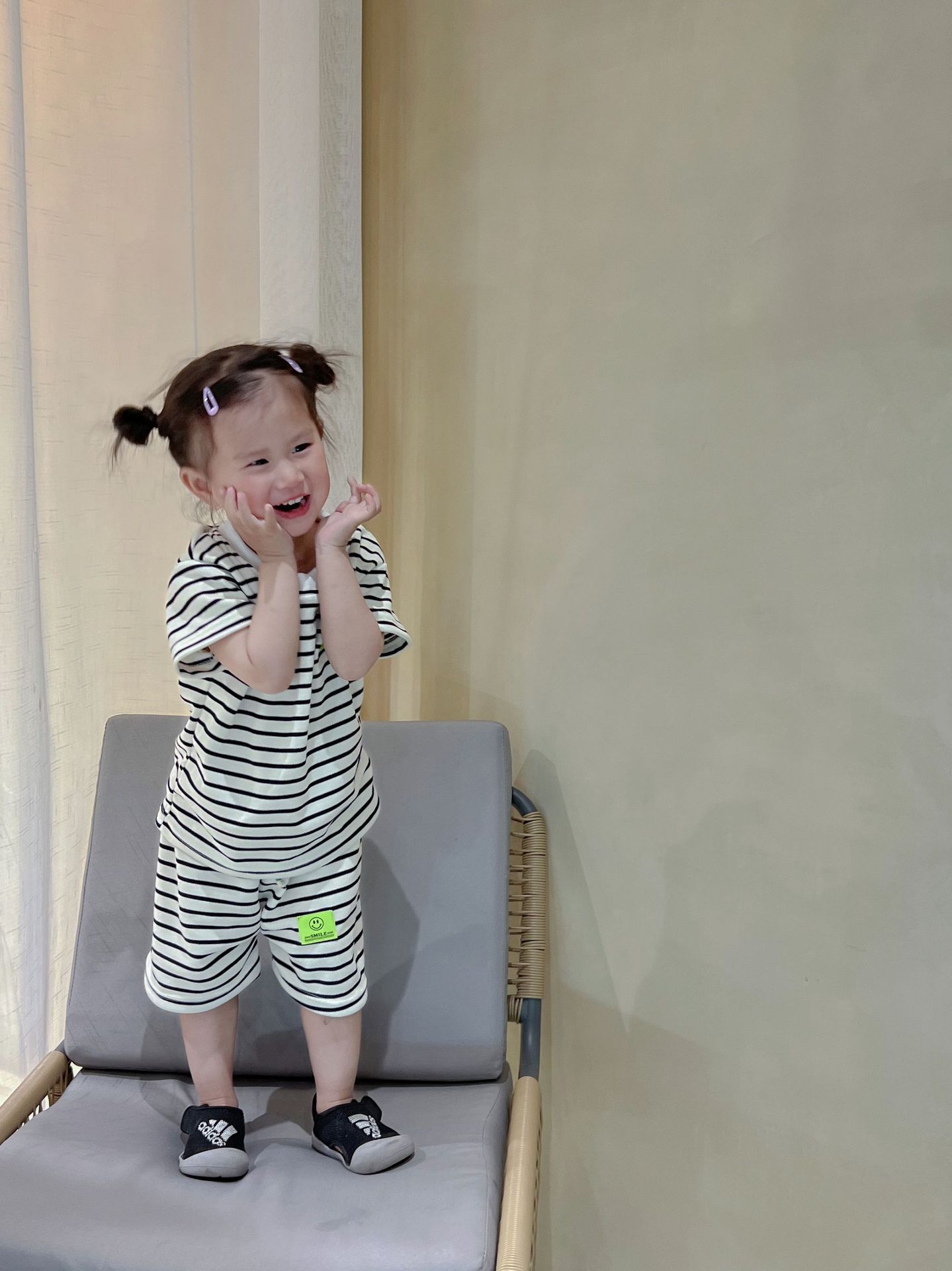 2024 여름 아동 스트라이프 반팔 세트 캐주얼 패션 티셔츠 신상 한국 스타일 홈웨어 한국 스타일 트렌디 아동복스토어 가기