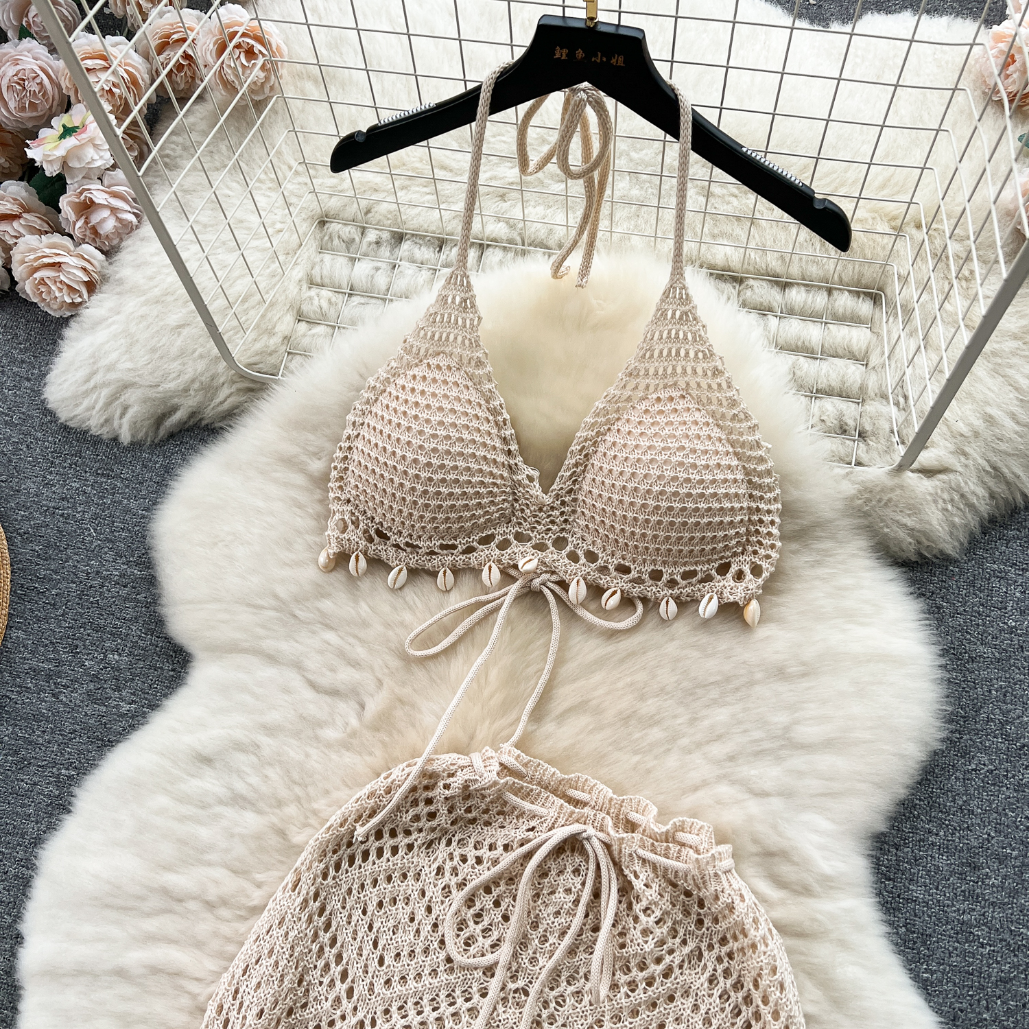 Ins 홀리데이 스타일 세트 여성 디자인 비키니 홀터 조끼 모든 경기 술 스커트 니트 투피스 세트