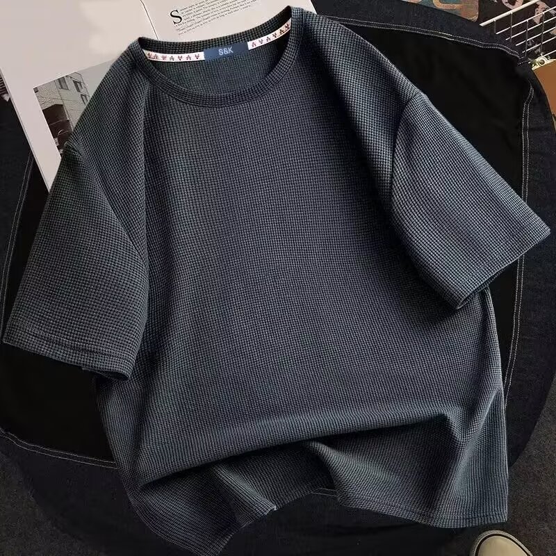 와플 질감 반소매 티셔츠 남성용 여름 줄무늬 크루 넥 2024 대형 반소매 베이스 셔츠 탑스토어 가기