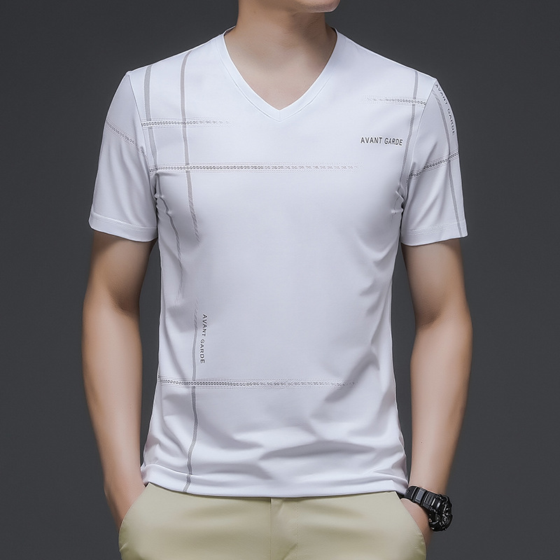 2024 년 여름 새로운 아이스 실크 반팔 티셔츠 남자 둥근 목 인쇄 얇은 한국 유행 탑 반소매 티셔츠
